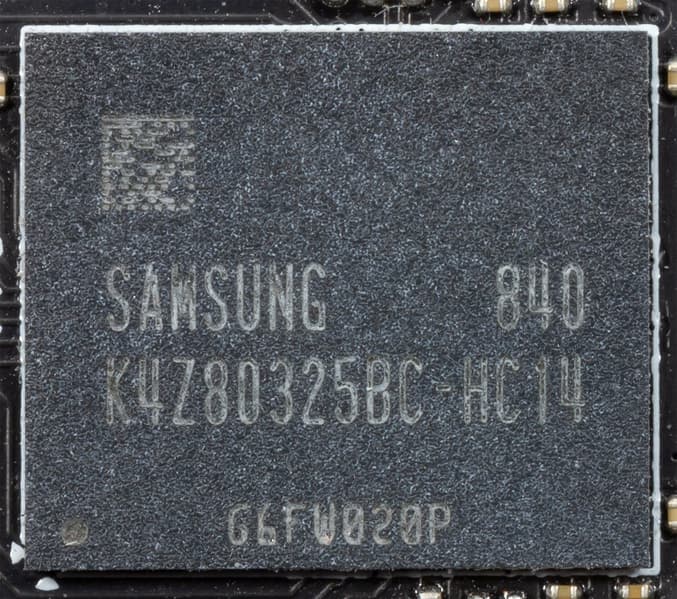 Карта имеет 11 ГБ памяти GDDR6 SDRAM, размещенной в 11 микросхемах по 8 Гбит на лицевой стороне PCB. Микросхемы памяти Samsung рассчитаны на номинальную частоту работы в 3500 (14000) МГц