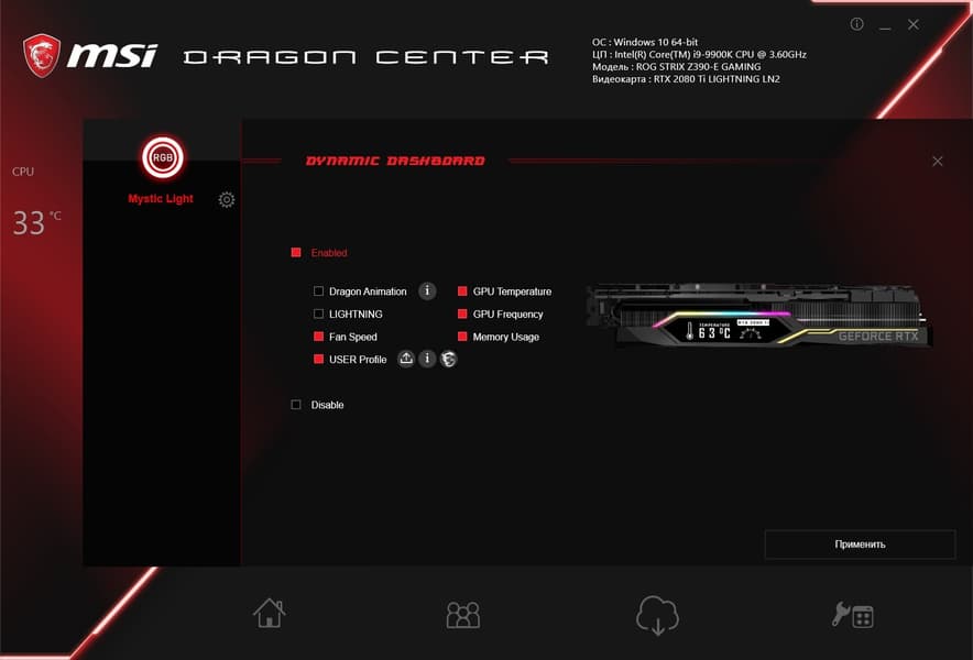 СО оснащена подсветкой, цветом которой можно управлять с помощью утилиты MSI MysticLight, ныне входящей в состав Dragon Center.