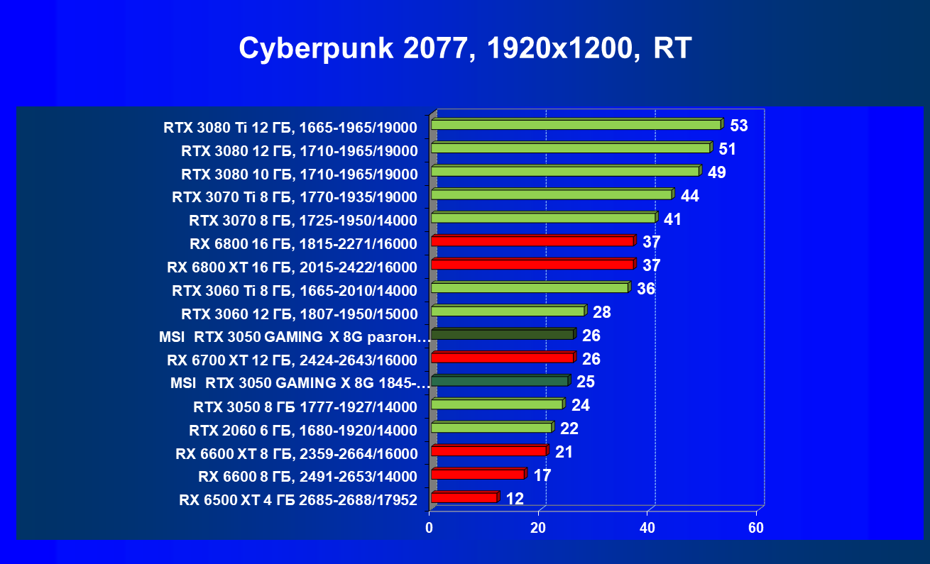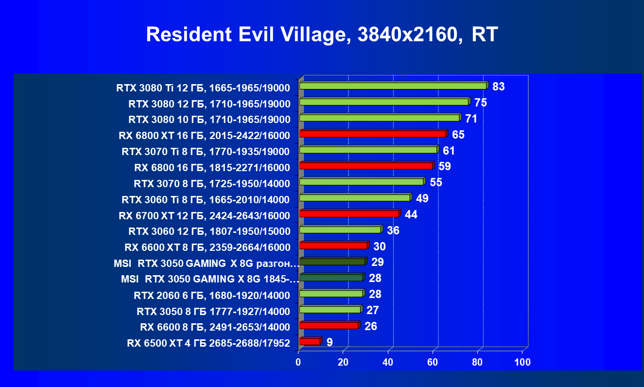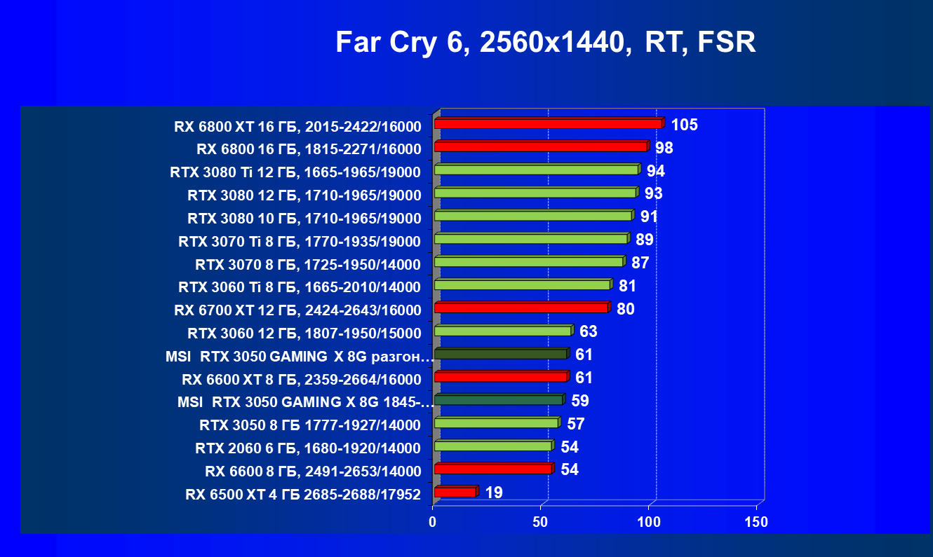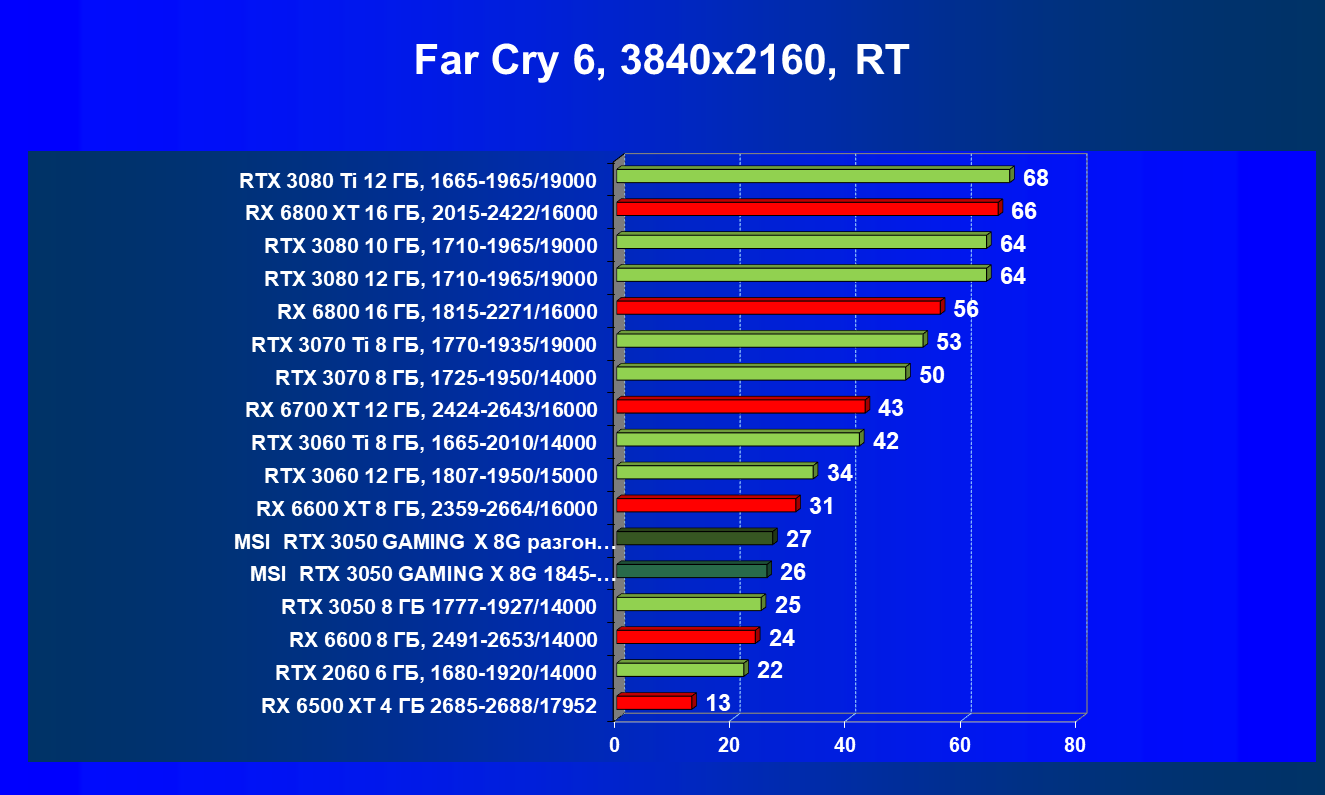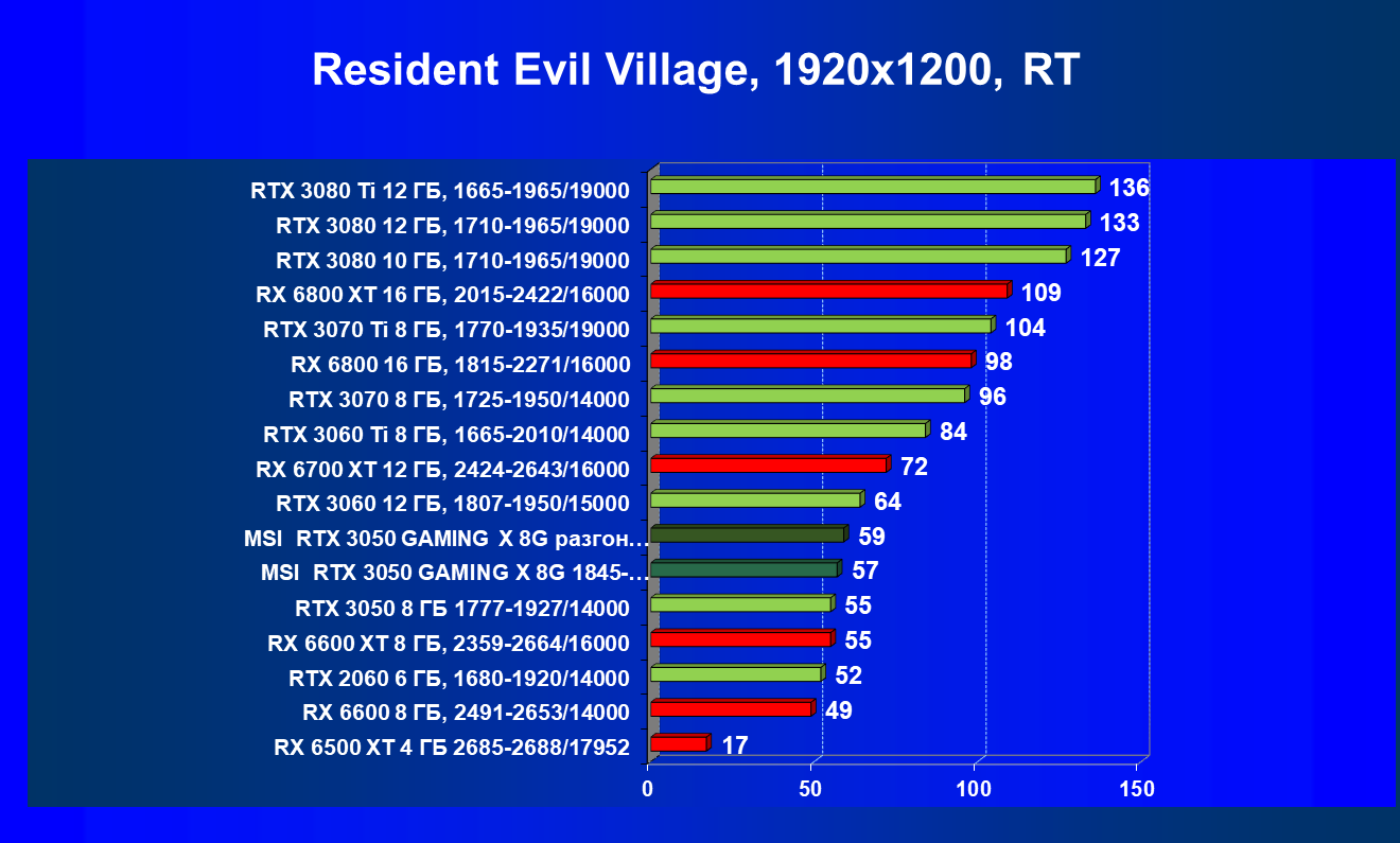 Хорошо видно, что в целом Radeon RX 6600 немного быстрее, чем RTX 3050, и лишь ручной разгон карты MSI позволил ей догнать соперника. Фабричный же разгон карты MSI дает меньшие дивиденты.