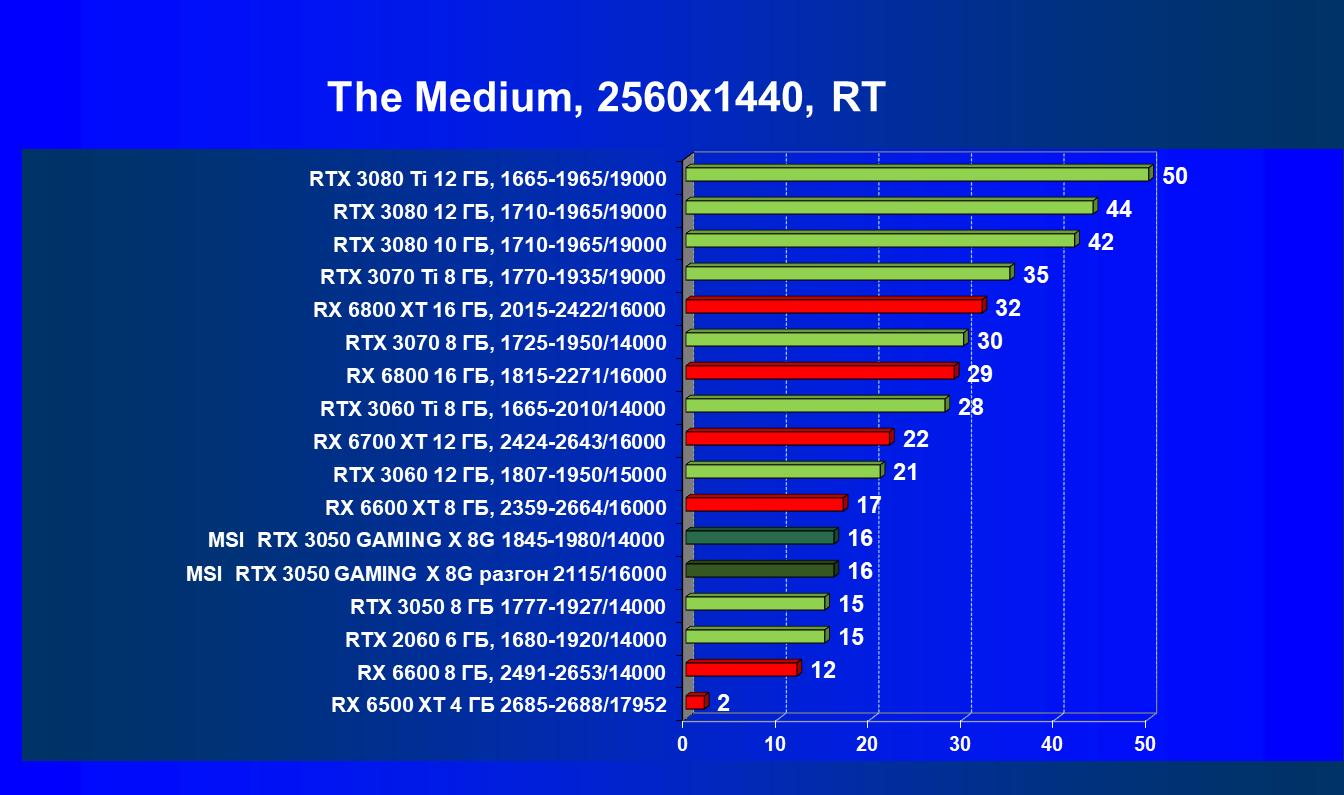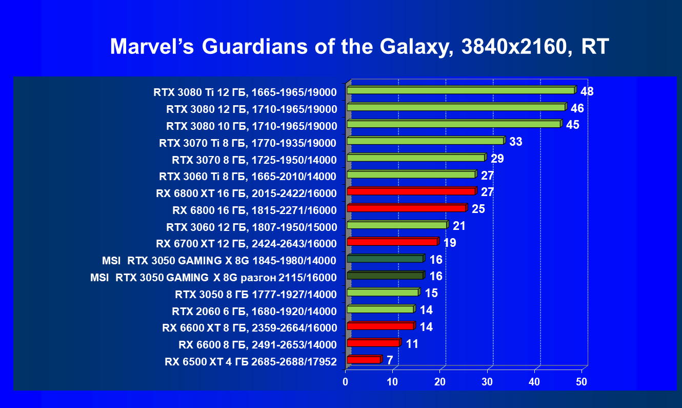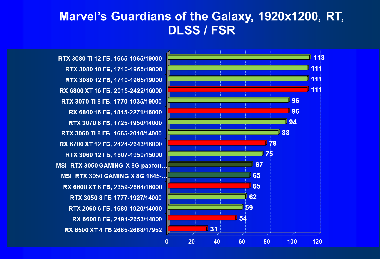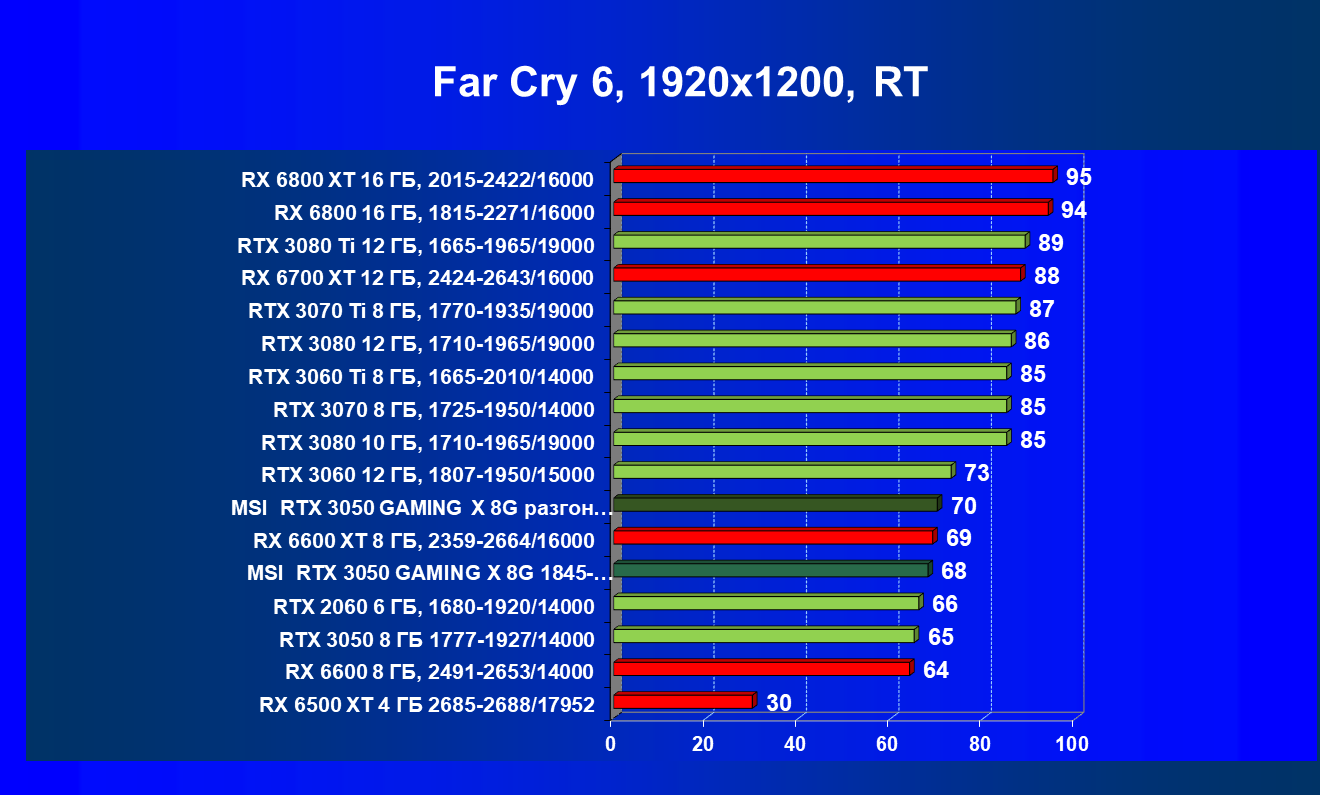 Хорошо видно, что в целом Radeon RX 6600 немного быстрее, чем RTX 3050, и лишь ручной разгон карты MSI позволил ей догнать соперника. Фабричный же разгон карты MSI дает меньшие дивиденты.