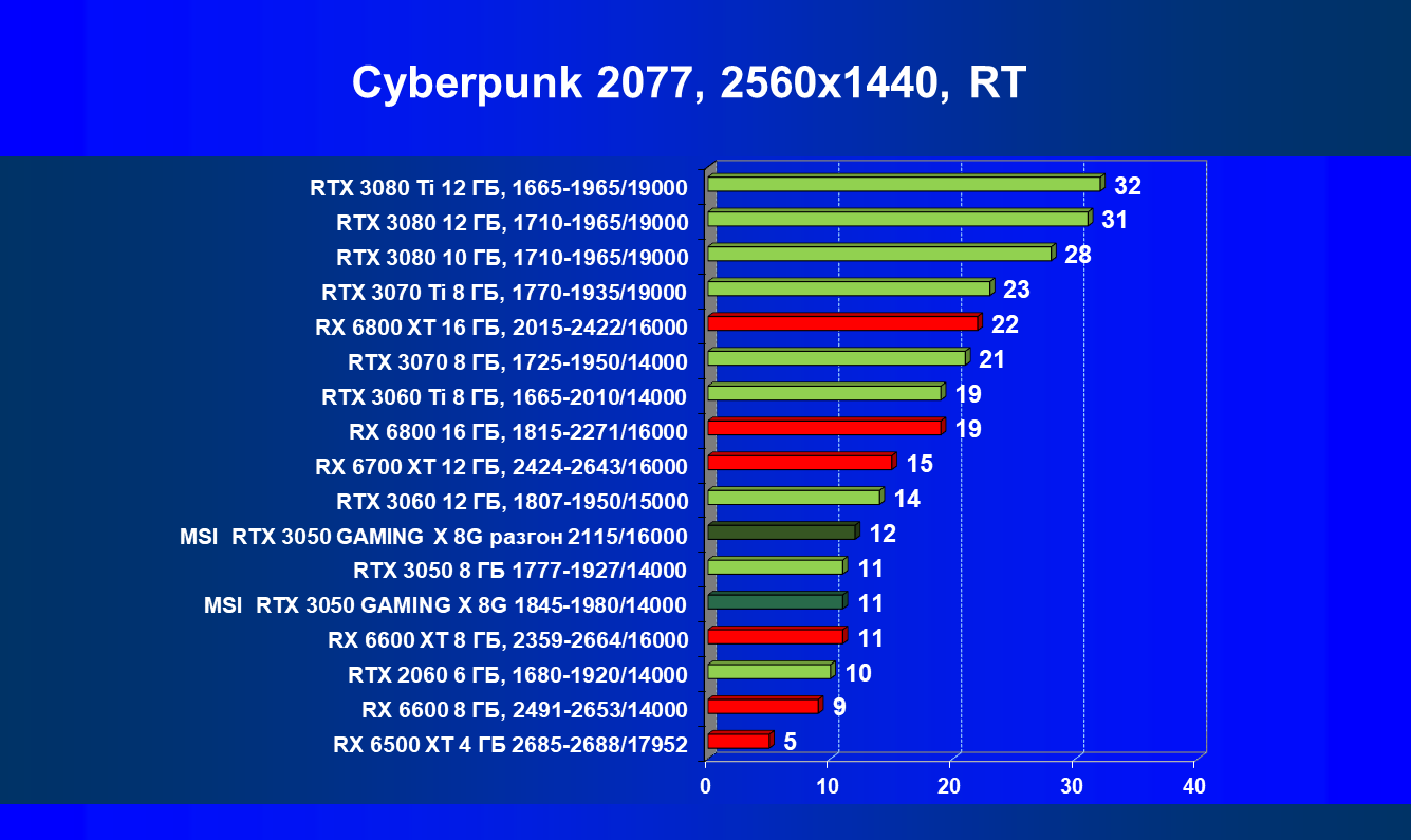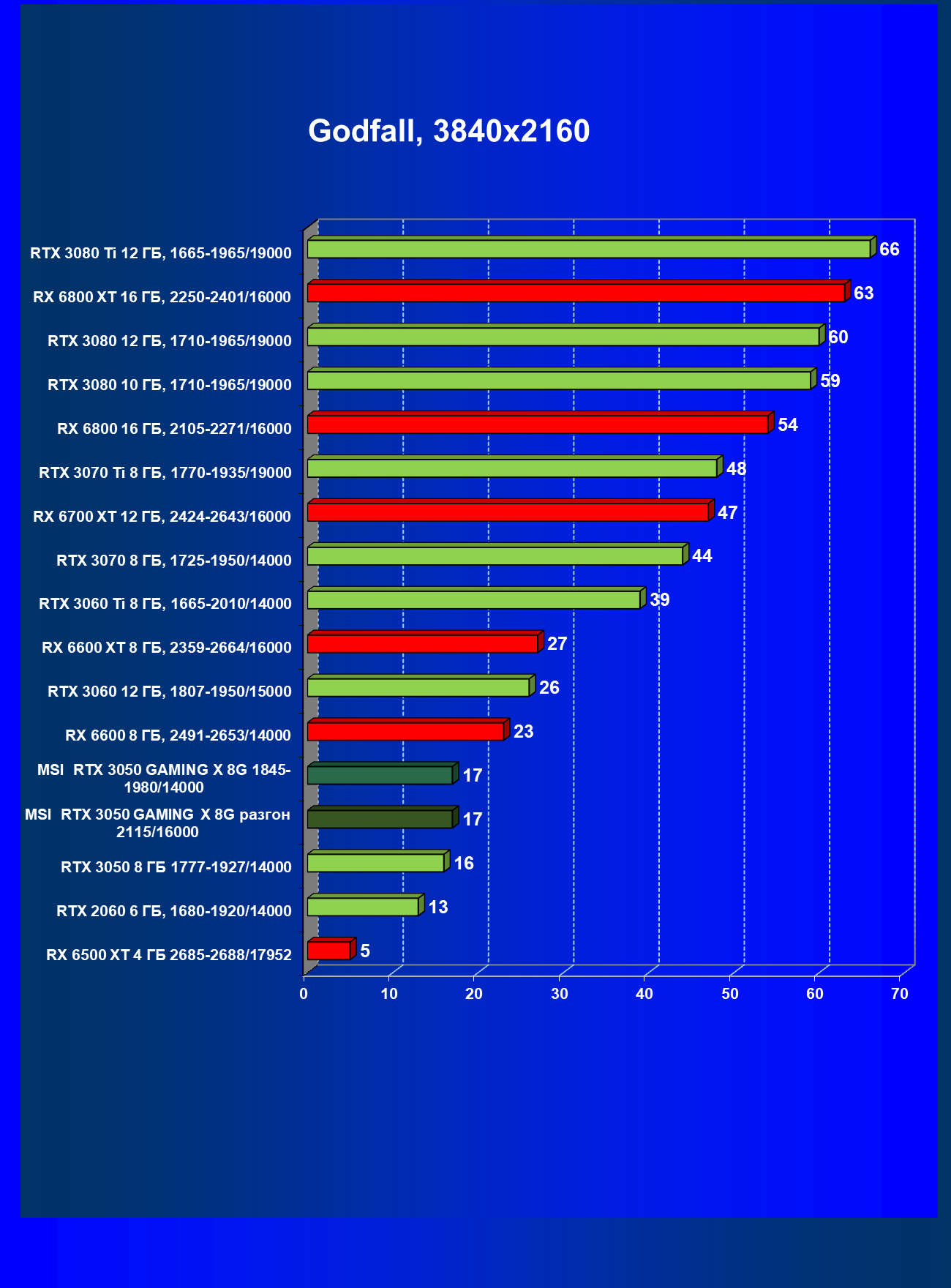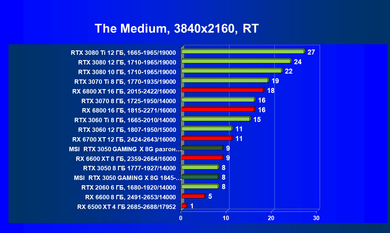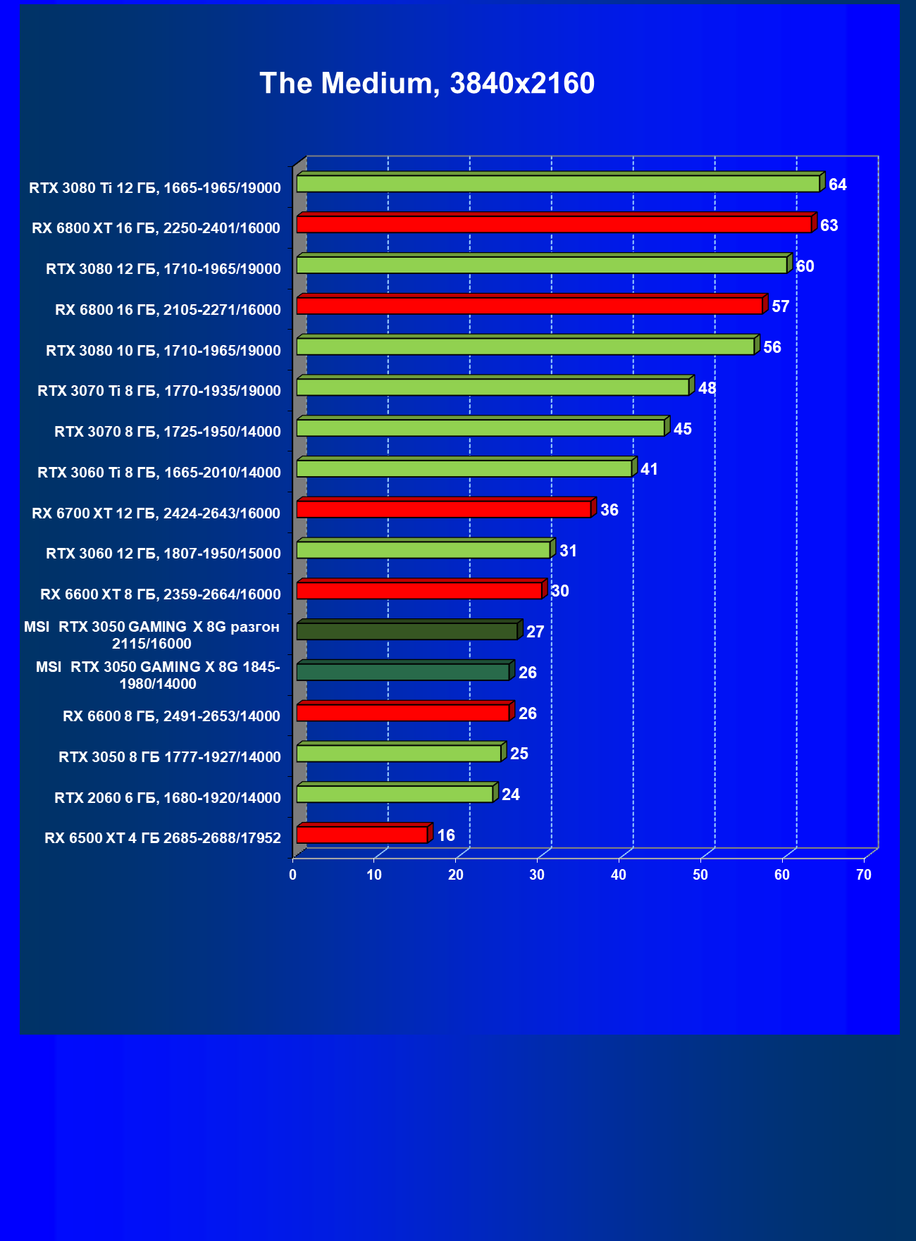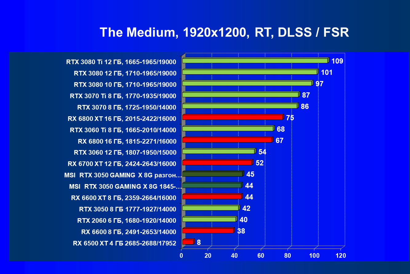 Хорошо видно, что в целом Radeon RX 6600 немного быстрее, чем RTX 3050, и лишь ручной разгон карты MSI позволил ей догнать соперника. Фабричный же разгон карты MSI дает меньшие дивиденты.