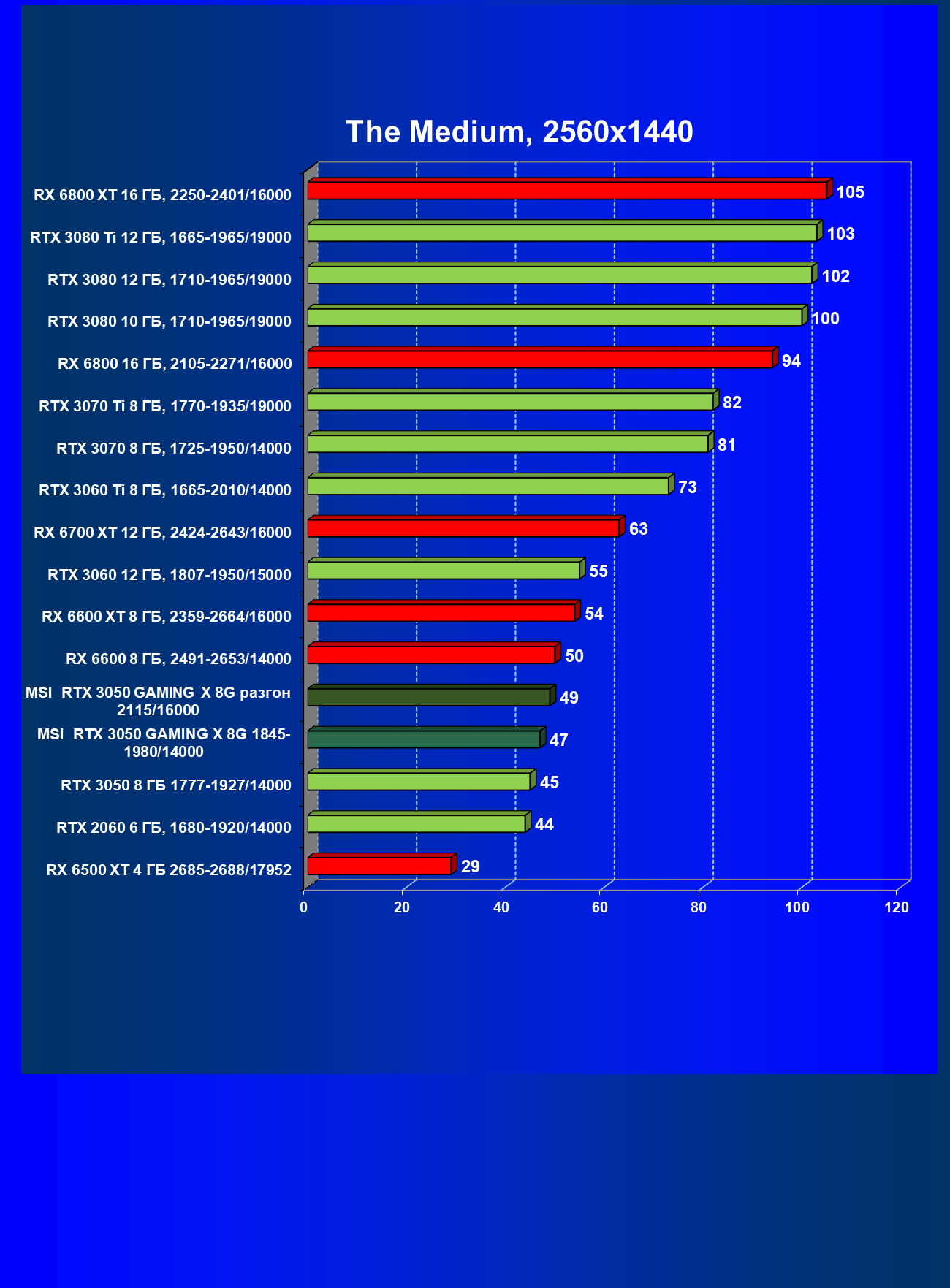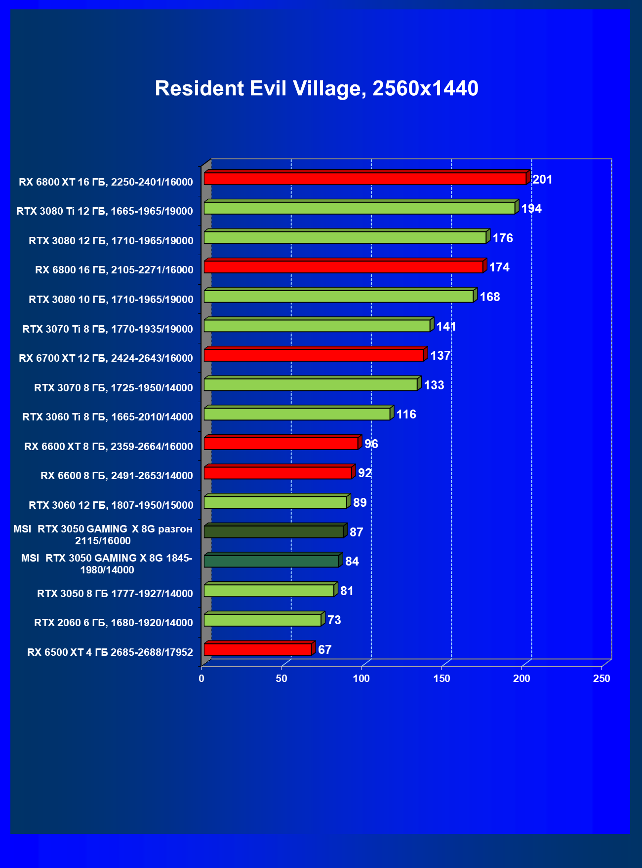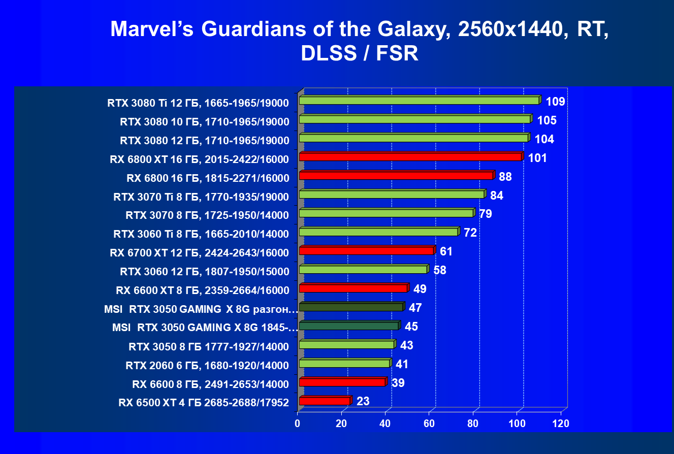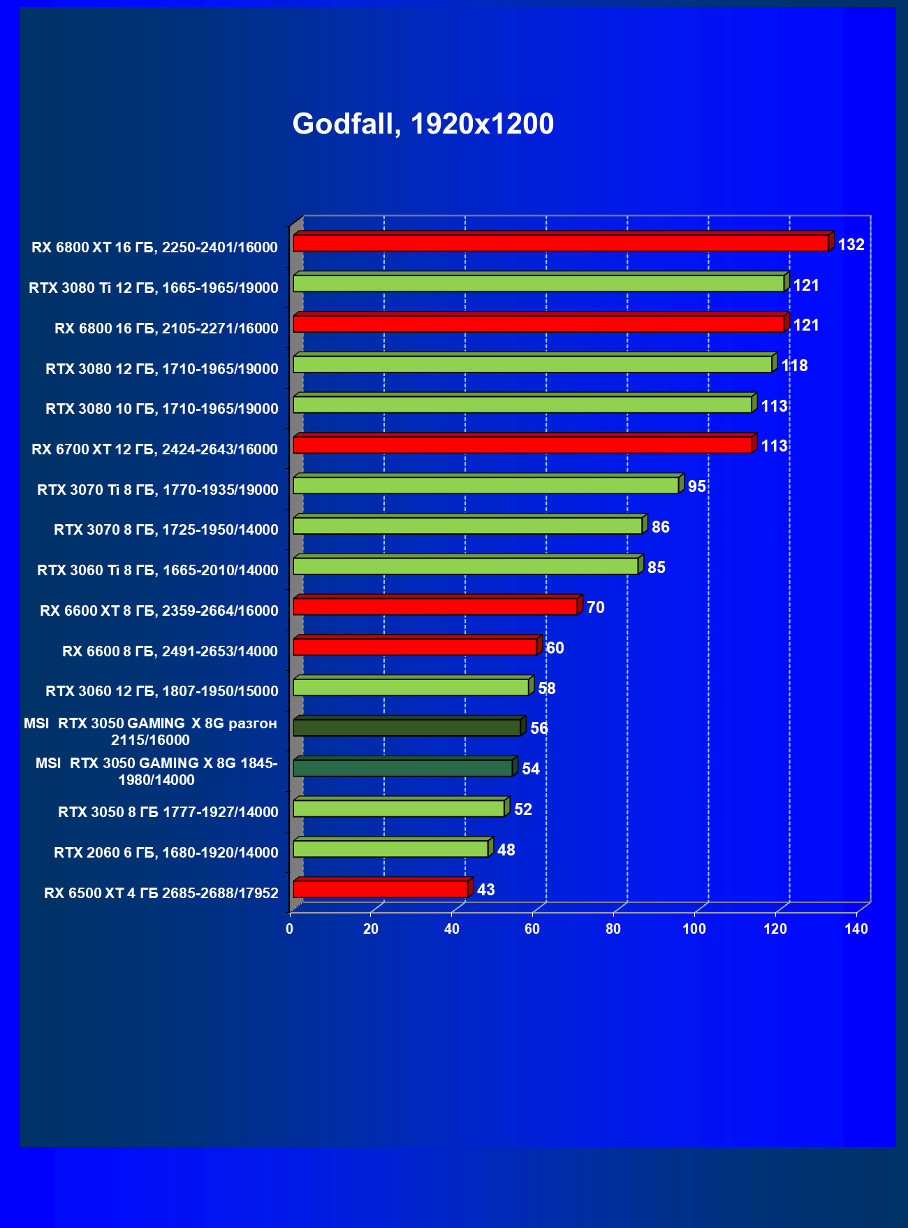 Хорошо видно, что в целом Radeon RX 6600 немного быстрее, чем RTX 3050, и лишь ручной разгон карты MSI позволил ей догнать соперника. Фабричный же разгон карты MSI дает меньшие дивиденты.