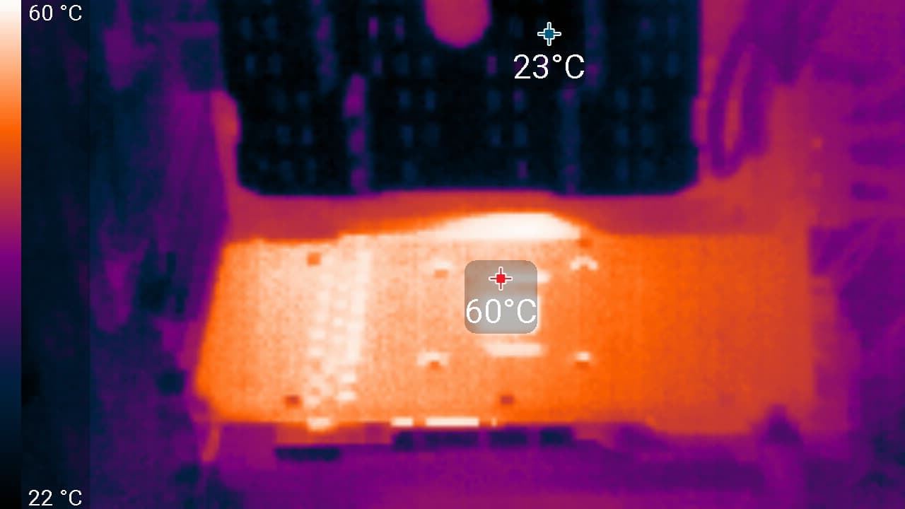 В режиме максимальной нагрузки в 3D температура достигала 63 °C. Вентиляторы при этом раскручивались до 1200 оборотов в минуту, шум вырастал всего лишь до 22 дБА: это очень тихо.