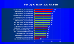 Рейтинг составлен по 9 тестам, где используется технология трассировки лучей и где одновременно присутствуют Nvidia DLSS и AMD FSR. Этот рейтинг нормирован по самому слабому ускорителю в данной группе — Radeon RX 6500 XT (то есть сочетание скорости и функций Radeon RX 6500 XT приняты за 100%).