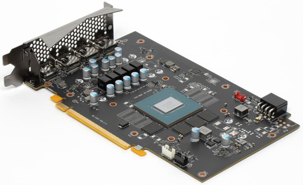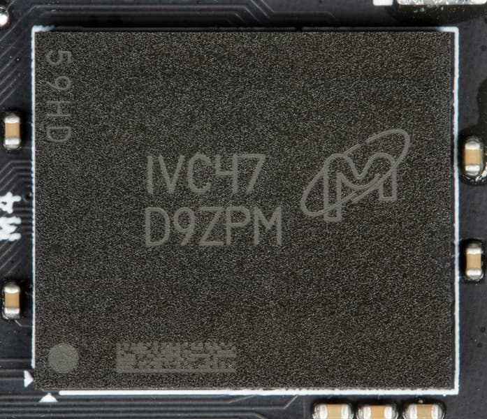 Карта имеет 8 ГБ памяти GDDR6 SDRAM, размещенной в 4 микросхемах по 16 Гбит на лицевой стороне PCB. Микросхемы памяти Micron (GDDR6) рассчитаны на условную номинальную частоту работы в 3500 (14000) МГц.