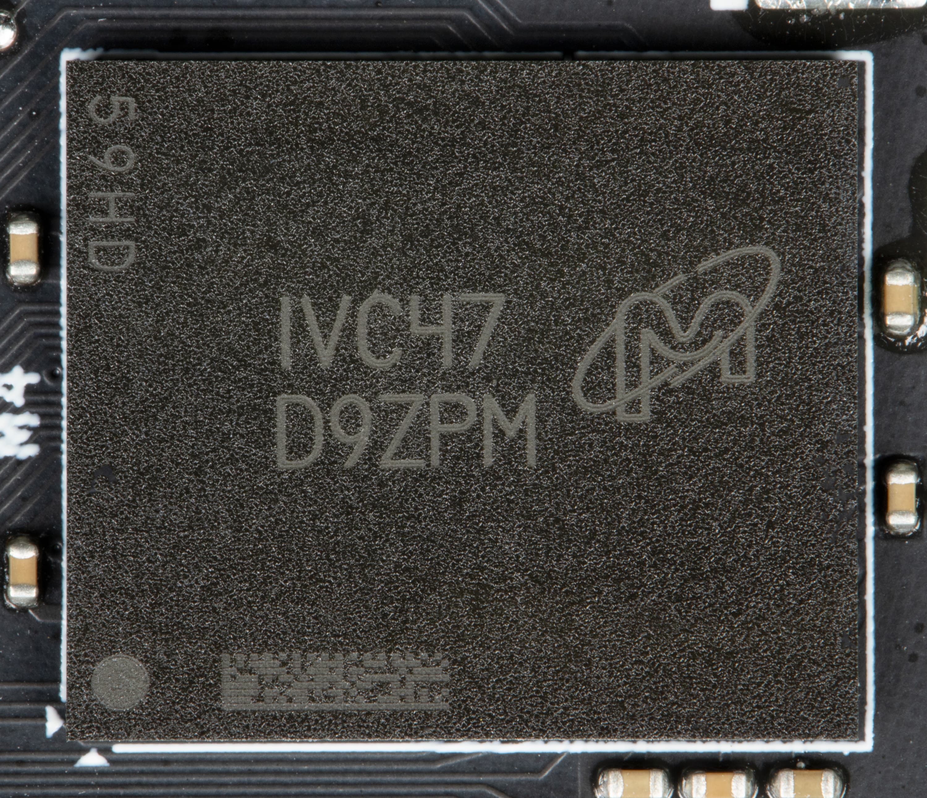 На лицевой стороне карточки имеется ШИМ-контроллер uP1666Q (uPI Semiconductor), который управляет однофазной схемой питания четырех микросхем памяти.