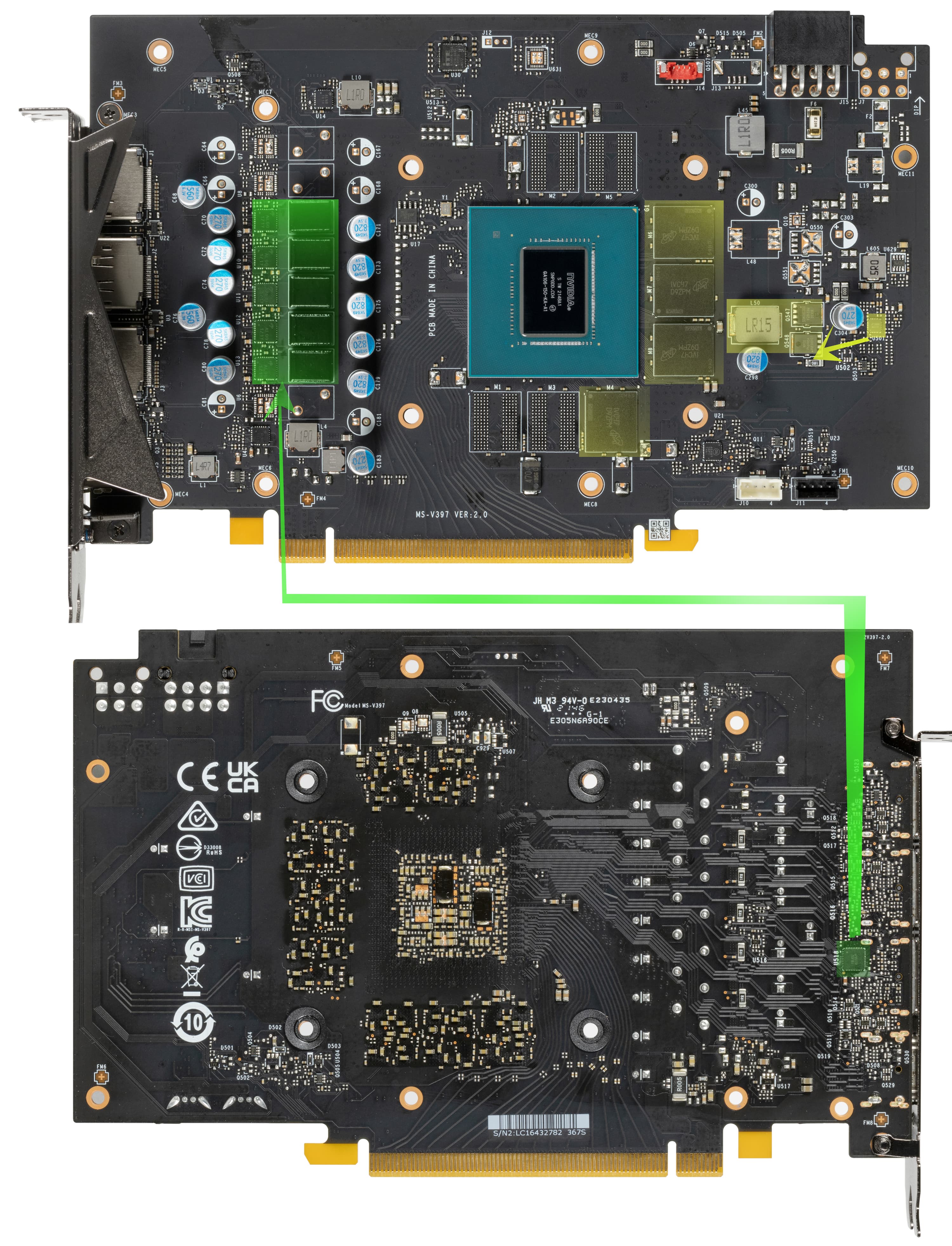Зеленым отмечены фазы питания и ШИМ-контроллер на плате видеокарты MSI GeForce RTX 3050 Gaming X 8G в схеме питания графического процессора, а желтым — фазы и контроллер питания микросхем памяти.