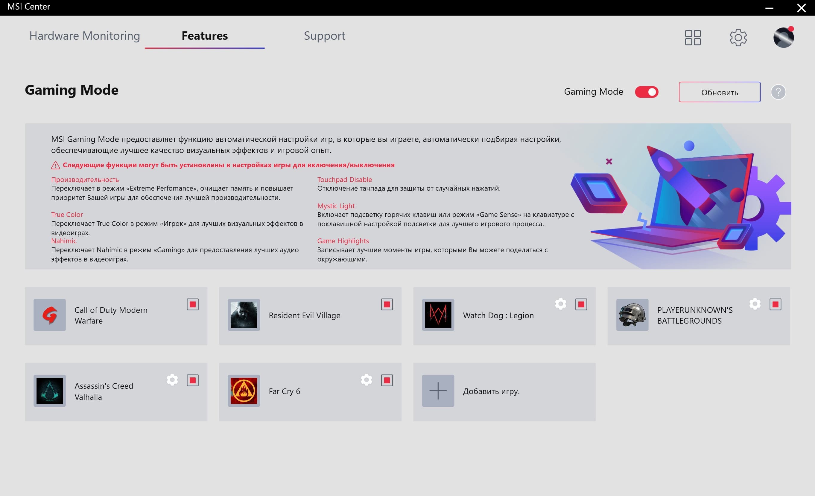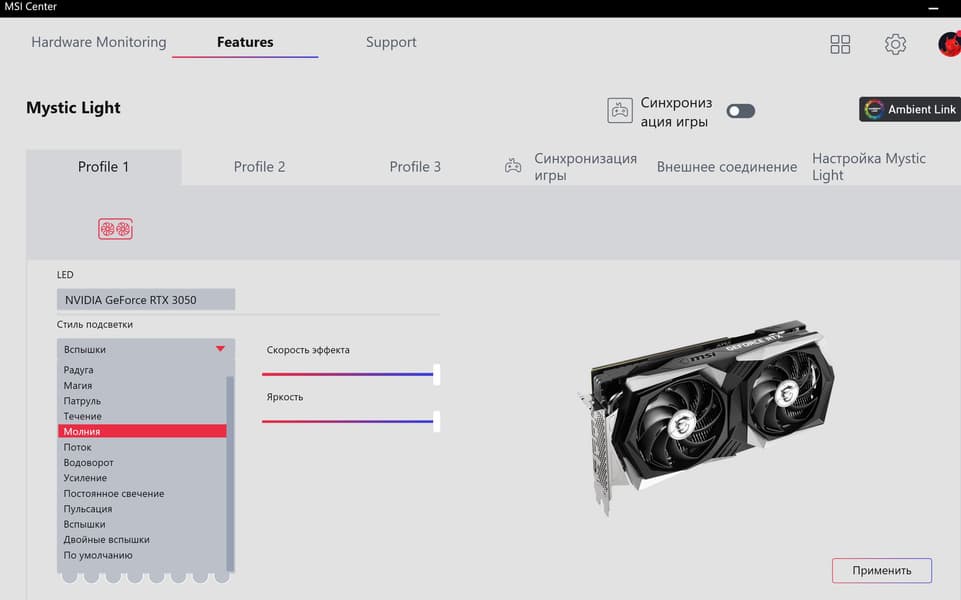 Утилита Mystic Light из MSI Center позволяет с легкостью управлять полноцветной подсветкой всех совместимых устройств MSI.