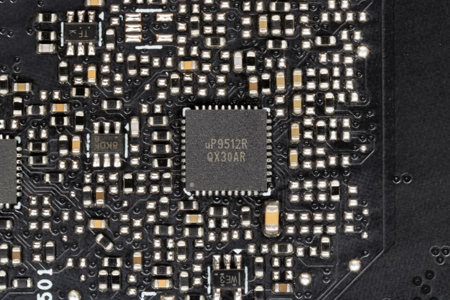 В преобразователе питания, традиционно для всех видеокарт Nvidia, используются транзисторные сборки DrMOS — в данном случае NCP302150 (On Semiconductor), каждая из который рассчитана максимально на 50 А (суммарно система питания способна «переварить» до 800 А, и понятно, что даже GeForce RTX 3090 с ее 24 микросхемами GDDR6X не дотянет до таких величин).