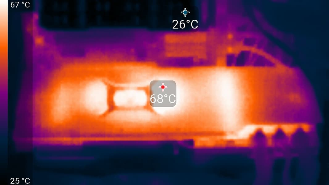 Максимальный нагрев наблюдался в центральной части PCB, в основном около ядра (и основным источником нагрева является память). Но также стоит обратить внимание на три разъема питания: все они весьма сильно нагреваются, особенно тот, что ближе к центру платы.
