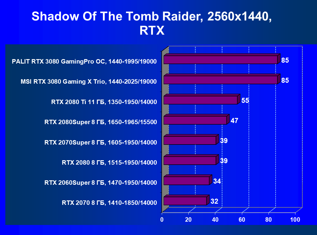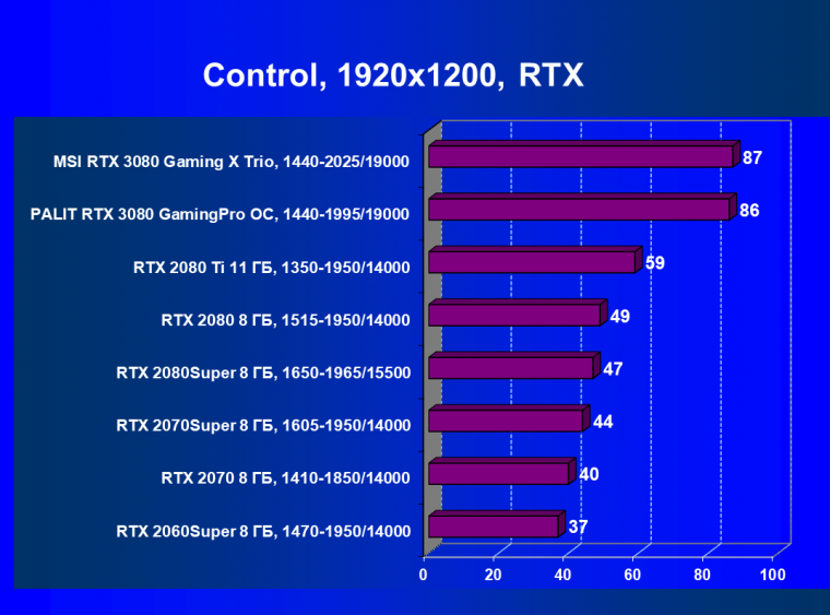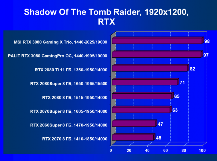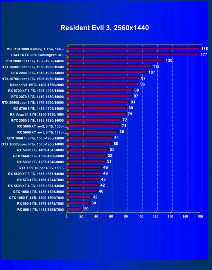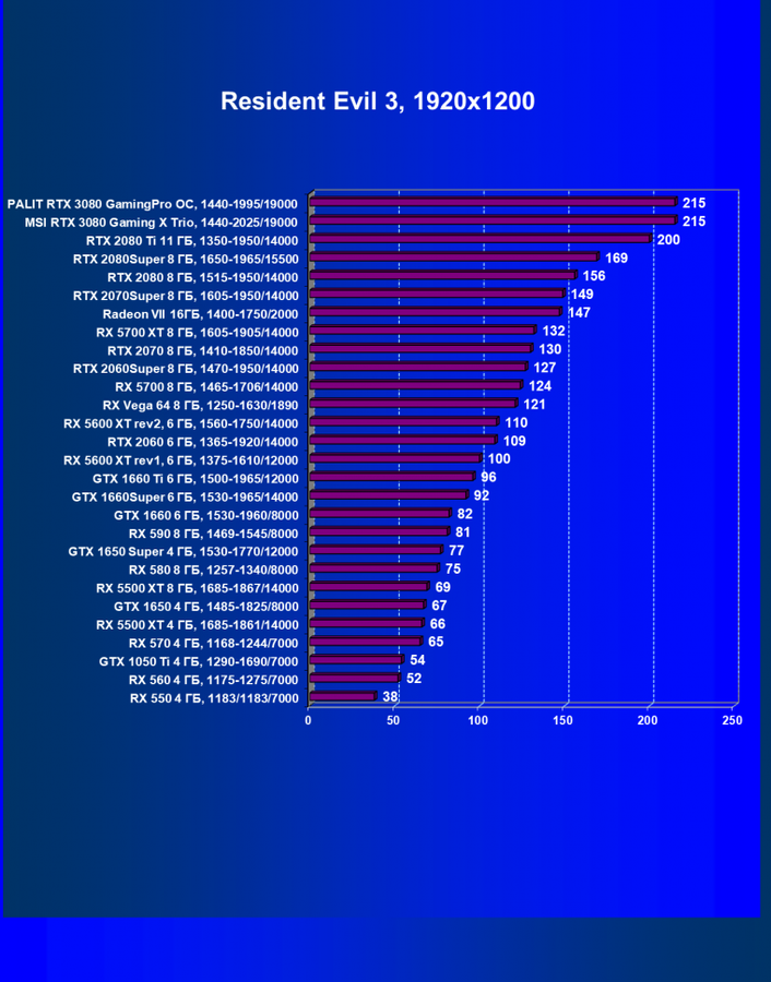 Полагаем, что комментарии излишни: лидер — он и есть лидер. Конечно, мы не сбрасываем со счетов GeForce RTX 3090, однако этот ускоритель не является чисто игровым и стоить должен, по первым прикидкам, еще вдвое дороже, поэтому напрямую их сравнивать тяжело.