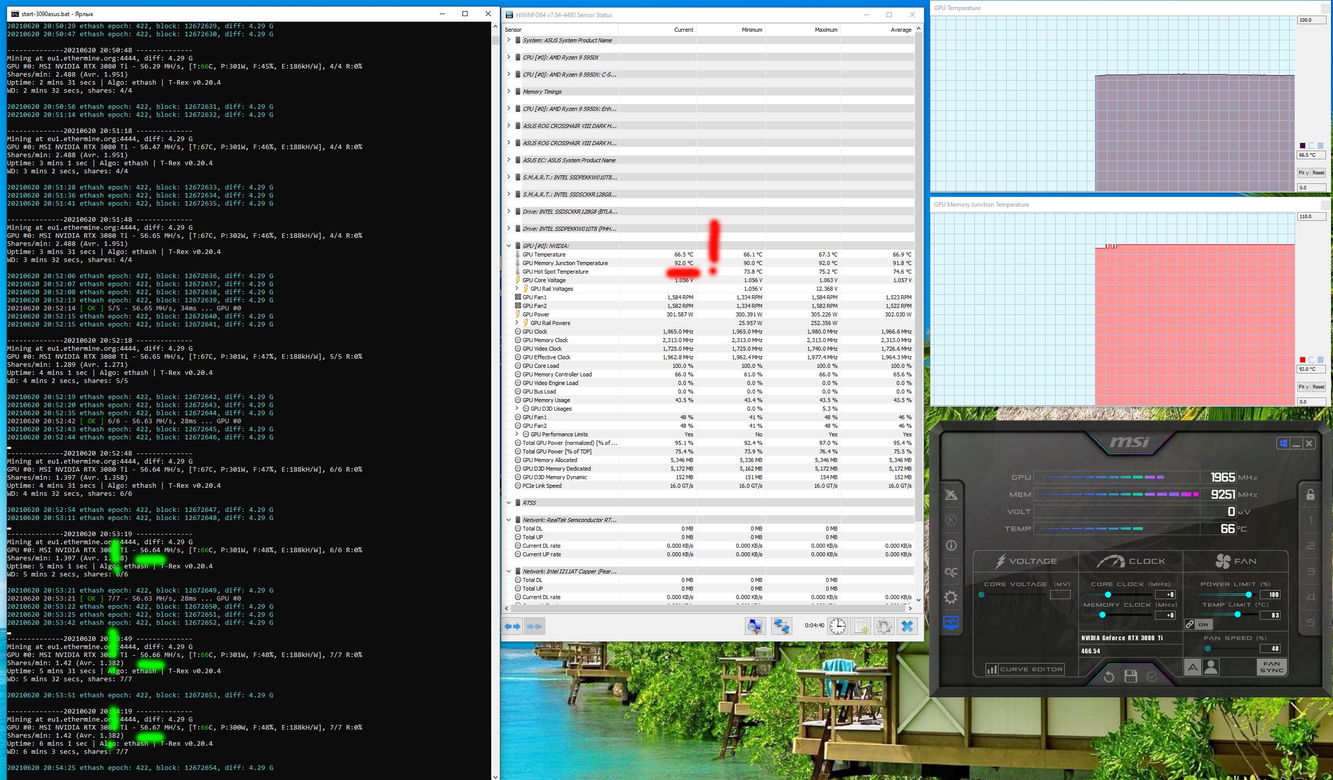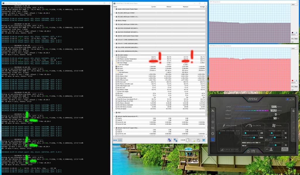 Оптимизация настроек работы видеокарт под майнинг в нашем случае не предусматривает сильного разгона видеопамяти, также обязательным является внешний обдув видеокарт. Особо тщательно надо следить за нагревом GDDR6X у GeForce RTX 3080/3090, ибо максимум для этой памяти — 110 градусов, и она долго не проживет, постоянно работая в условиях нагрева выше 100 °C. В нашем случае после оптимизации параметров работы карты и принудительного улучшения охлаждения нагрев памяти в майнинге по алгоритму ethash не превышал 82 градусов, но в случае с kawpow нагрев памяти все же вырастал до 90 °C.