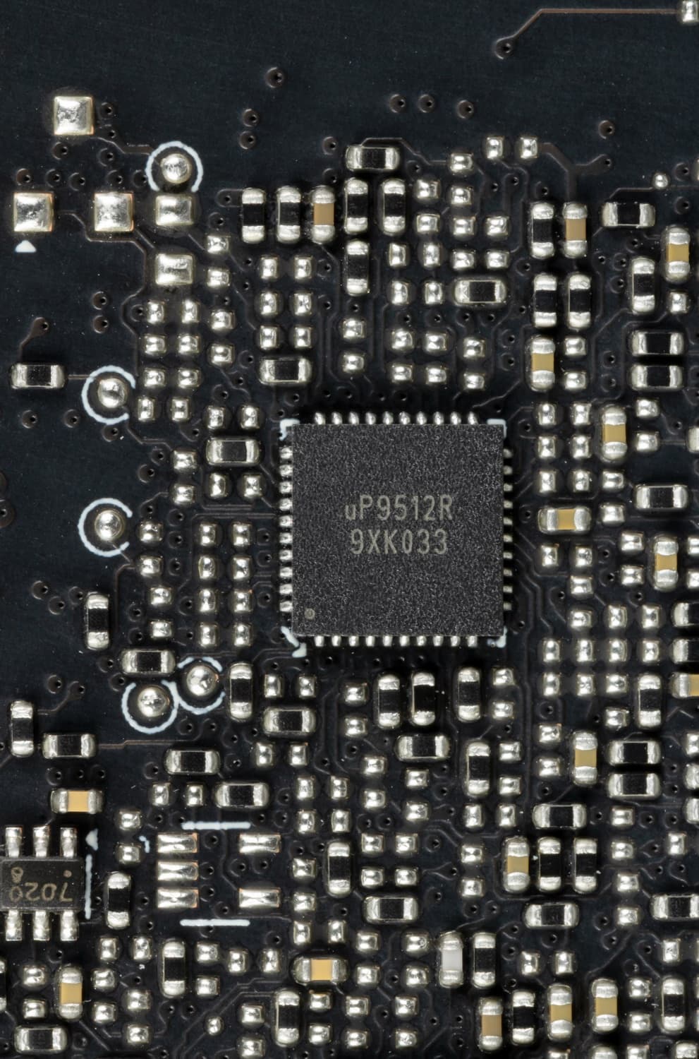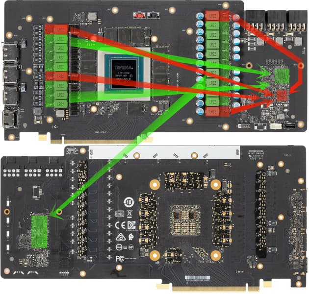 Зеленым цветом отмечена схема питания ядра, красным — памяти. При этом удвоителей (даблеров) фаз нет, для управления схемой питания GPU используются аж три ШИМ-контроллера: два uP9512R (uPI Semiconductor), расположенные на оборотной стороне платы…
