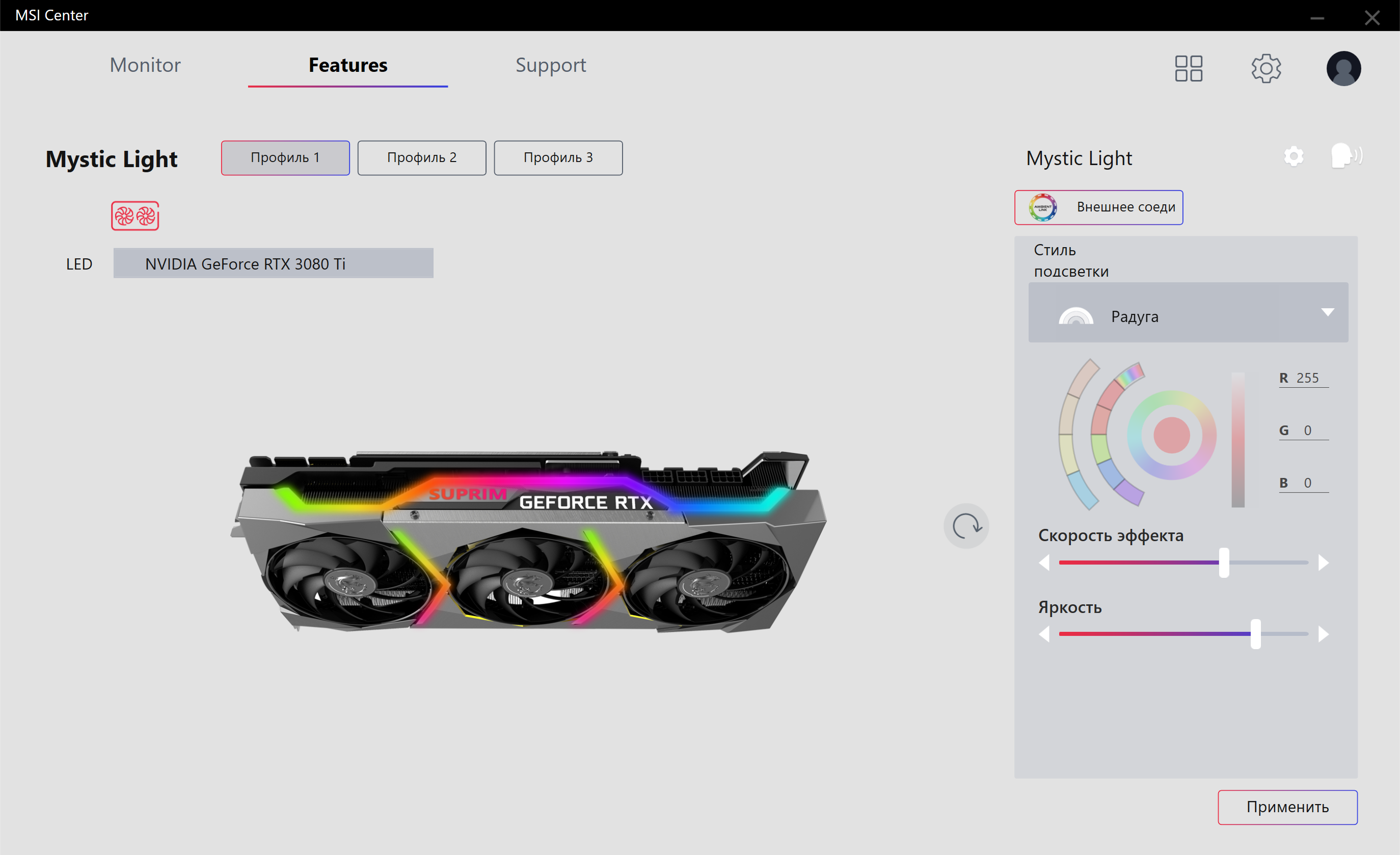 Управление работой карты обеспечивается с помощью фирменной утилиты MSI Center. Эта программа относительно недавно заменила собой прежний Dragon Center и является универсальным средством для огромного ассортимента продуктов MSI, включая не только видеокарты и материнские платы, но также и СЖО и ноутбуки.