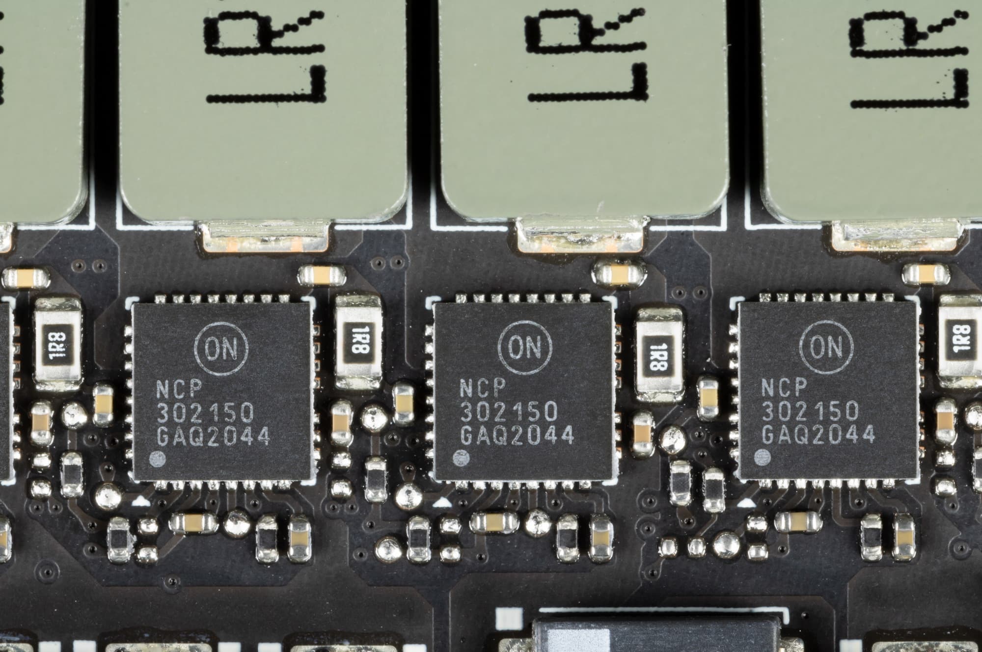В преобразователе питания, традиционно для всех видеокарт Nvidia, используются транзисторные сборки DrMOS — в данном случае NCP302150 (On Semiconductor), каждая из которых рассчитана максимально на 50 А.