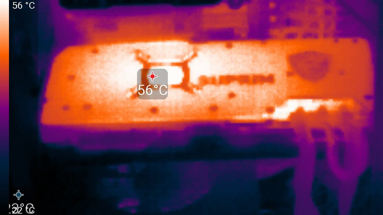 В этом случае максимальная температура ядра достигала 79 градусов, а микросхем памяти — 96 °C, что, в принципе, является приемлемым результатом для видеокарт такого уровня. Энергопотребление карты практически не изменилось (403 Вт).