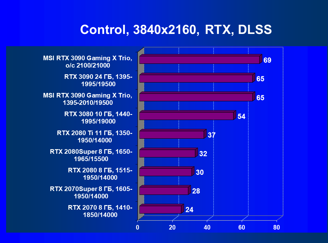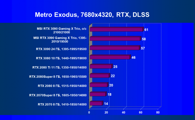 Стоит повторить (хотя в нашем первом материале по GeForce RTX 3090 мы это уже писали), что наличие большого объема памяти и прекрасная производительность дает GeForce RTX 3090 право называться первым видеоускорителем игрового класса для разрешения 8К. Игры должны поддерживать умный антиалиасинг DLSS 2.0 (причем именно для разрешения 4К и выше), тогда комфорт при игре на огромных 8К-телевизорах будет обеспечен при сохранении всех настроек графики по максимуму.