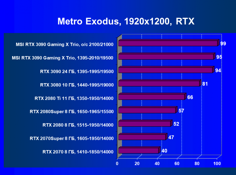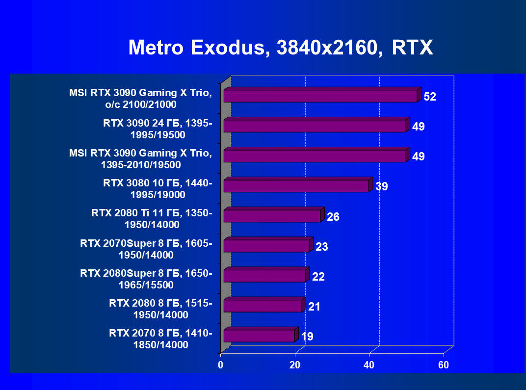 Трудно удивить кого-то информацией, что GeForce RTX 3090 стал лидером по производительности: это было известно изначально :) Разумеется, в лидерах и карта MSI на этом GPU. Ее фабричный разгон обеспечивает некоторый прирост скорости, но совсем уж минимальный, а ручной разгон, из-за ограничения на потребление в драйверах, показал прирост около 4,5%.