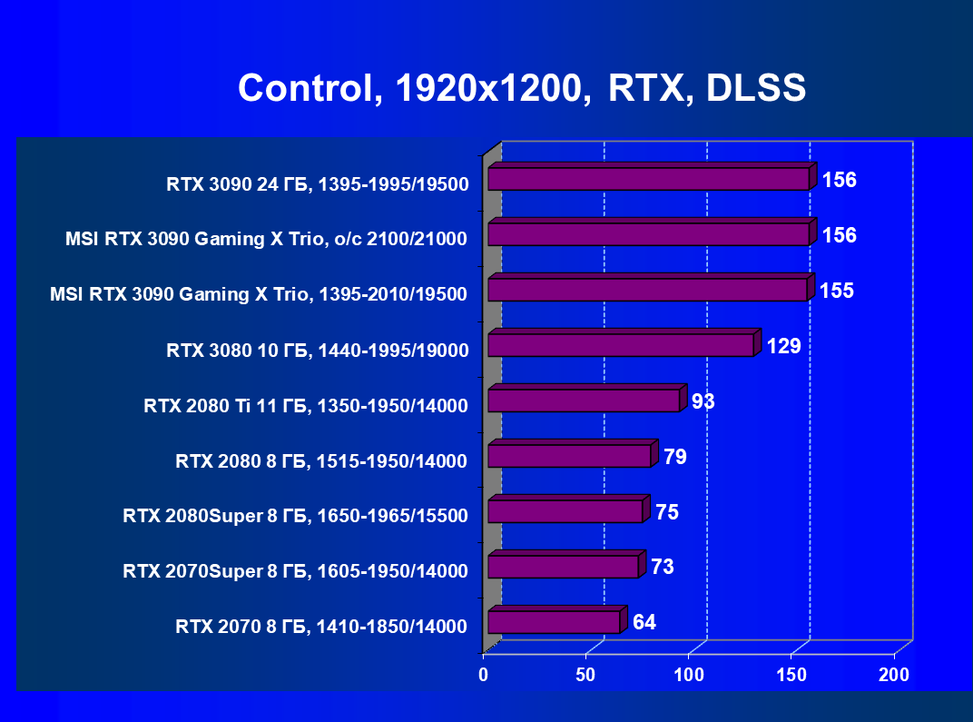 В поколении GeForce RTX 30 улучшены технологии RTX (расчет освещения с помощью трассировки лучей) и DLSS (интеллектуальная реализация антиалиасинга, обсчитываемая тензорными ядрами). Поэтому дополнительно мы приводим тесты с включенной RTX, а в ряде игр — и с DLSS. Разумеется, в этом случае сравнивать пока приходится только видеокарты Nvidia между собой.