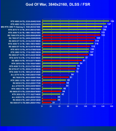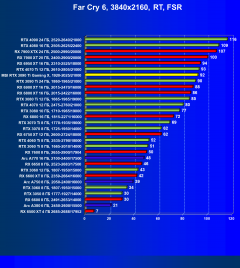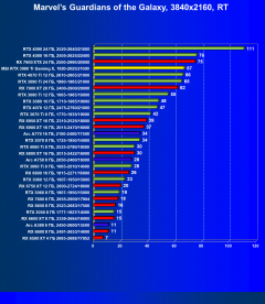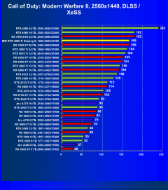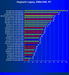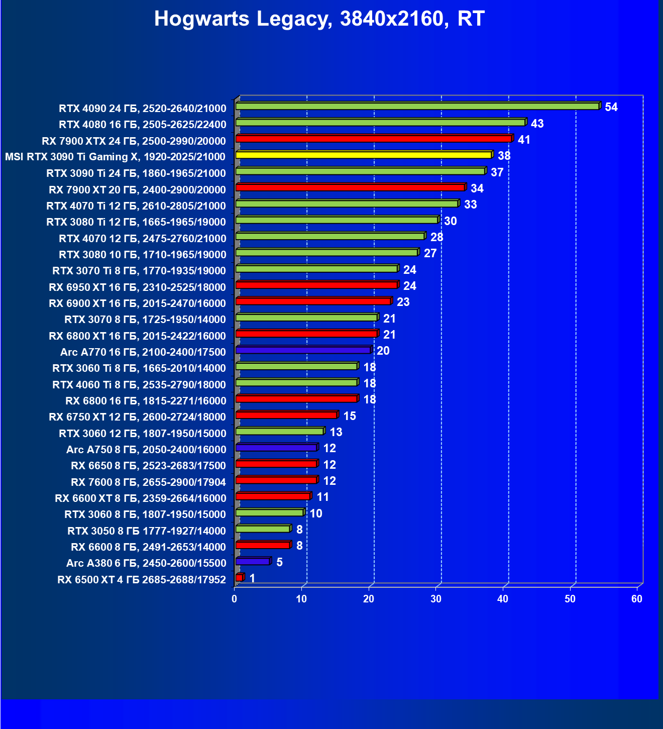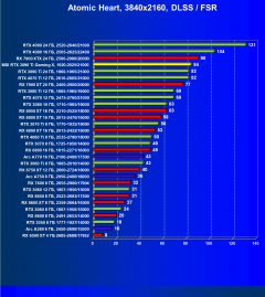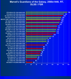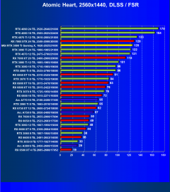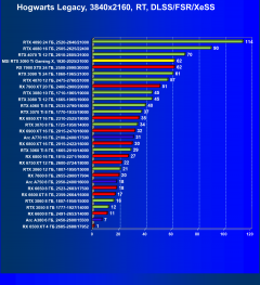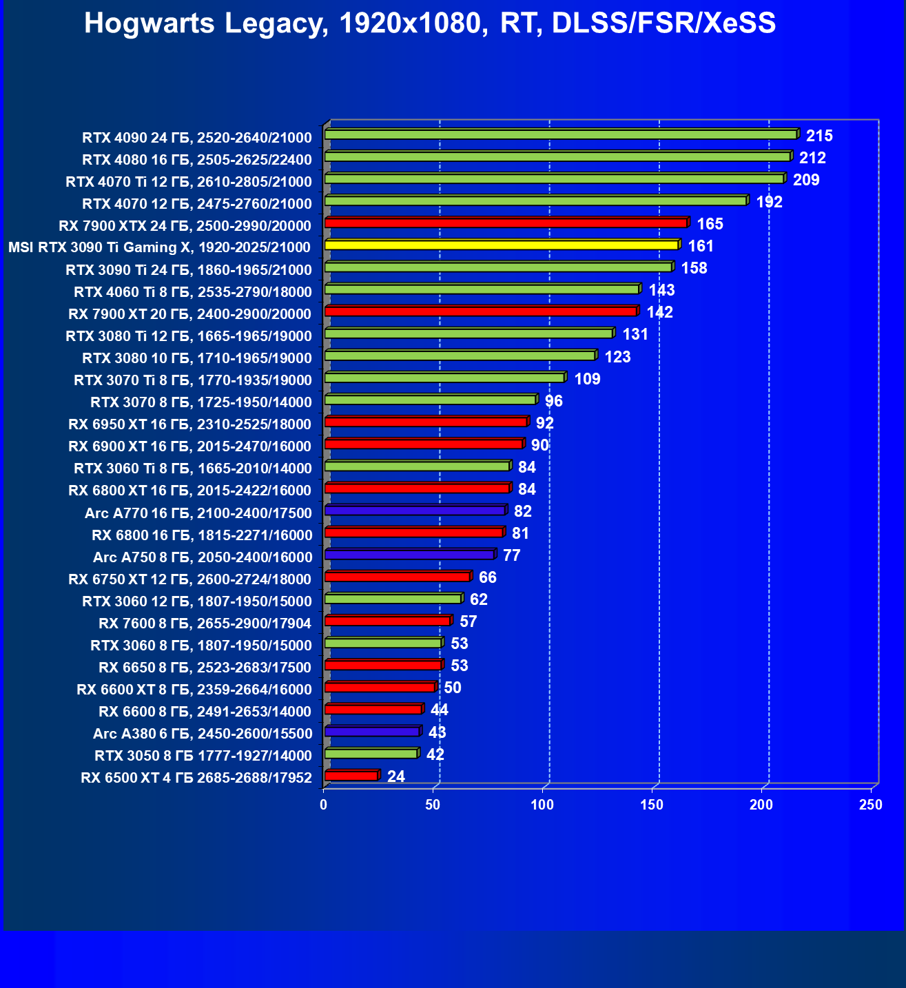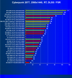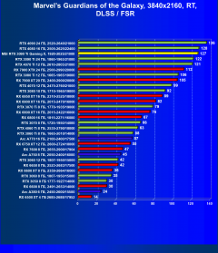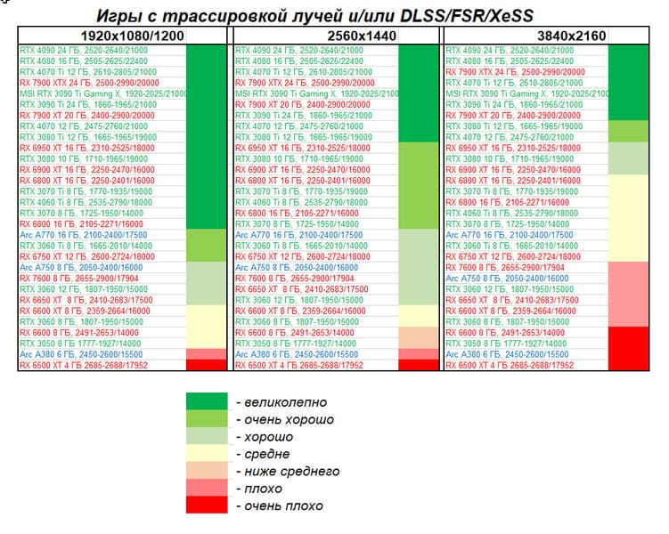 - Результаты тестов со включенной аппаратной трассировкой лучей и/или DLSS/FSR/XeSS в разрешениях 1920×1080, 2560×1440 и 3840×2160