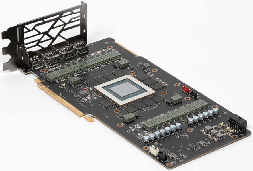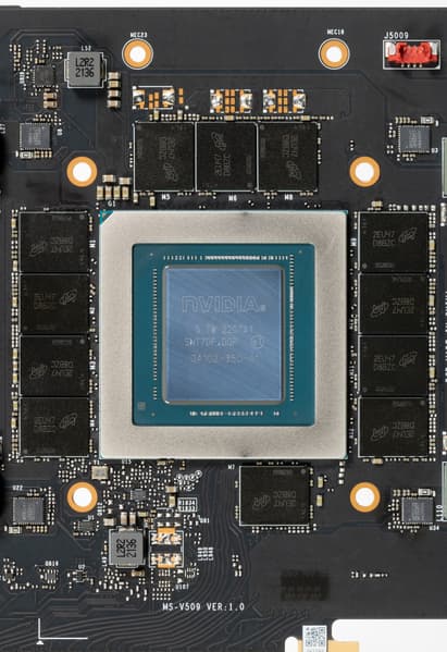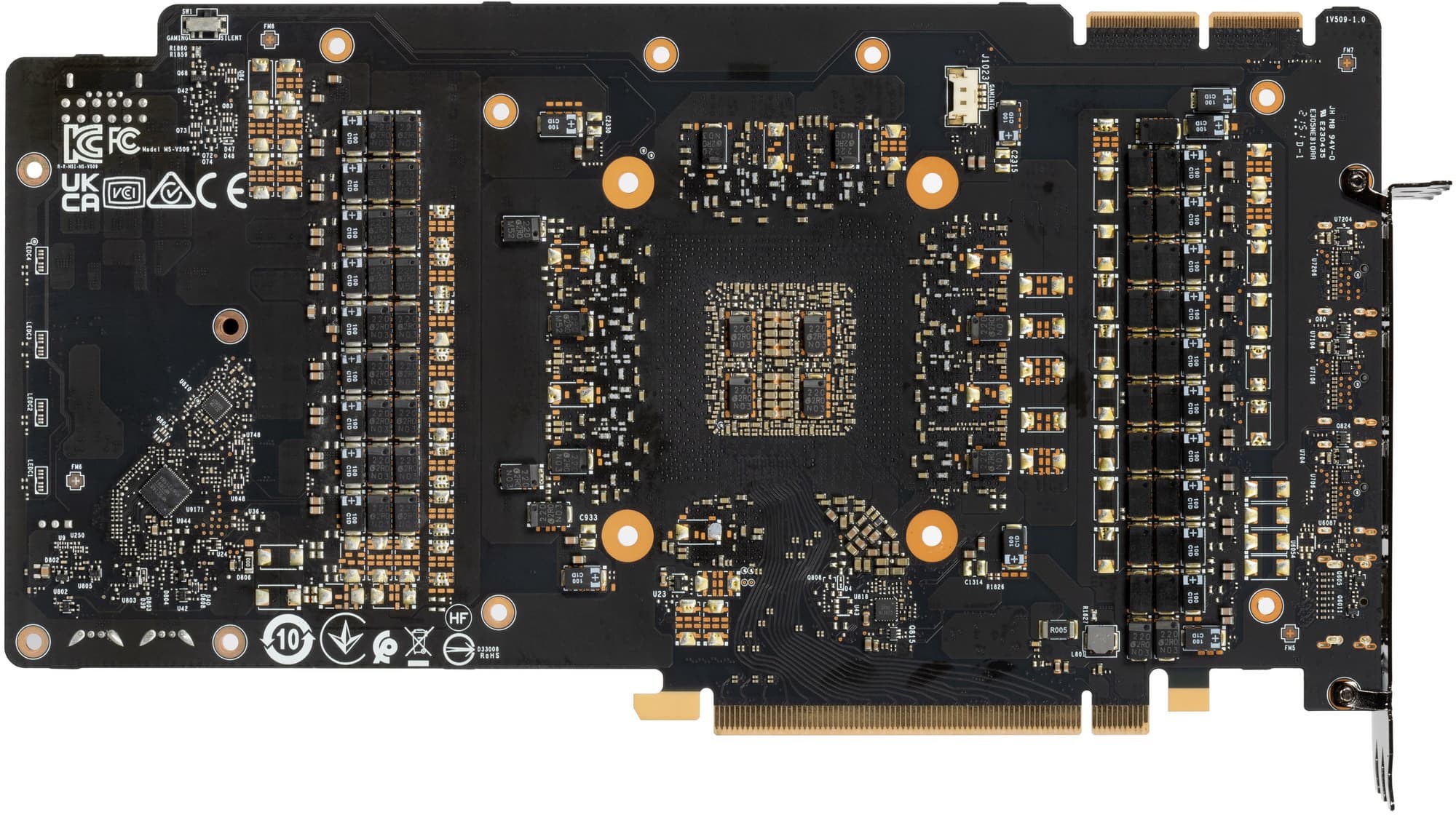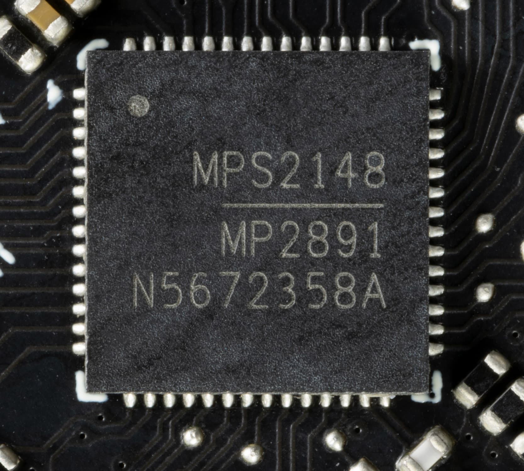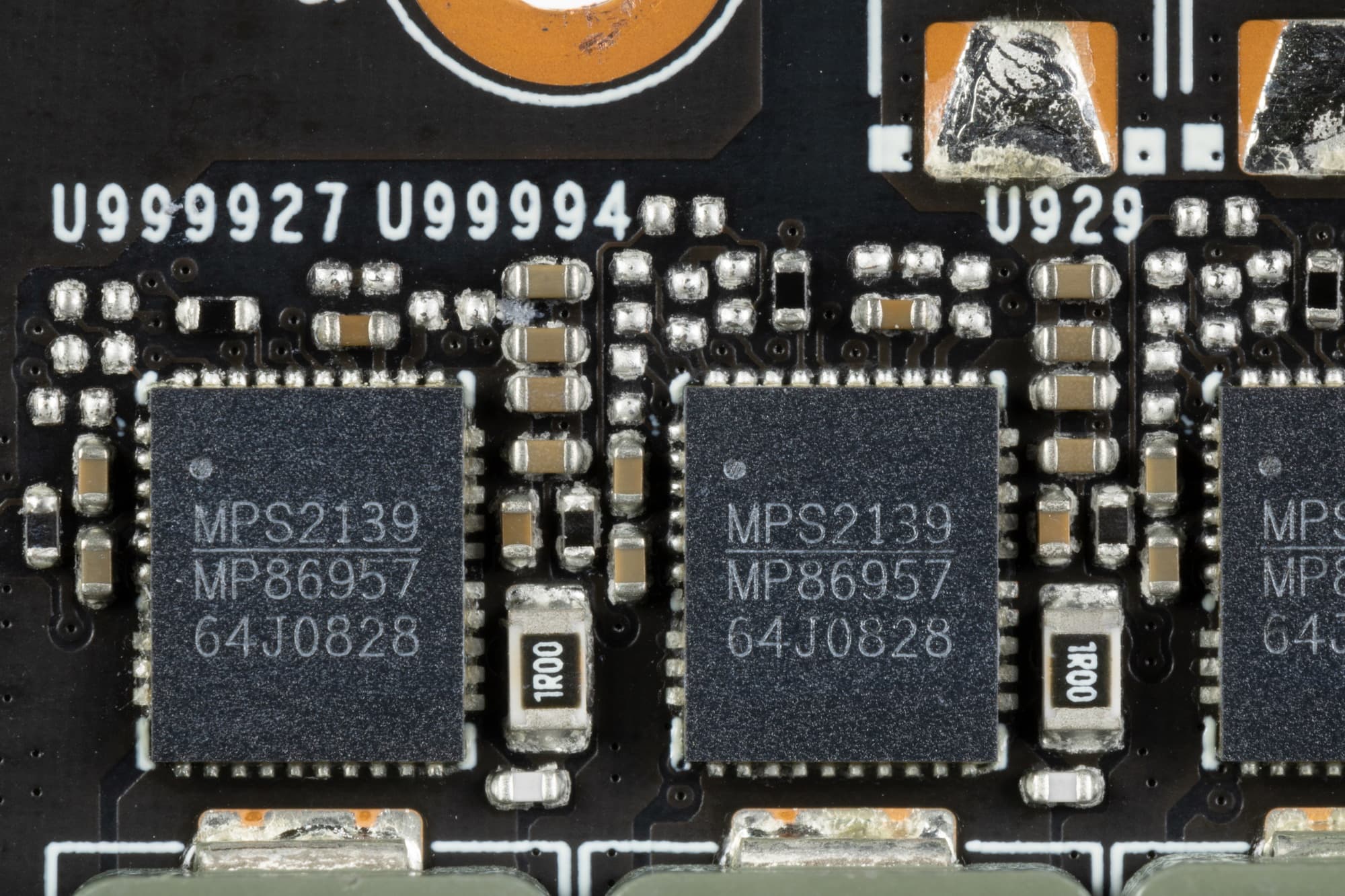 В преобразователе питания, традиционно для всех видеокарт Nvidia, используются транзисторные сборки DrMOS — в данном случае MP86957 (Monolithic Power Systems), каждая из которых рассчитана максимально на 70 А.