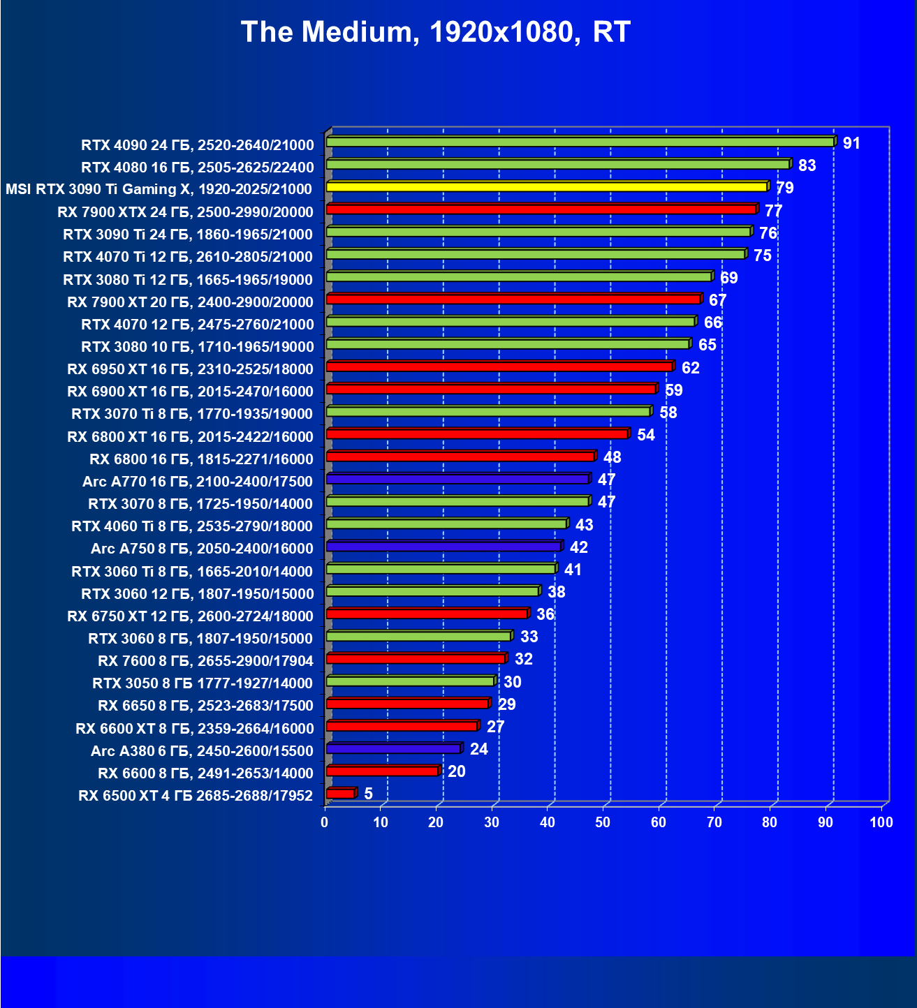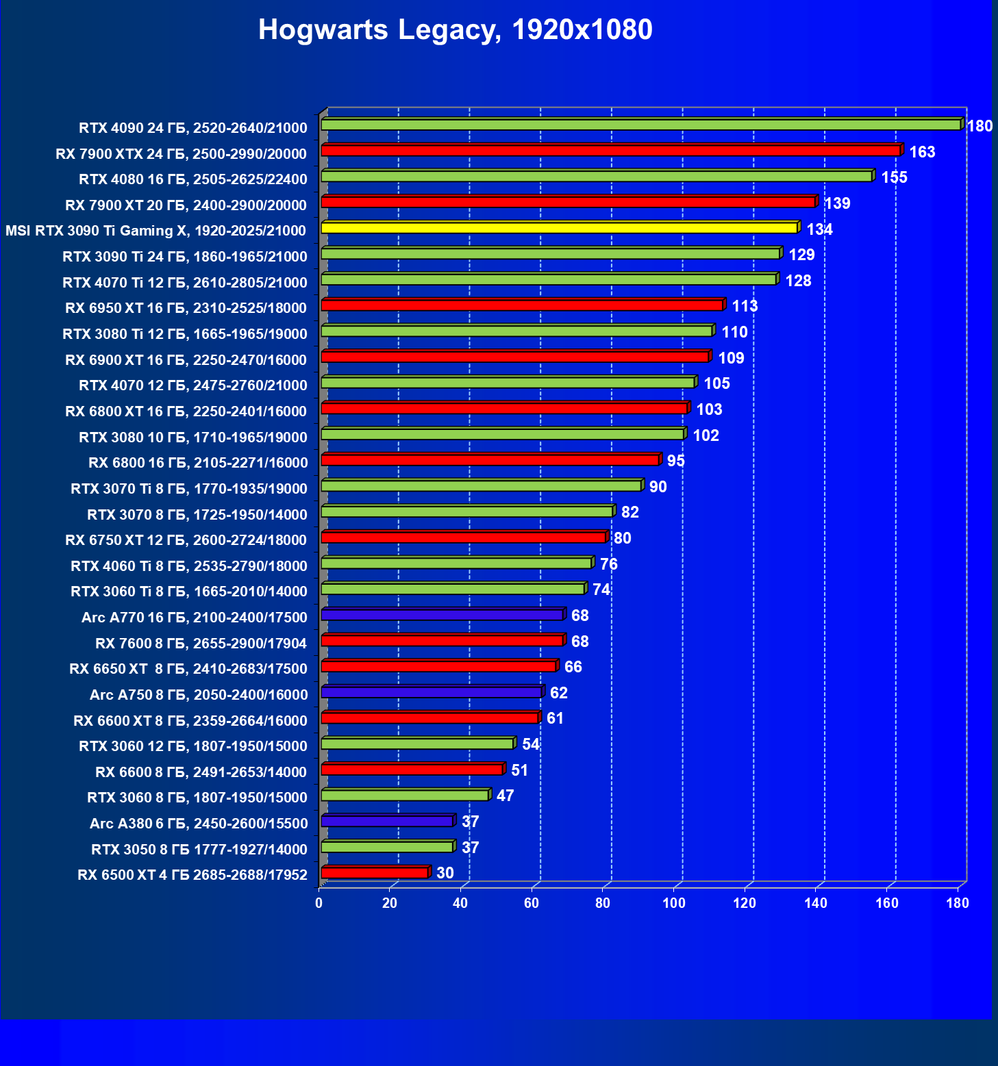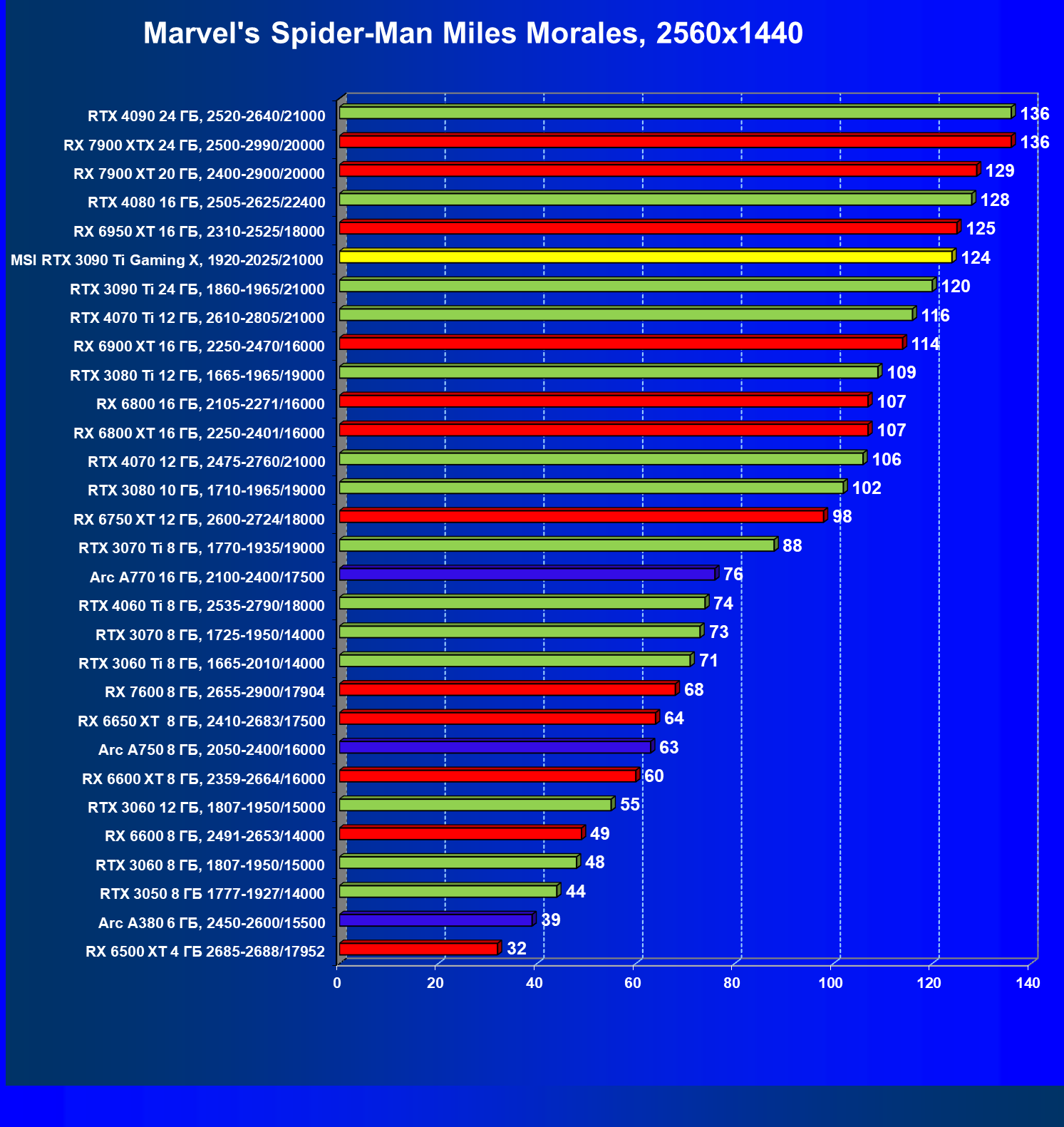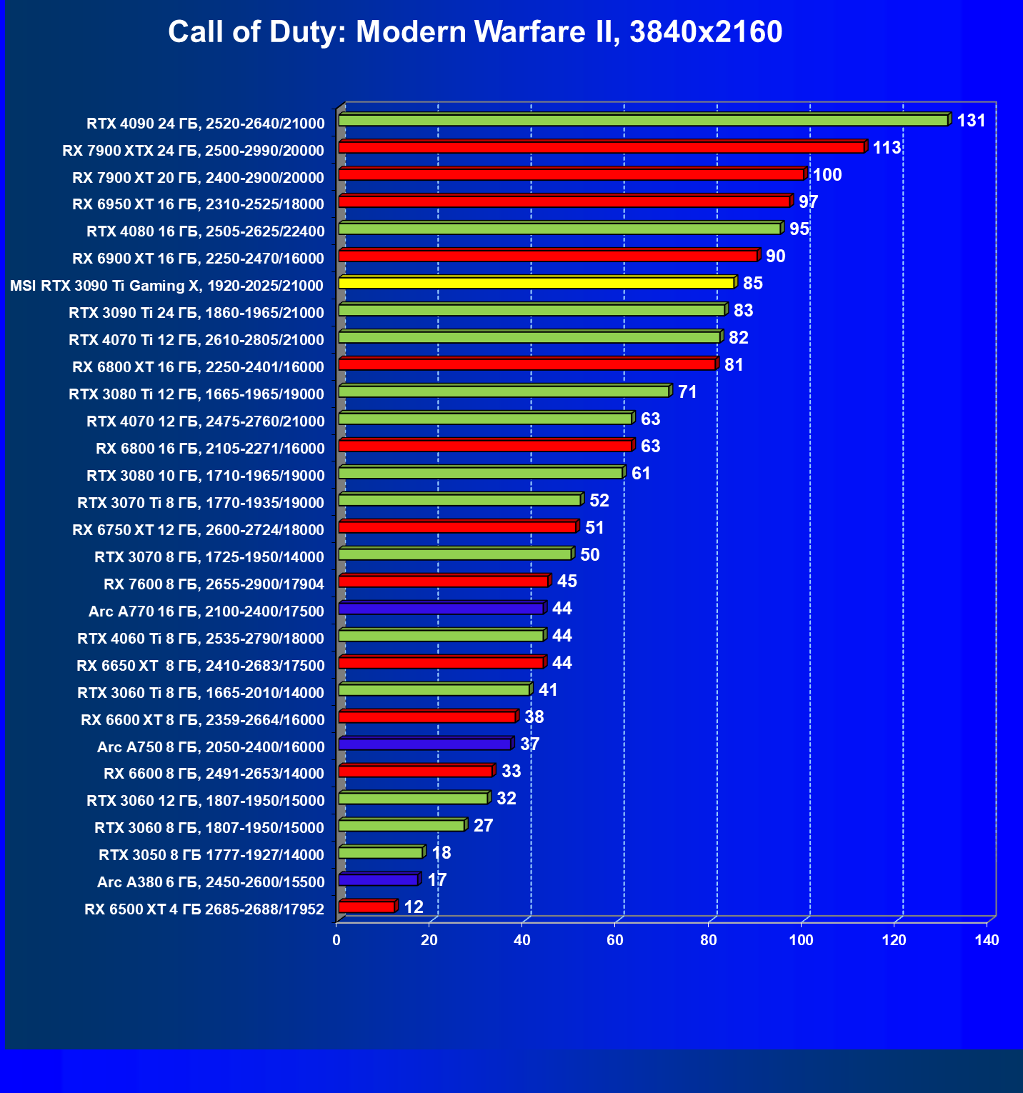 | 10 | RX 7900 XTX 24 ГБ, 2500—2990/20000 | 133 | 1224 | 92 000 |