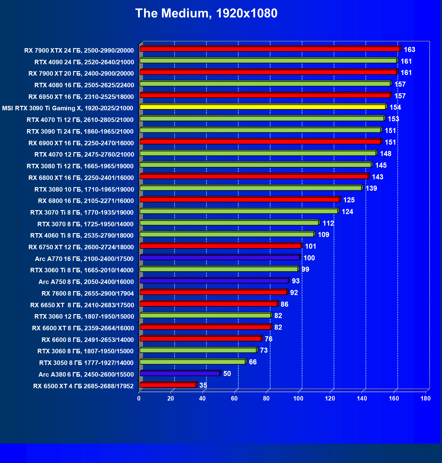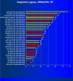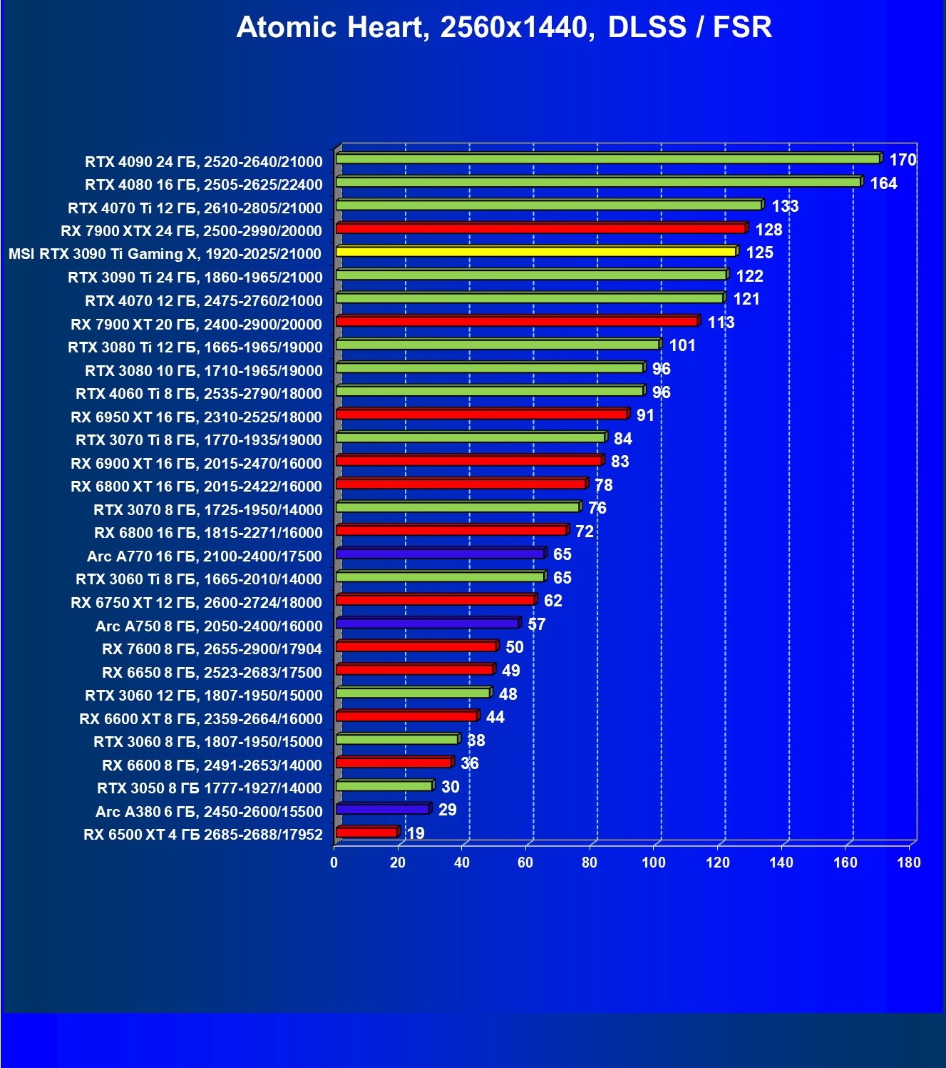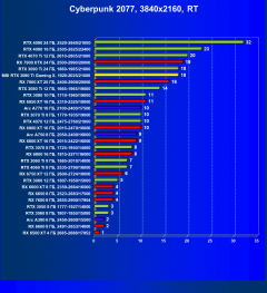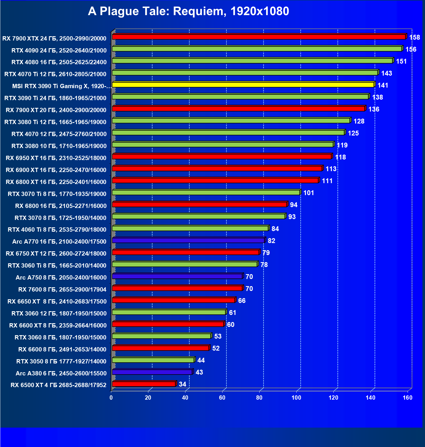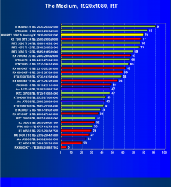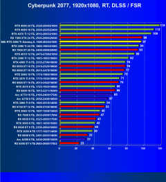 Расклады немного поменялись, ибо RX 7900 XT, получая более драматичное падение FPS от RT, спустился ниже RTX 3090 Ti, а вот RTX 4070 Ti, наоборот, значительно прибавил в средней производительности относительно 3090 Ti за счет наличия DLSS 3.0 в трех наших тестовых играх.