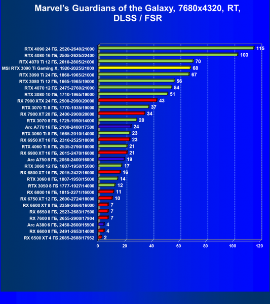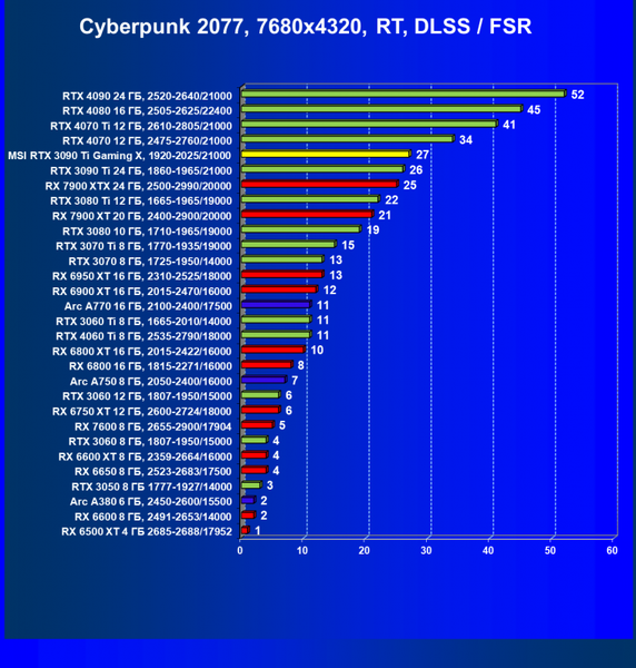 Результаты тестов с включенной аппаратной трассировкой лучей и DLSS/FSR/XeSS в разрешении 7680×4320 (8К)