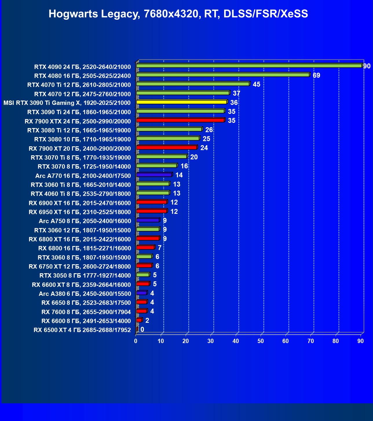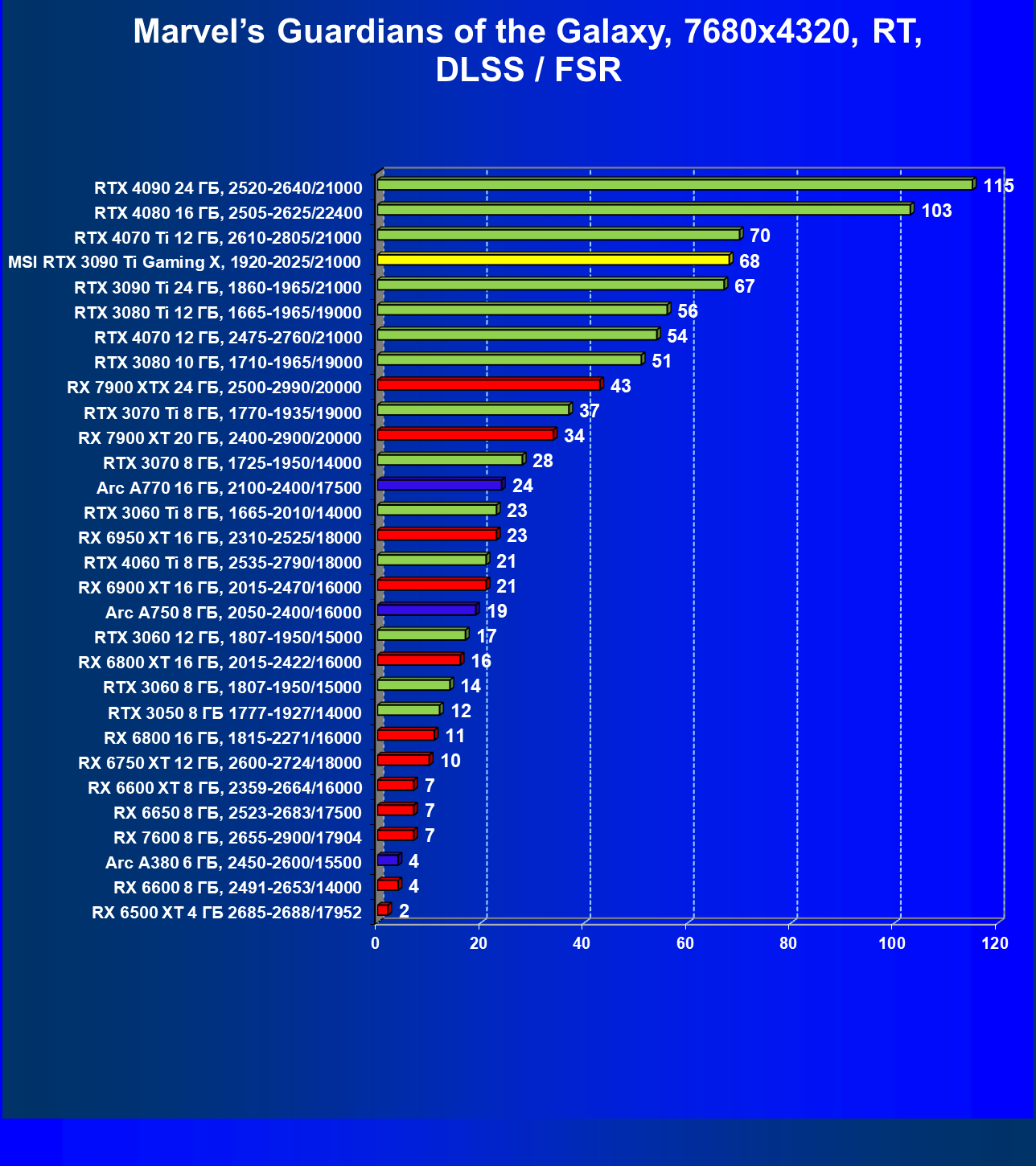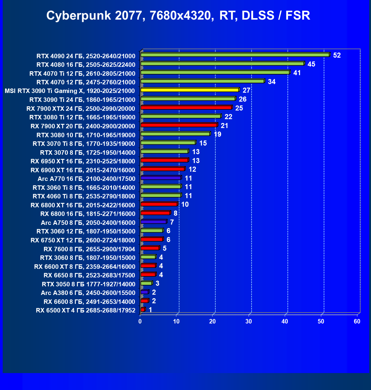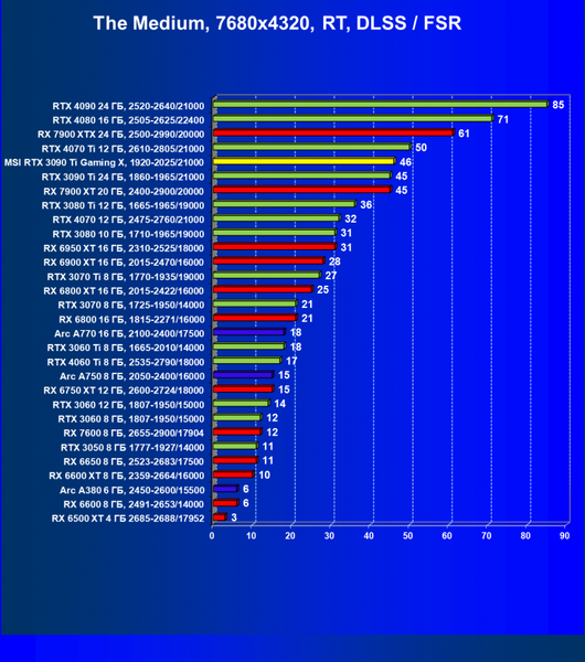 - Результаты тестов с включенной аппаратной трассировкой лучей и DLSS/FSR/XeSS в разрешении 7680×4320 (8К)