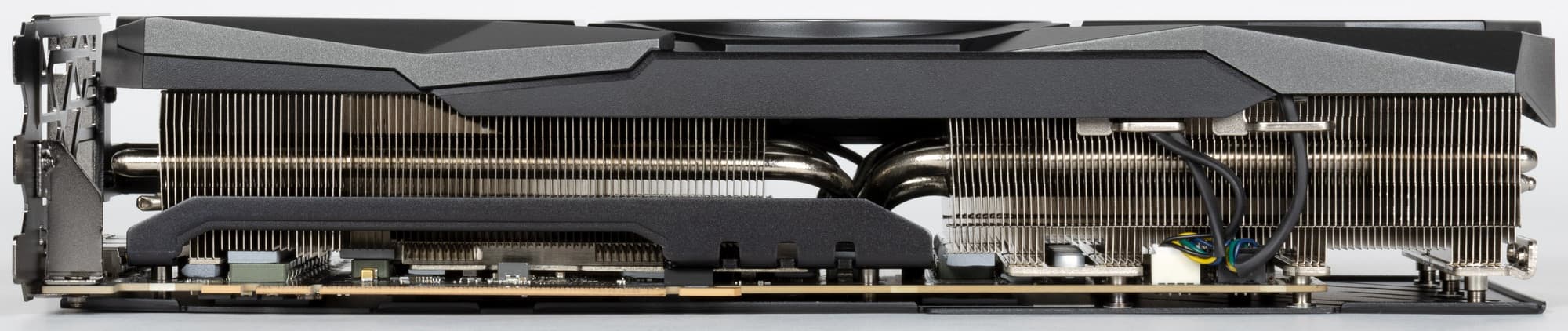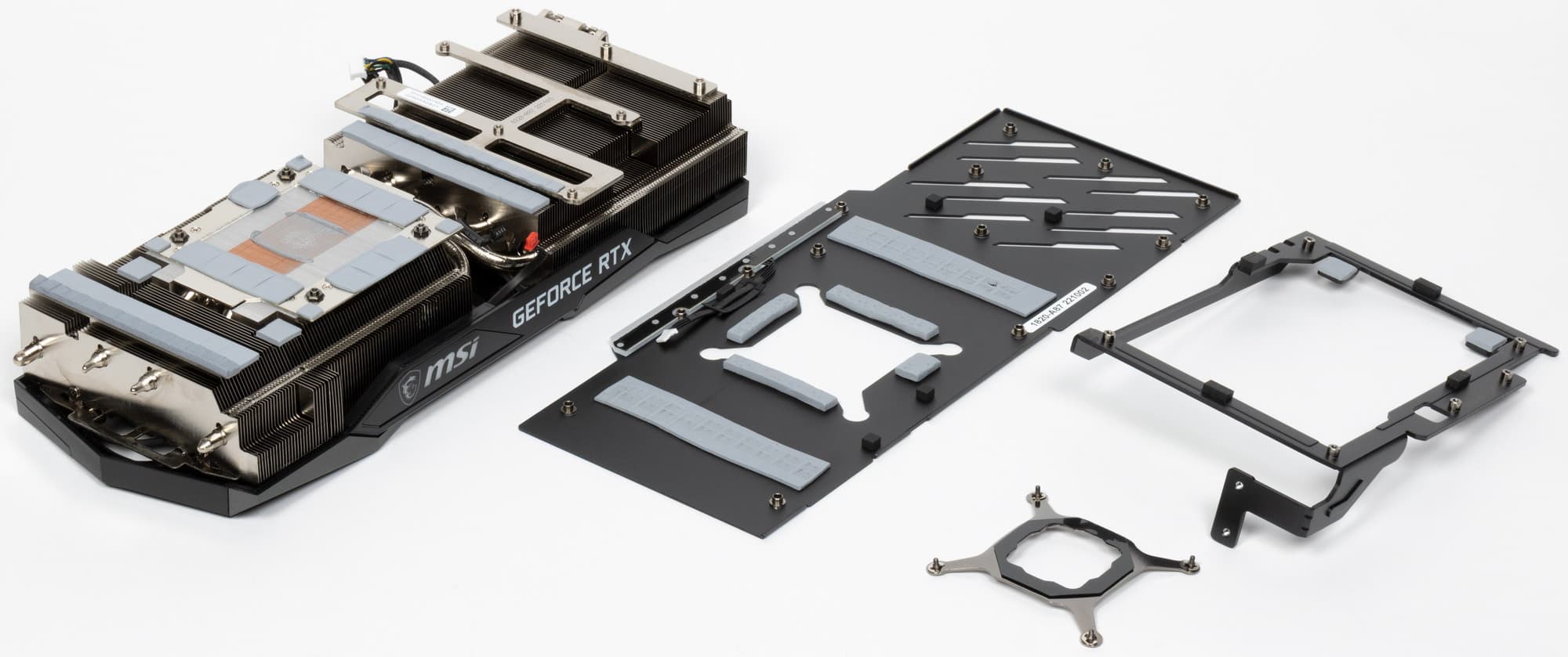 У карты MSI основой кулера является многосекционный пластинчатый никелированный радиатор с 6 тепловыми трубками, распределяющими тепло по ребрам радиатора. Трубки припаяны к огромной подошве, прижимающейся к ядру.