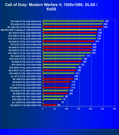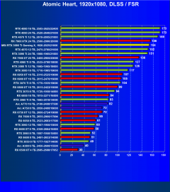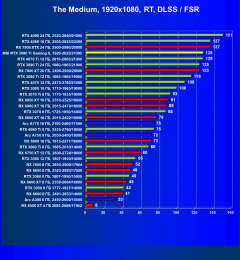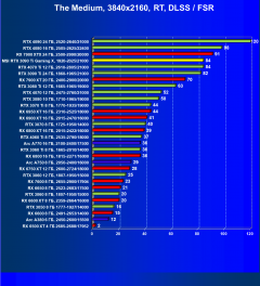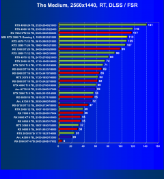 Рейтинг составлен по 9 тестам, в которых используется технология трассировки лучей и одновременно технология Nvidia DLSS, AMD FSR или Intel XeSS. Этот рейтинг нормирован по самому слабому ускорителю в данной группе — Radeon RX 6500 XT (то есть сочетание скорости и функций Radeon RX 6500 XT приняты за 100%).