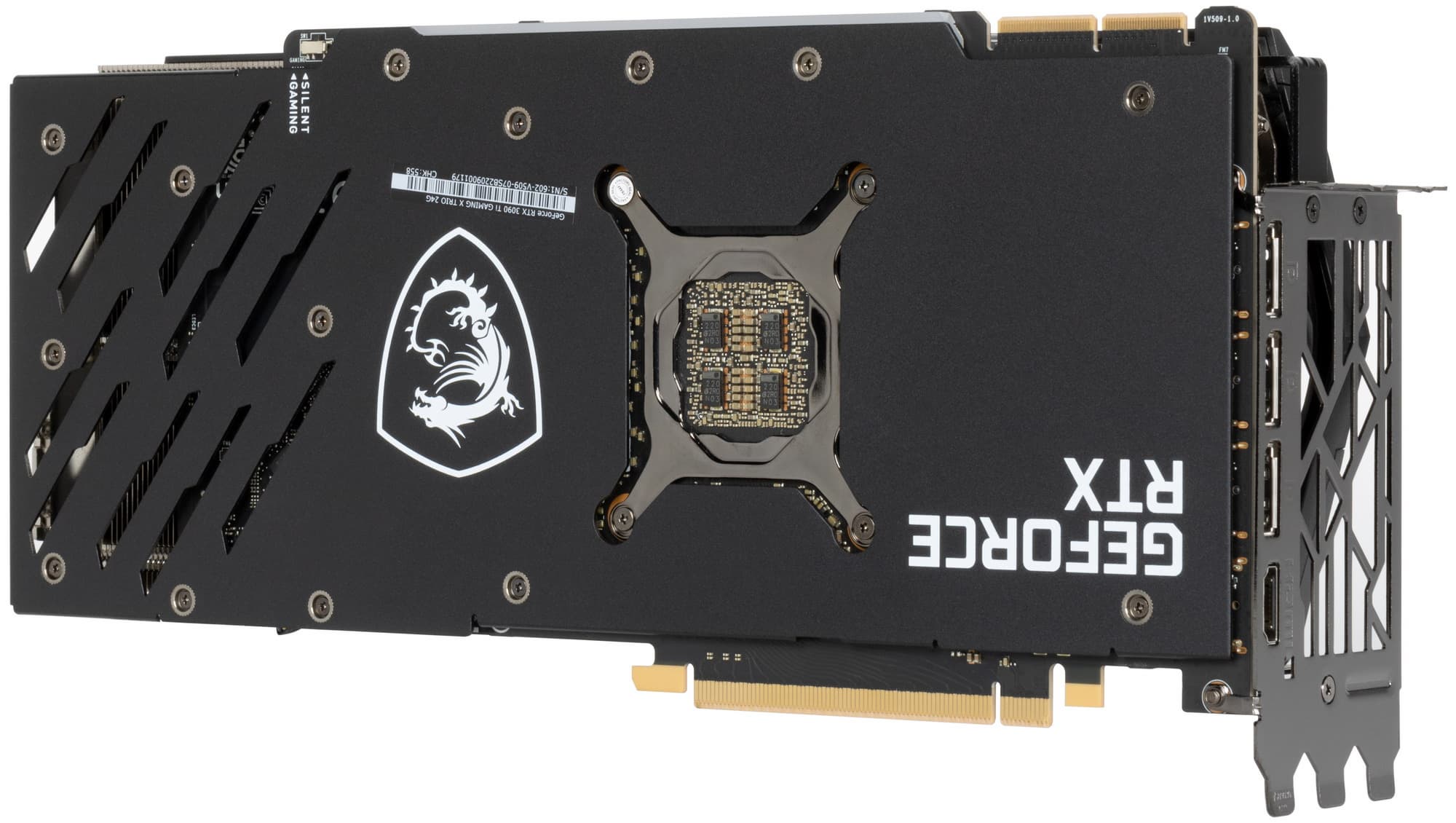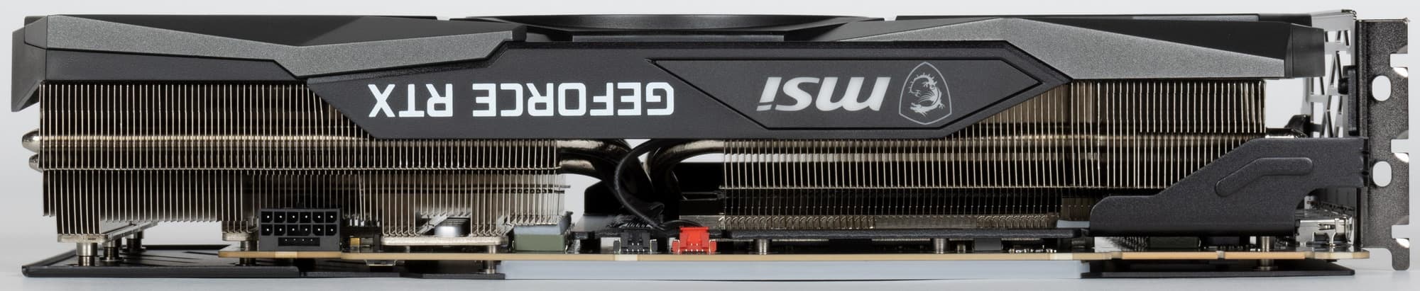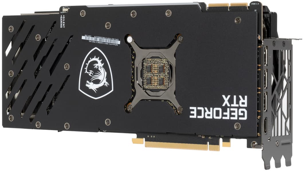 Карта MSI способна потреблять до 450 Вт. Система охлаждения мощная, но шумная. Габариты этой модели составляют 33 см в длину и 14 см в высоту, а по толщине видеокарта занимает 4 слота в корпусе. Набор видеовыходов стандартный: 3 DP и 1 HDMI.