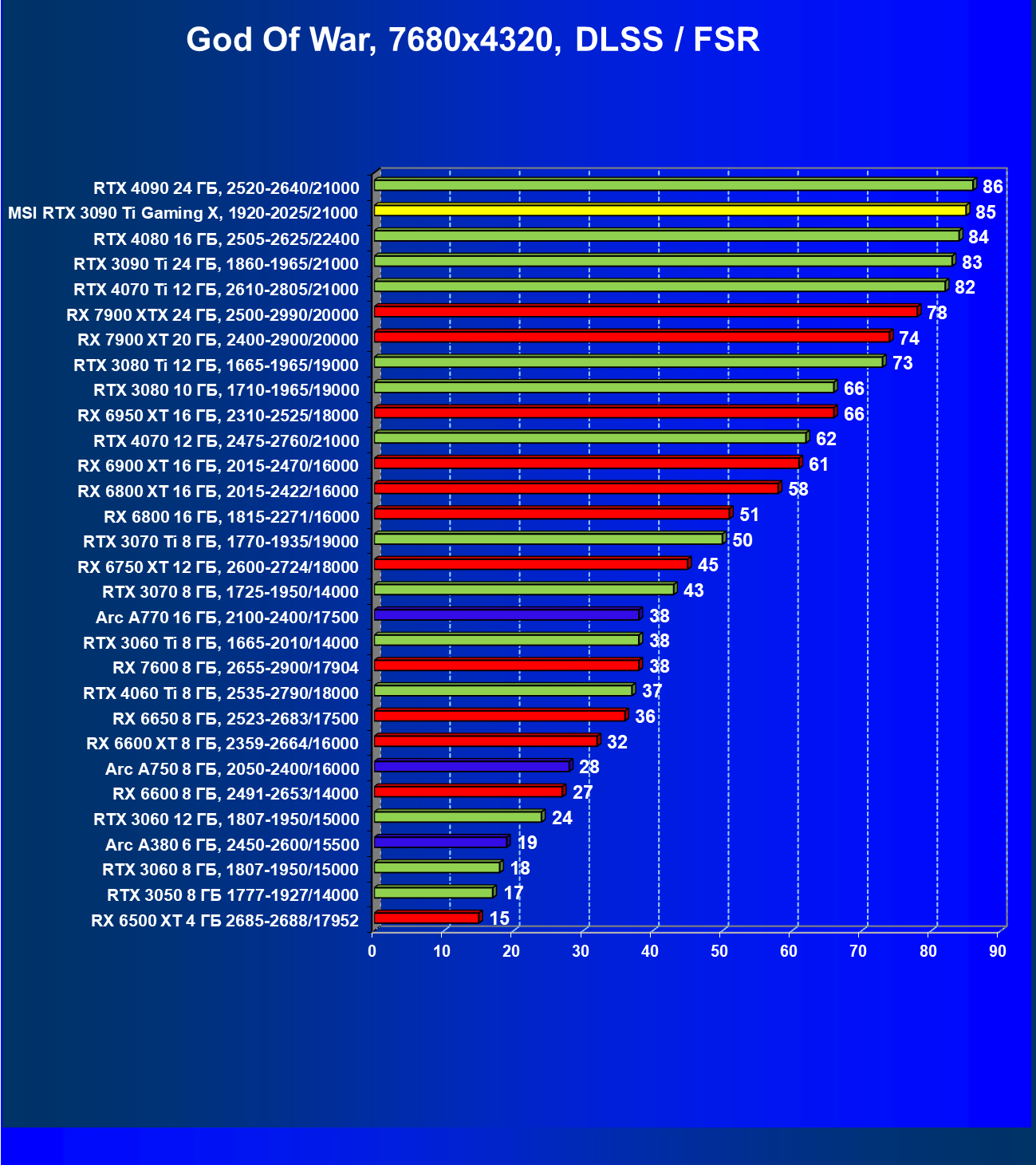 | 08 | RX 6950 XT 16 ГБ, 2310—2525/18000 | 901 | 102 | 88 000 |