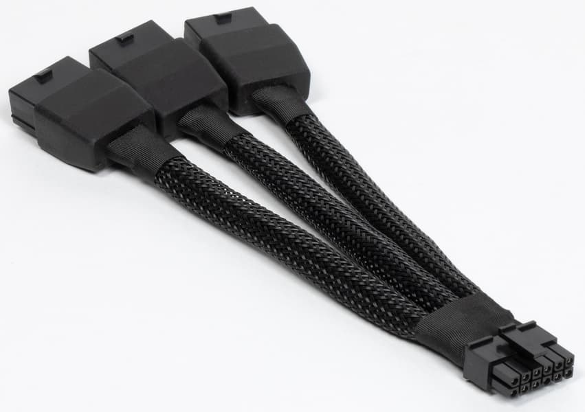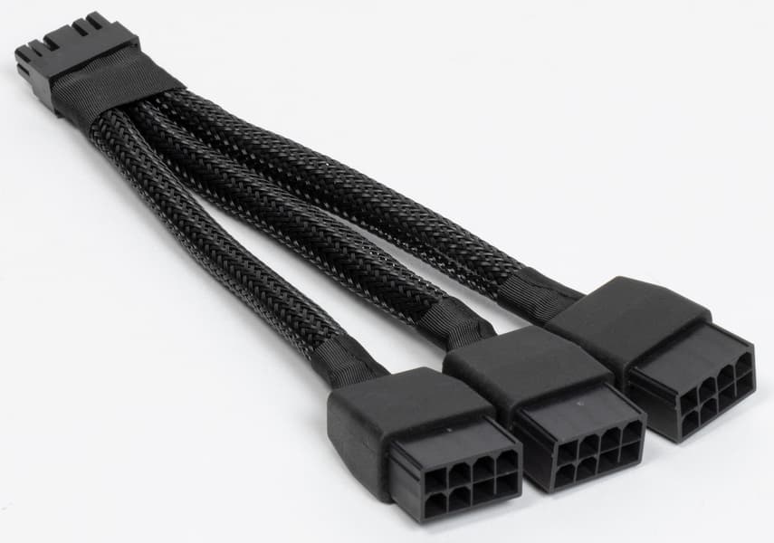 В комплекте также лежит переходник питания (о нем я уже говорил выше) с трех 8-контактных разъемов на один 16-контактный. Адаптер крайне не рекомендуется сгибать в месте той самой оплетки!