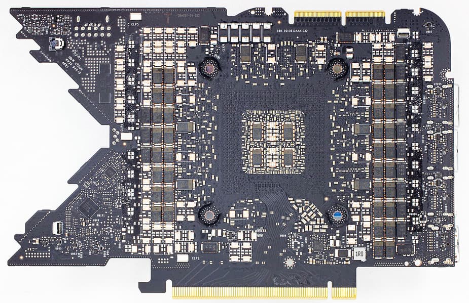 Ранее я уже писал, что у Nvidia имеется несколько вариантов референс-дизайна 3090 Ti (справа — вариант, что идет в фирменные видеокарты Founders Edition от самой Nvidia). Если при изучении карт на базе RTX 3090/3080 мы подмечали отличия между PCB у карт Founders Edition и серийно выпускаемых карт партнерами Nvidia (у FE размеры самые маленькие, а также имеется V-образный вырез, чего не было ни у одной карты от партнеров), то в случае с RTX 3090 Ti многие партнеры стали следовать примеру Nvidia, выпуская карты с печатными платами с вырезом. Однако инженеры MSI решили пойти по своему пути, переделав дизайн, и поэтому четко видно, что по компоновке элементов на PCB от «выреза» не осталось и следа.