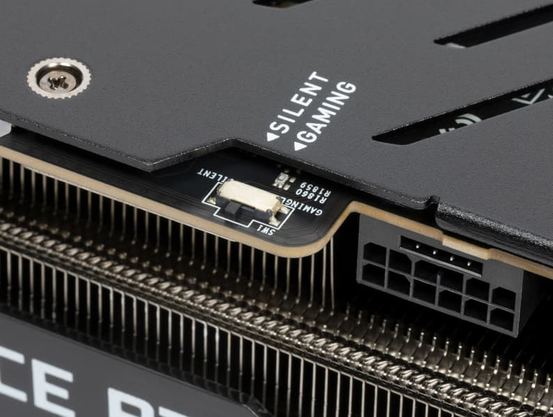 Карта имеет два режима работы, они заложены в двух вариантах BIOS, которые переключаются с помощью переключателя на верхнем торце карты: Gaming и Silent. В данном случае разница между режимами заключается только в настройках оборотов вентиляторов.