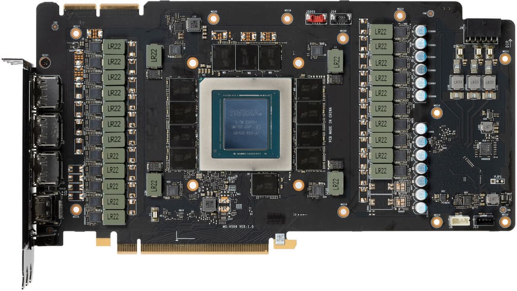 Итак, распределение фаз такое: у GeForce RTX 3090 Ti FE — 18 фаз на ядро и 3 на микросхемы памяти. А у карты MSI — 22 фазы на ядро и 4 — на микросхемы памяти.