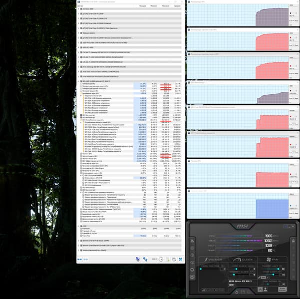 При ручном разгоне (режим BIOS Gaming) при выставлении лимита потребления в 112% параметры нагрева и шума менялись мало. Несмотря на поднятие лимита потребления, драйвера Nvidia не позволяли потреблению особо подниматься выше 450 Вт, поэтому частоты работы GPU в игровых тестах редко поднимались выше 2075-2100 МГц.