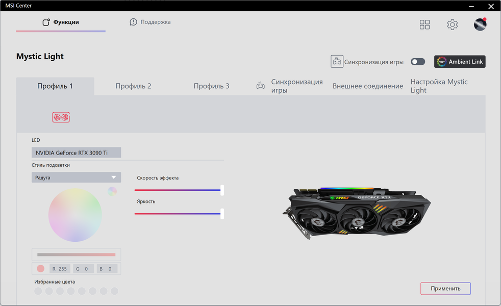 Управление подсветкой традиционно выполнено с помощью MSI Center. Выбор режимов очень широк (и это также традиционно для карт MSI).