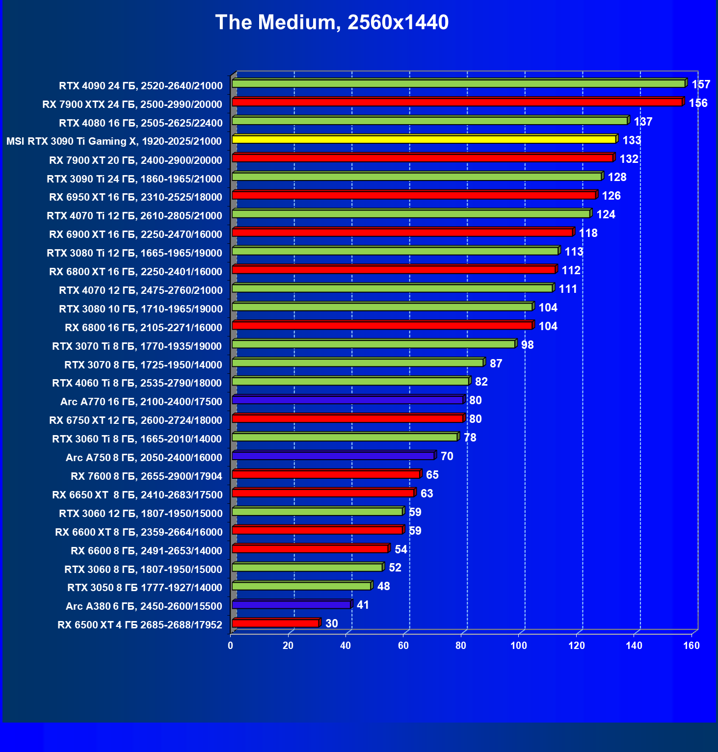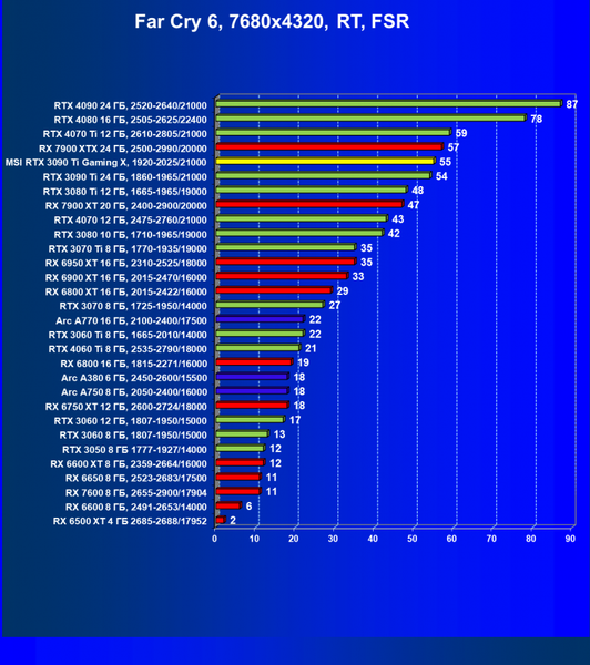У многих карт в разрешениях 2K, 2.5K и даже 4K в классических играх общая производительность ограничивается уже не видеокартой, а другими компонентами системы, чаще всего упирается в возможности центрального процессора. Это же касается и данной карты MSI, она (как все RTX 3090 Ti) четко входит в пятерку лидеров, и с этой картой мы можем получать хороший комфорт в играх в любом из представленных выше разрешений при условии игры с максимальными настройками графики (но без RT и/или DLSS/FSR/XeSS). В некоторых играх можно будет поиграть и в разрешении 8K.