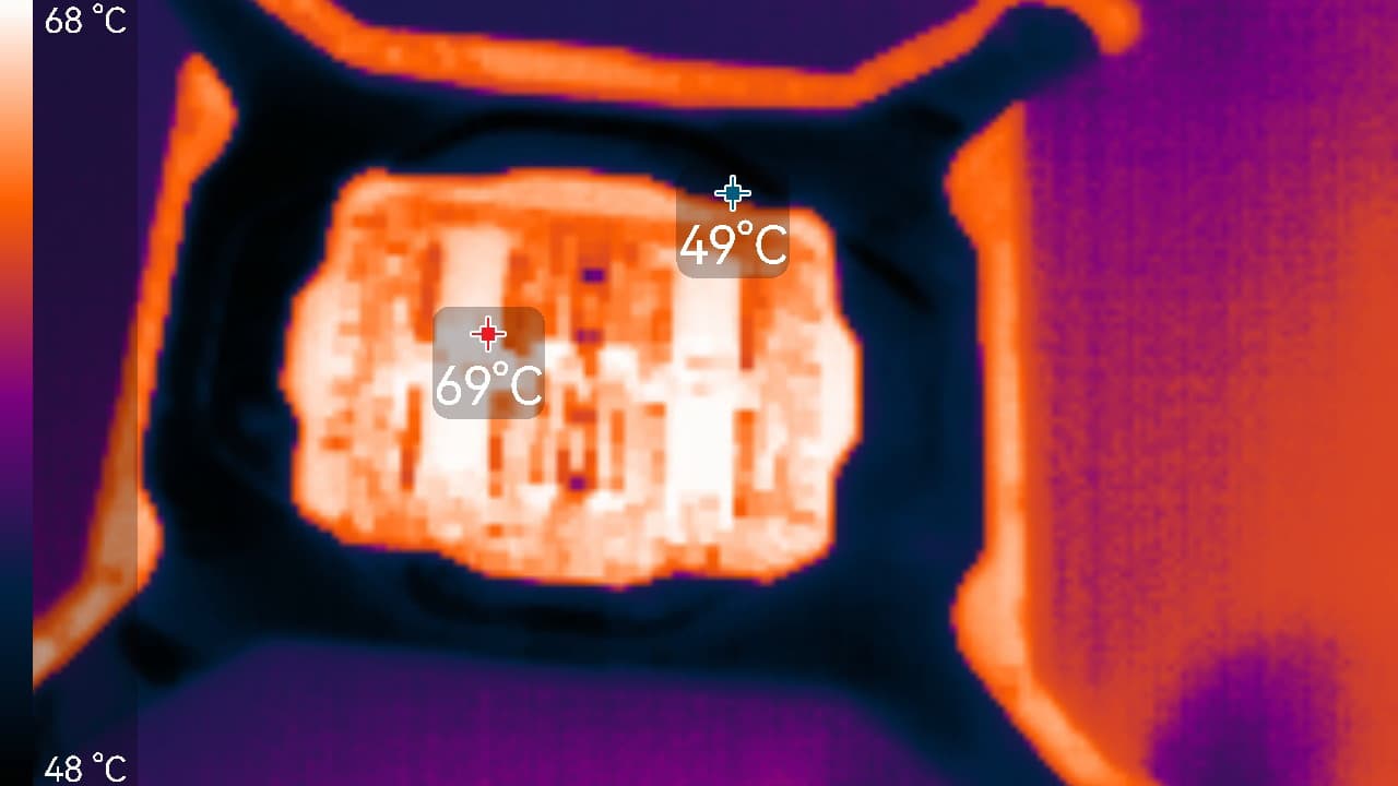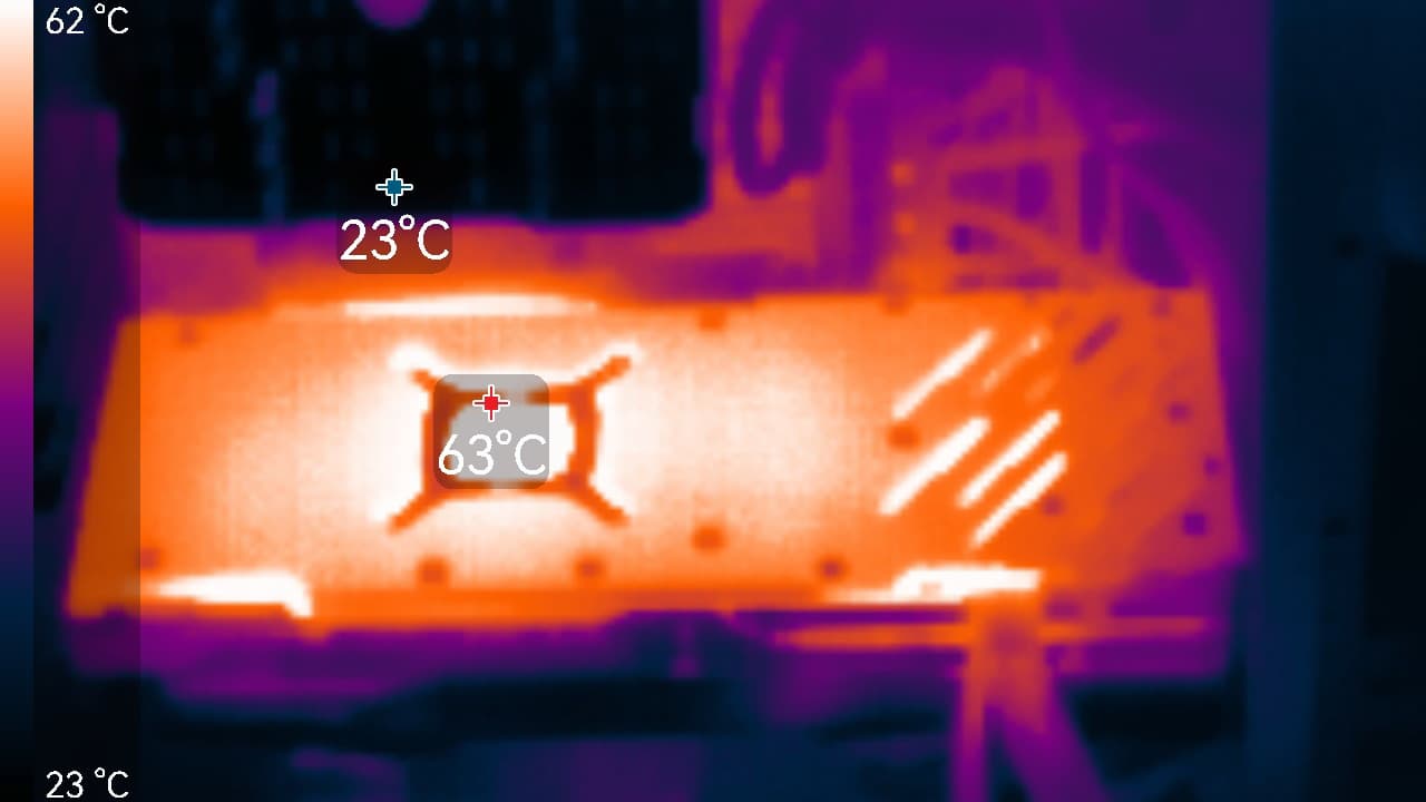 В этом случае максимальная температура ядра достигала 83 градусов, а микросхем памяти — 84 °C, что уже на грани приемлемого. Энергопотребление карты почти не изменилось, максимум за время тестов составил 452 Вт. Температура горячей точки GPU — 93 °C .