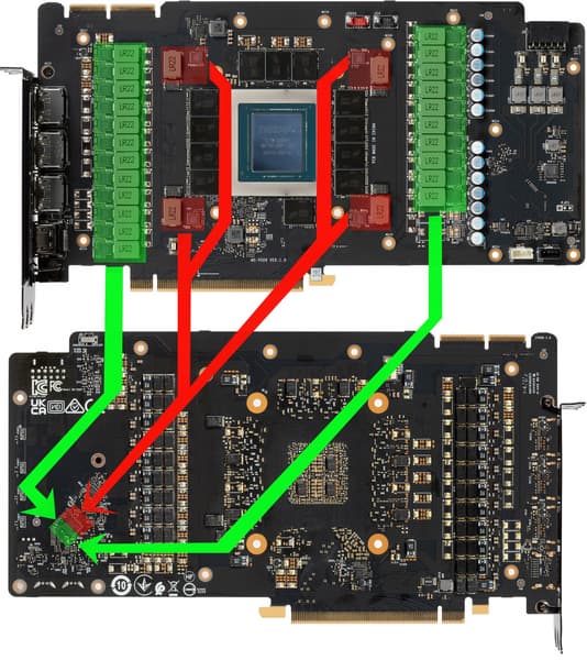 Зеленым цветом отмечена схема питания ядра, красным — памяти. Обоими схемами (22+4) управляет один ШИМ-контроллер Monolithic Power Systems MP2891 (расположенный на оборотной стороне PCB). Этот контроллер рассчитан максимум на 16 фаз, поэтому очевидно, что идет параллельное управление фазами питания GPU (не 22, а реально 11), плюс 4 прямые фазы питания микросхем памяти.