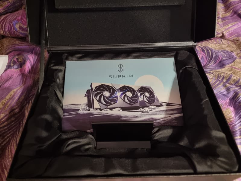 В комплекте поставки кроме традиционного краткого руководства пользователя имеются: металлическая подставка-кронштейн с надписью Suprim под карту, переходник питания и плотный прорезиненный коврик для игровой мыши с логотипами MSI и Suprim.