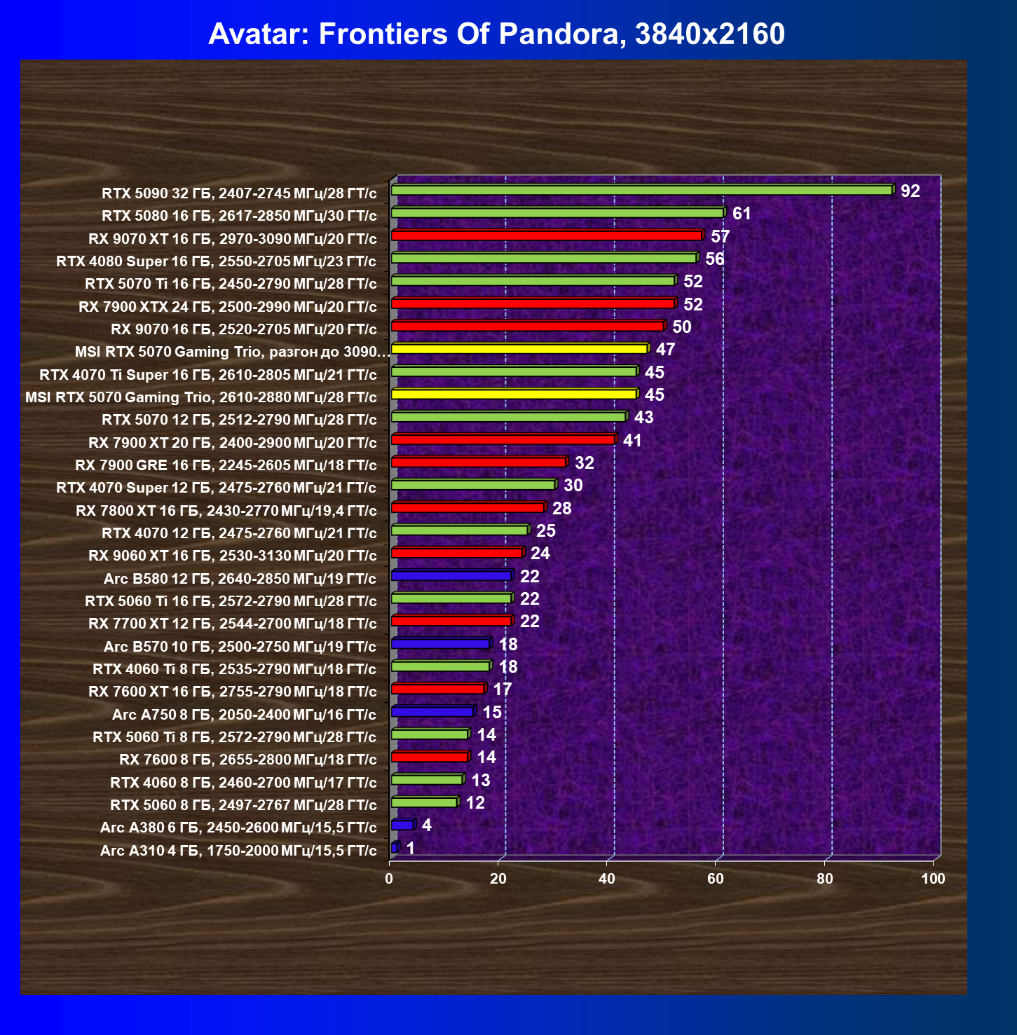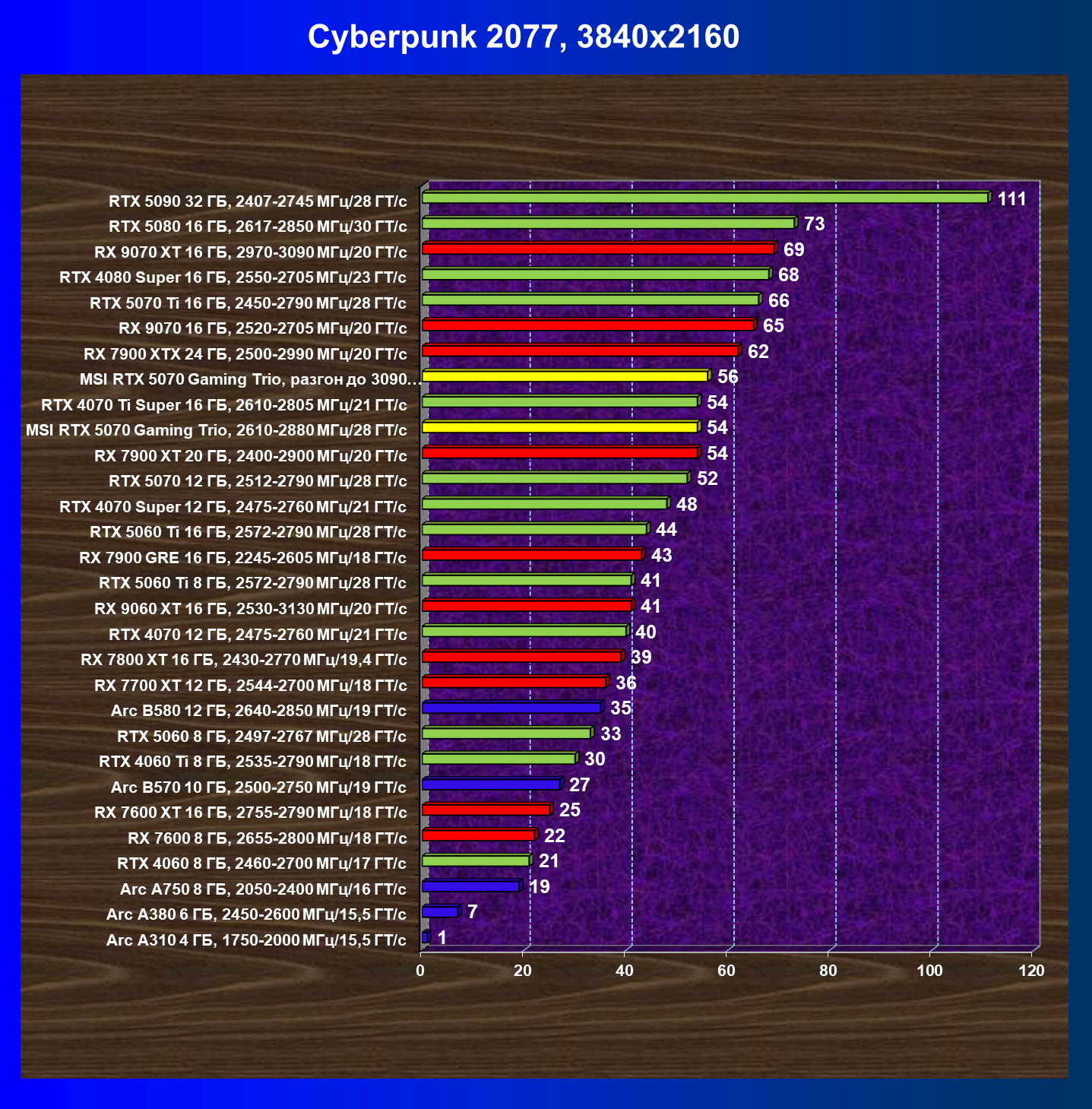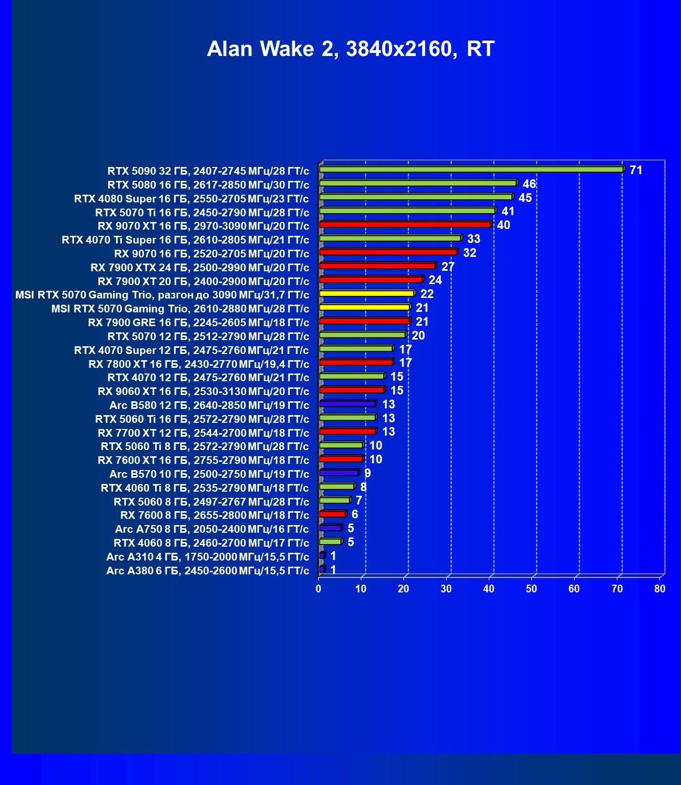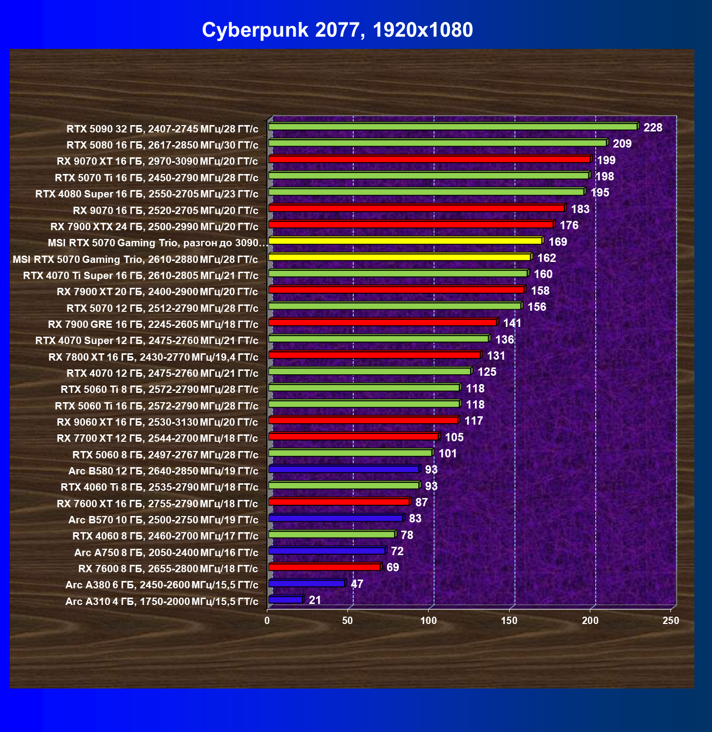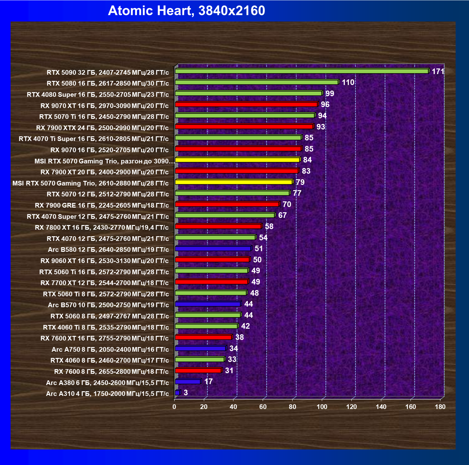| 06 | MSI RTX 5070 Gaming Trio, 2610—2880 МГц/28 ГТ/с | 5007 | 821 | 61 000 |