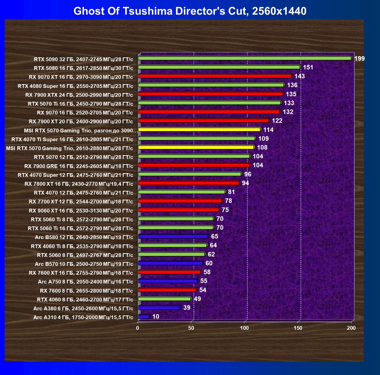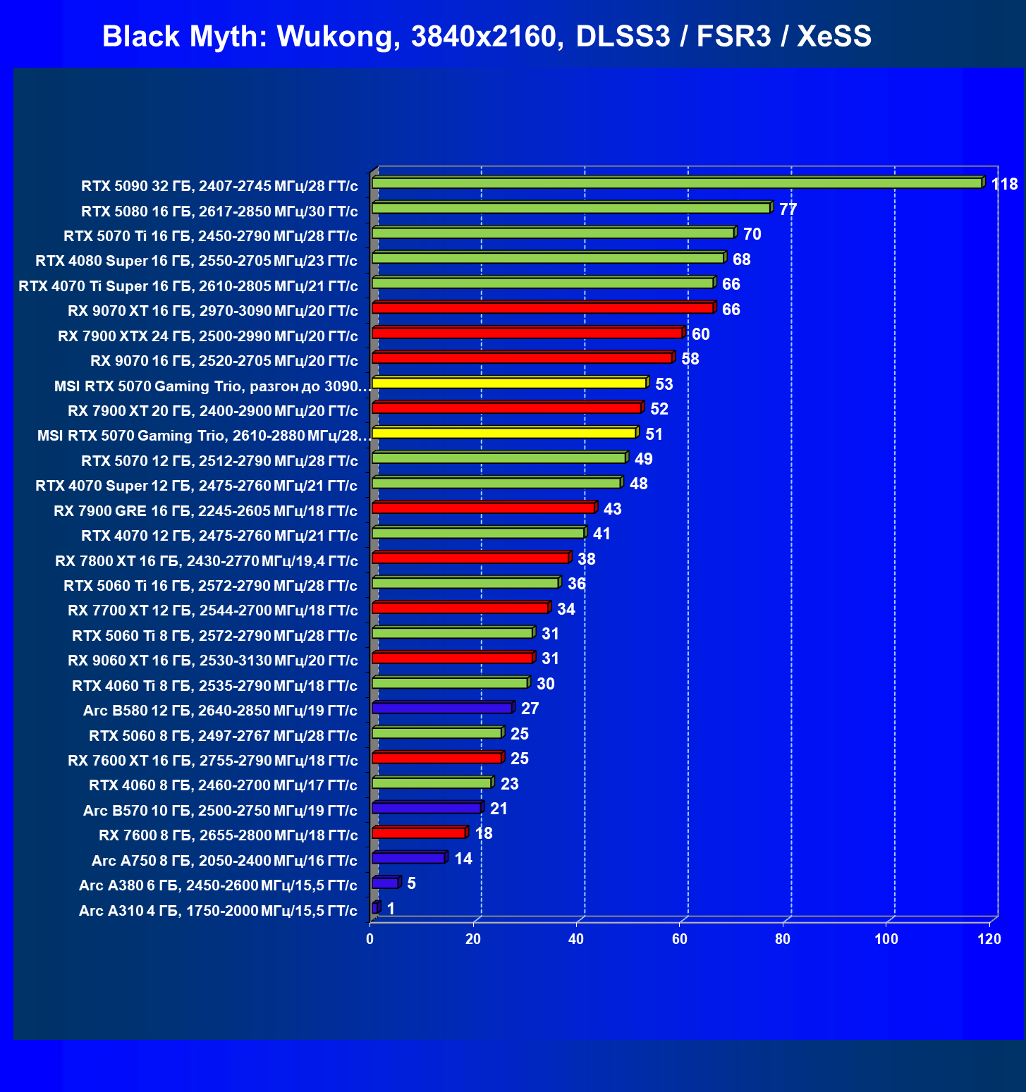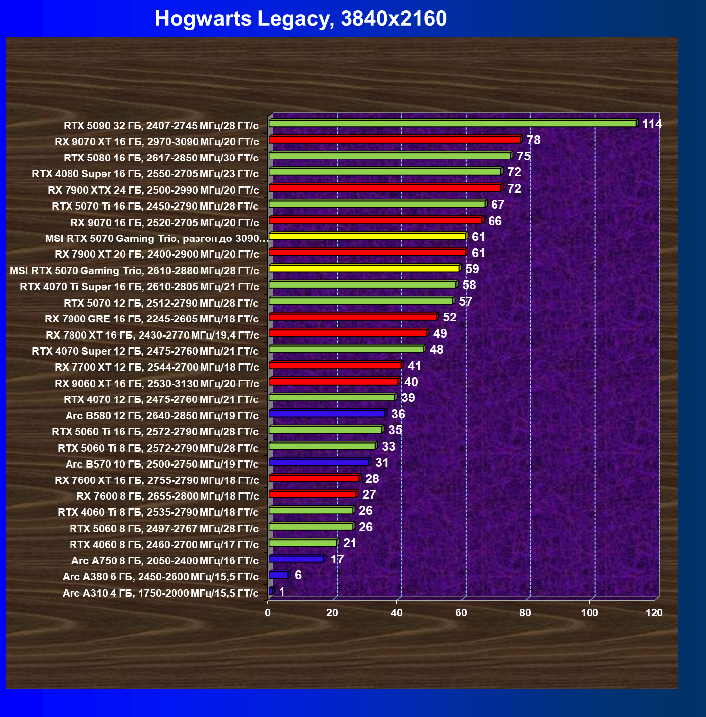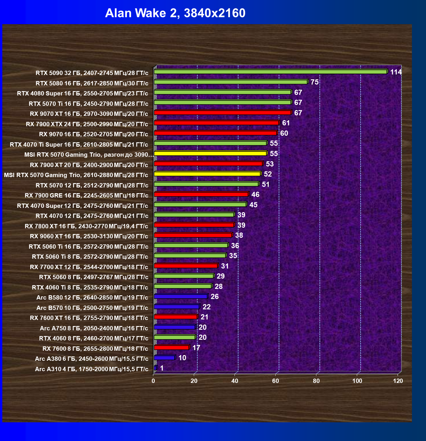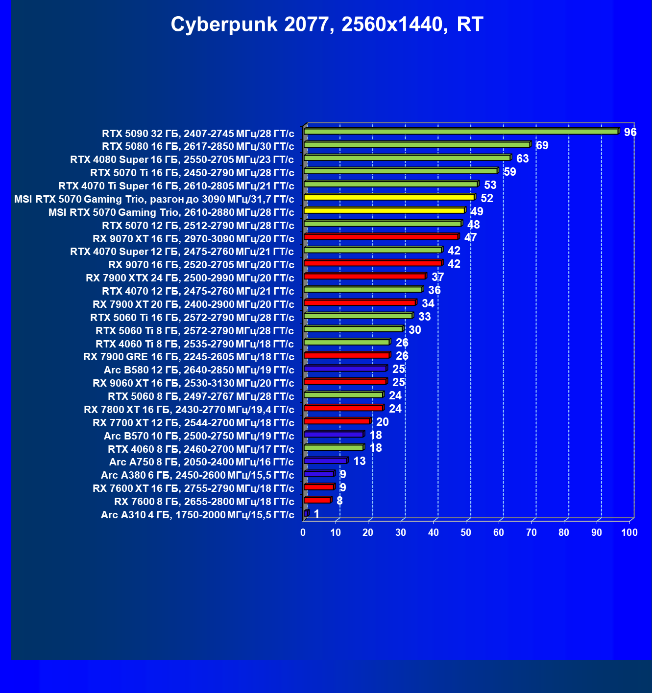 | 06 | MSI RTX 5070 Gaming Trio, 2610—2880 МГц/28 ГТ/с | 5007 | 821 | 61 000 |