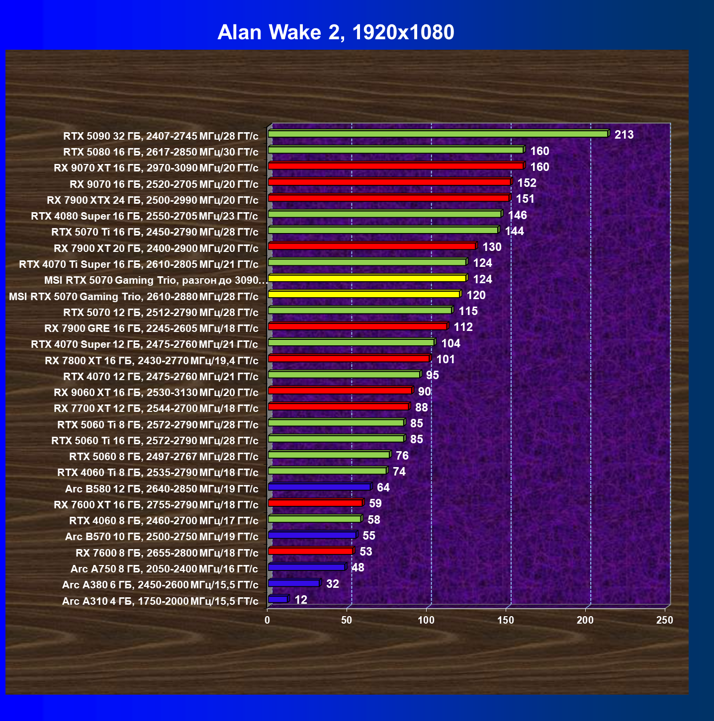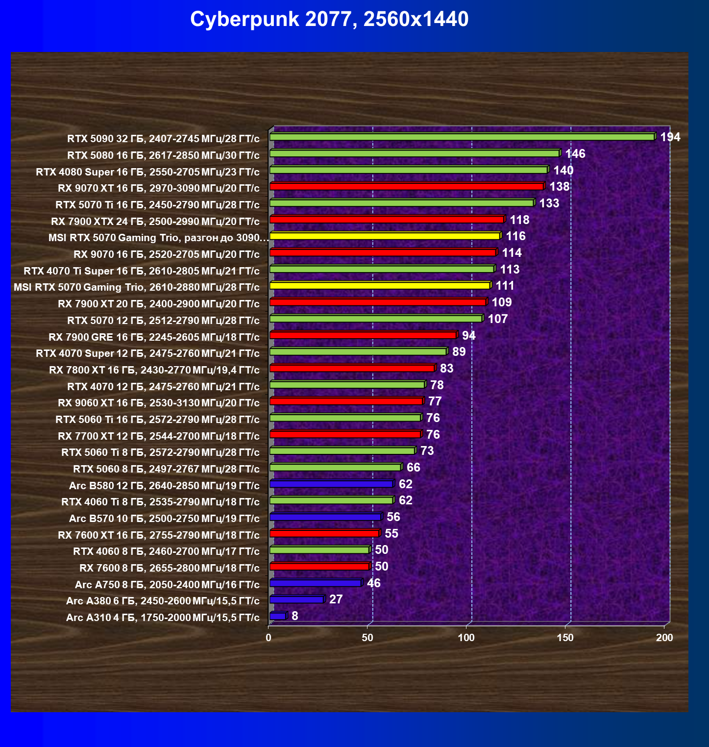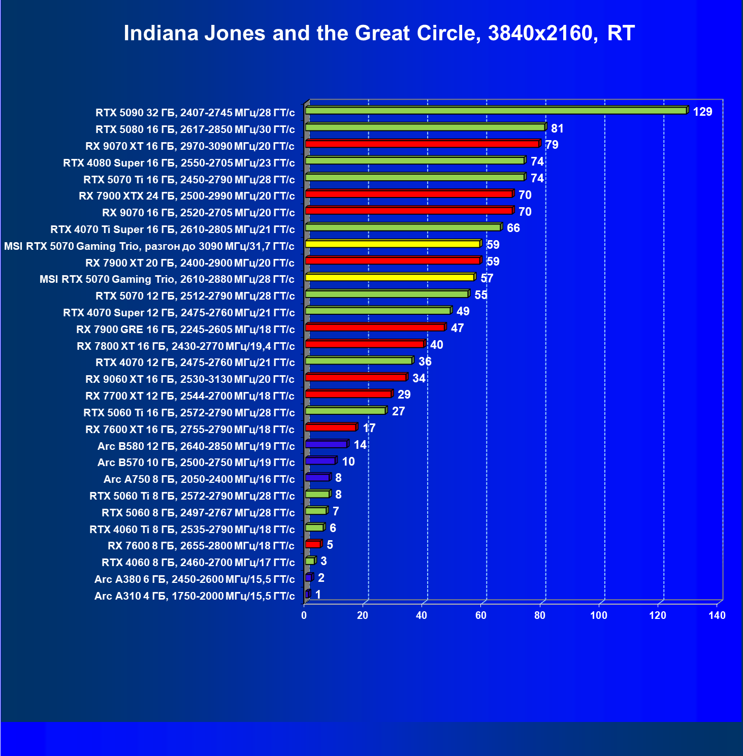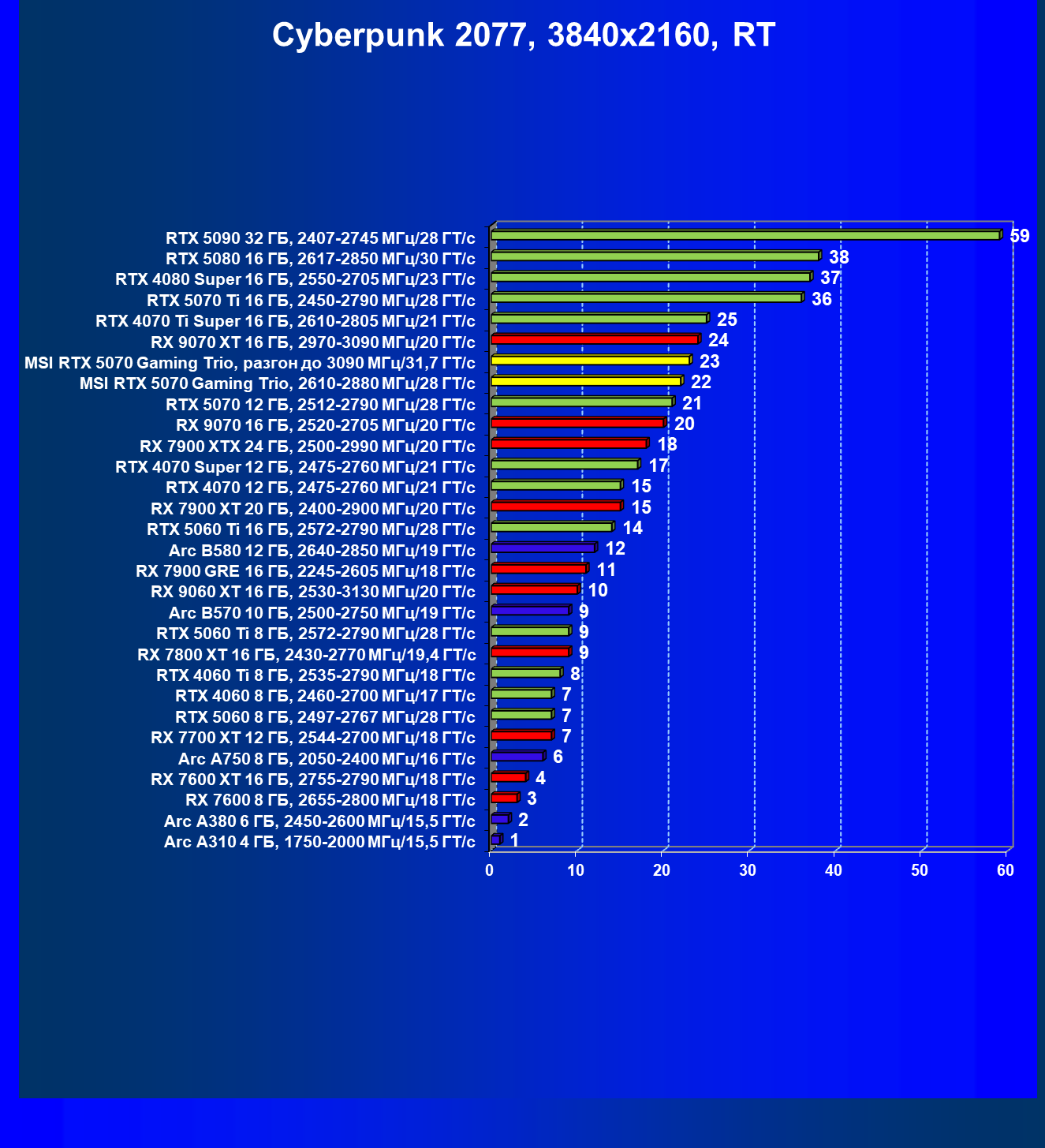 | 06 | MSI RTX 5070 Gaming Trio, 2610—2880 МГц/28 ГТ/с | 5007 | 821 | 61 000 |
