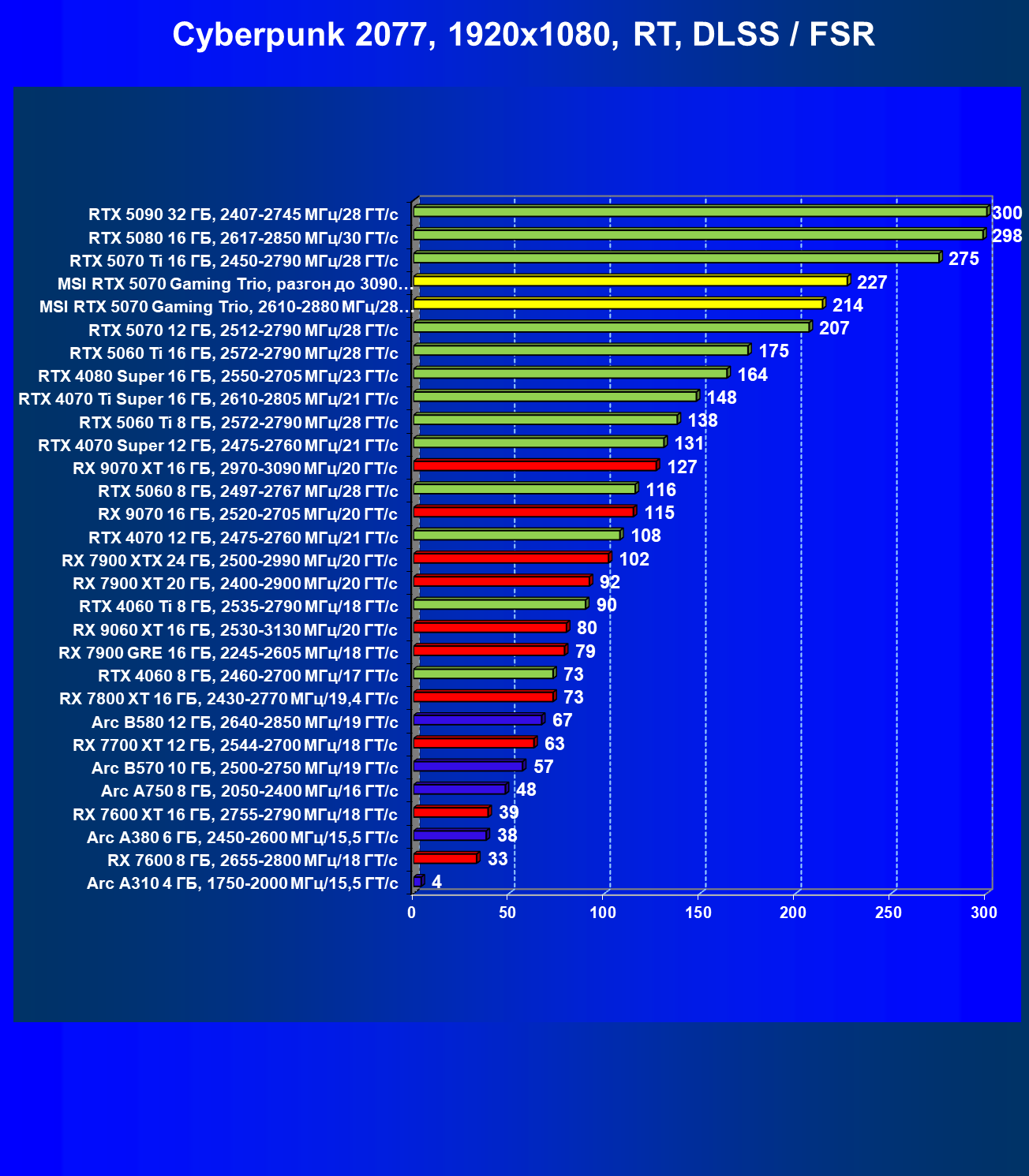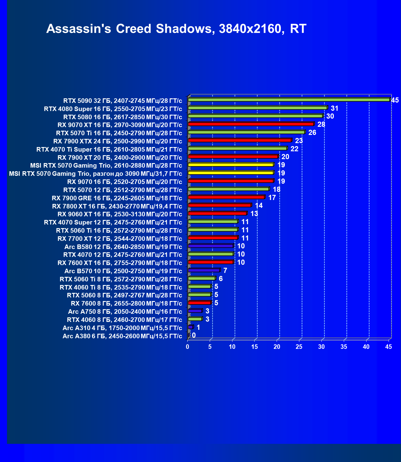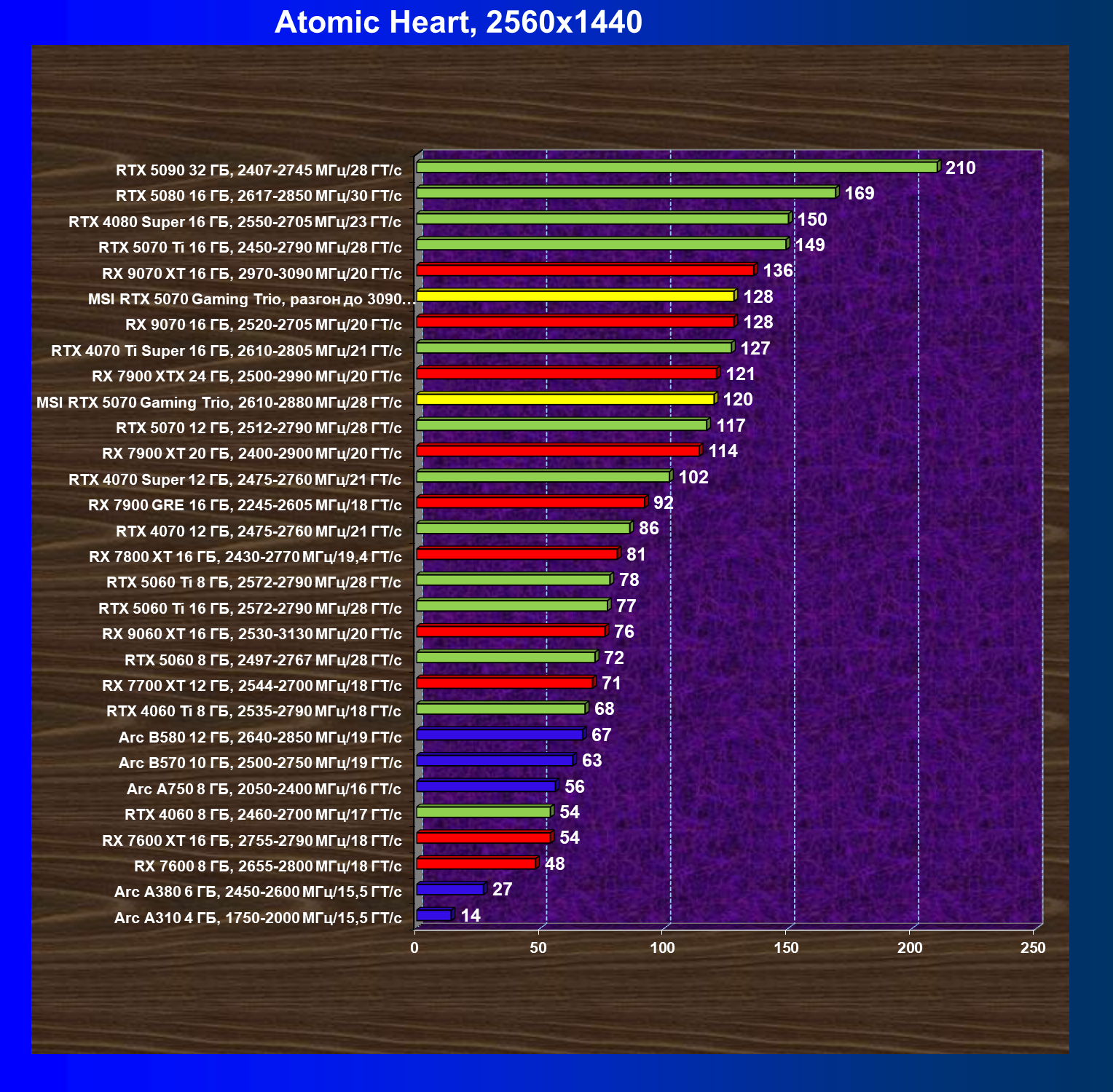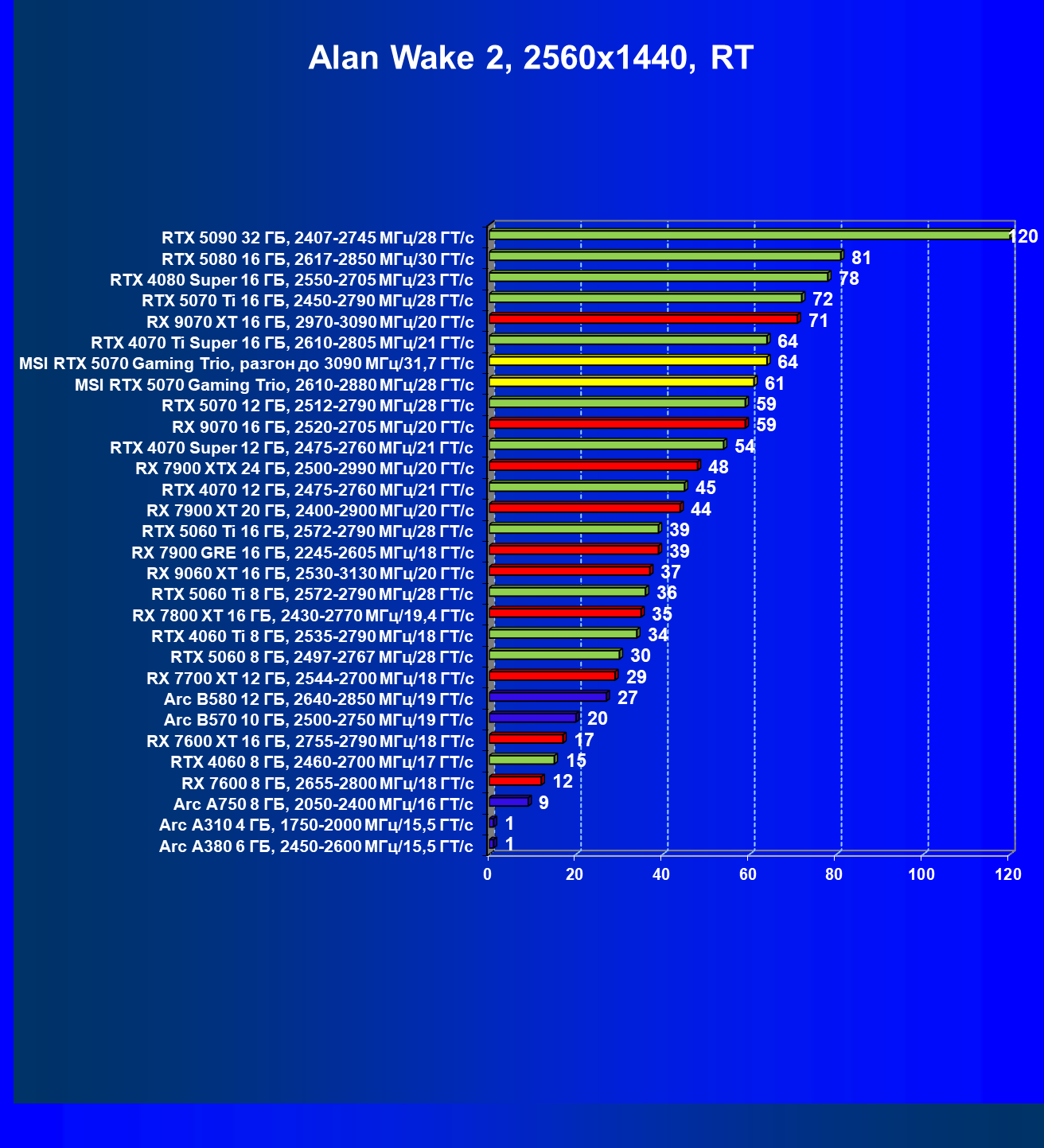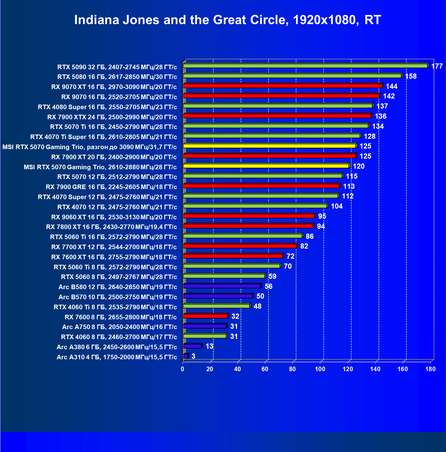 | 06 | MSI RTX 5070 Gaming Trio, 2610—2880 МГц/28 ГТ/с | 5007 | 821 | 61 000 |