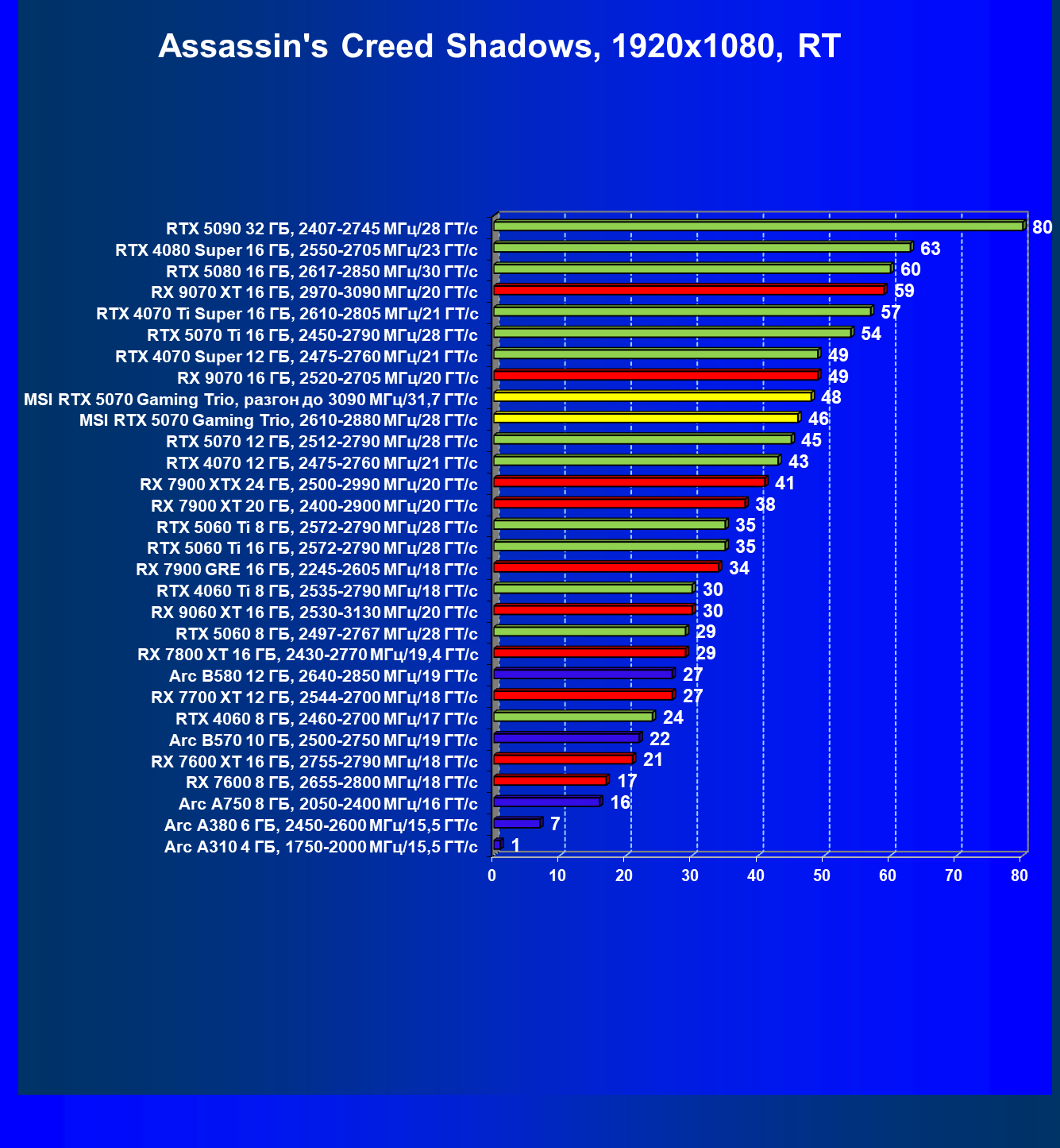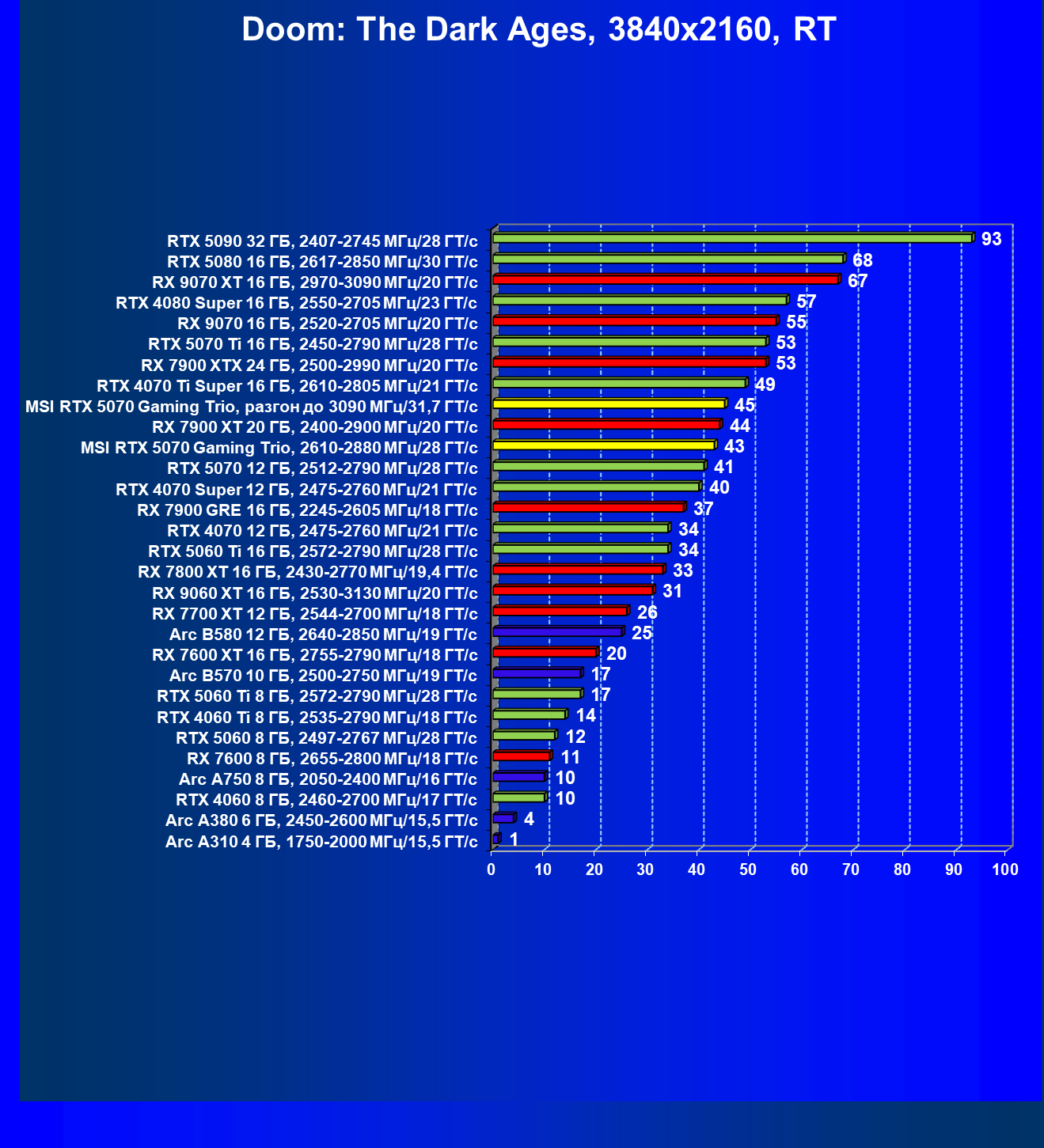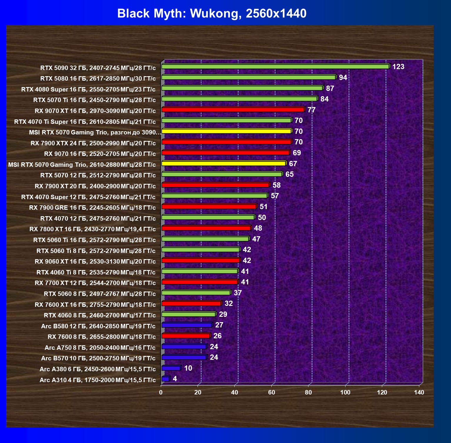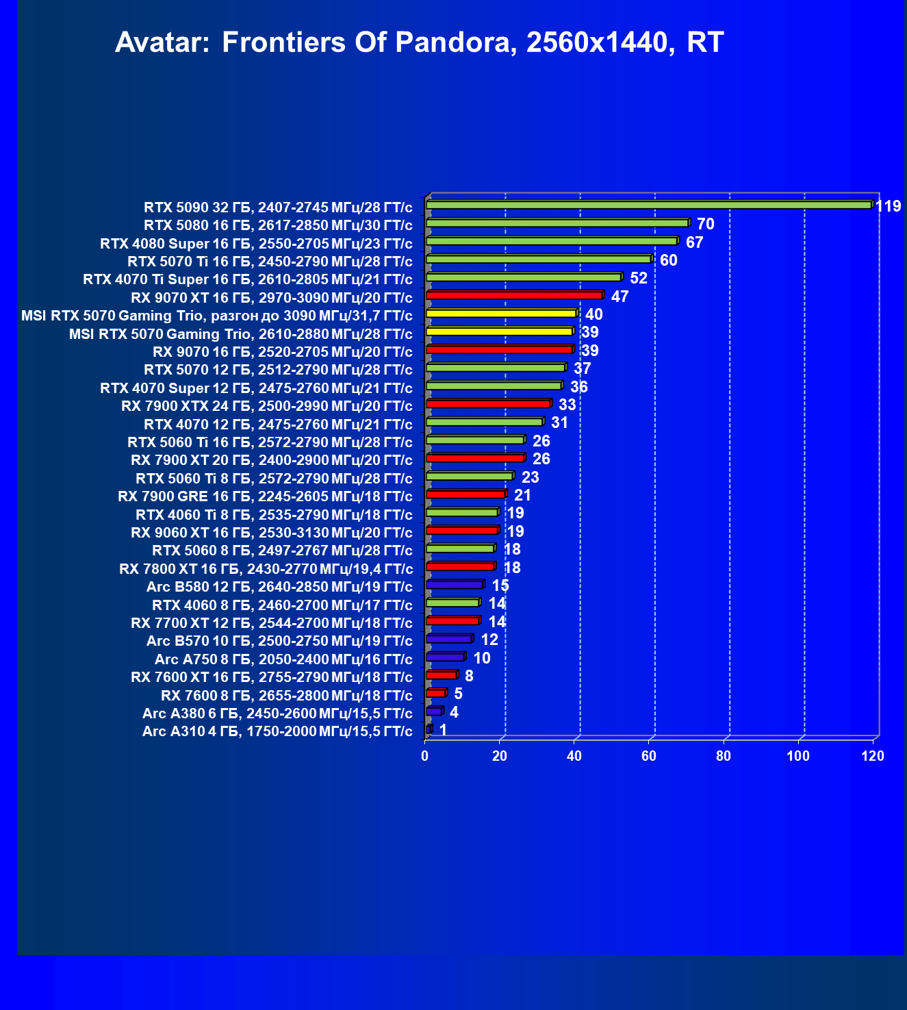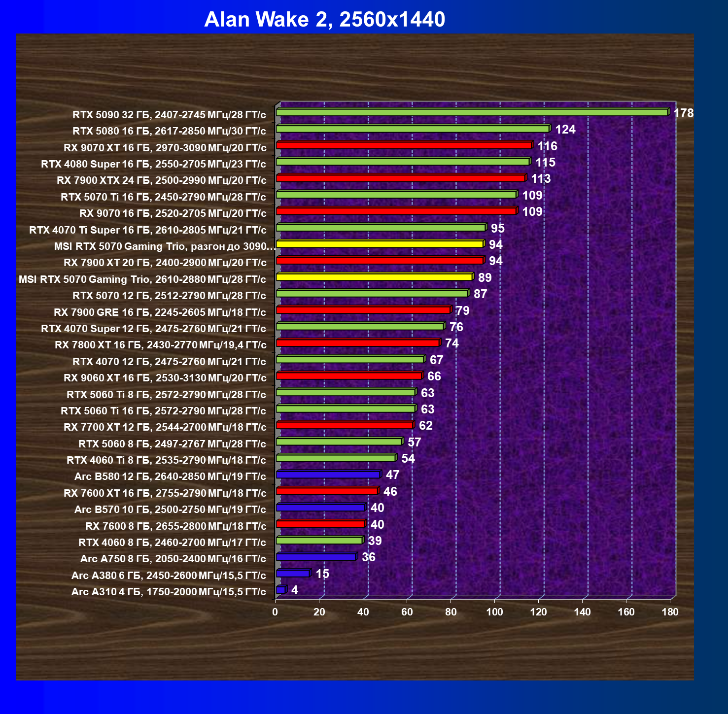 | 06 | MSI RTX 5070 Gaming Trio, 2610—2880 МГц/28 ГТ/с | 5007 | 821 | 61 000 |