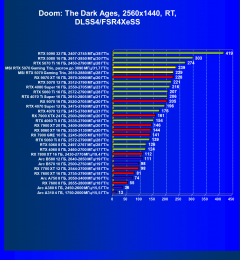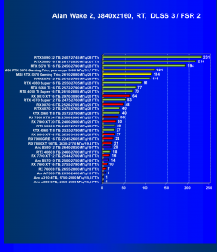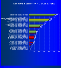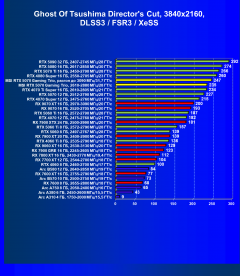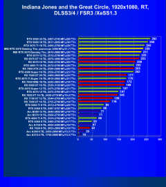 - Результаты тестов со включенной аппаратной трассировкой лучей и/или DLSS/FSR/XeSS в разрешениях 1920×1080, 2560×1440 и 3840×2160