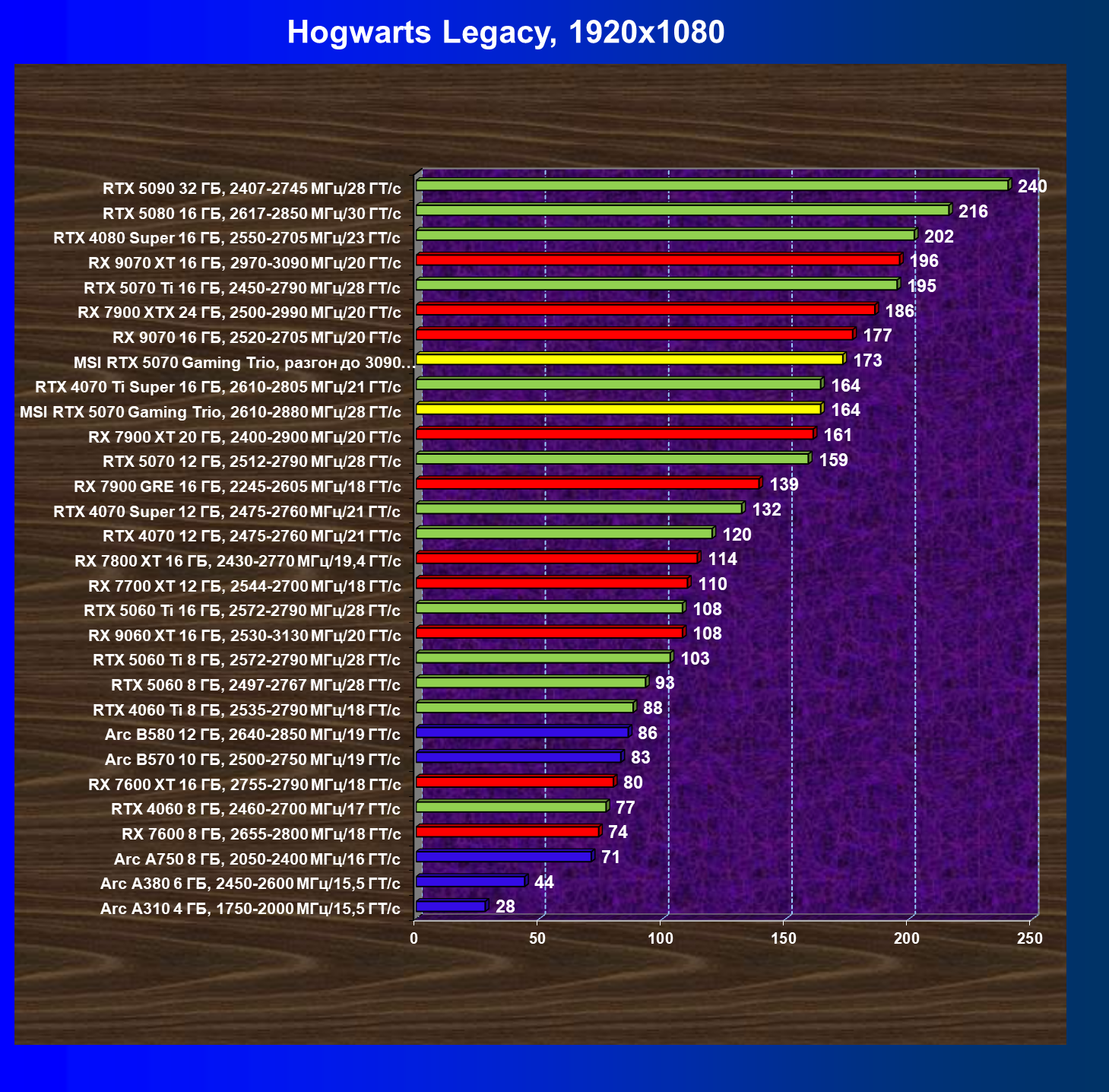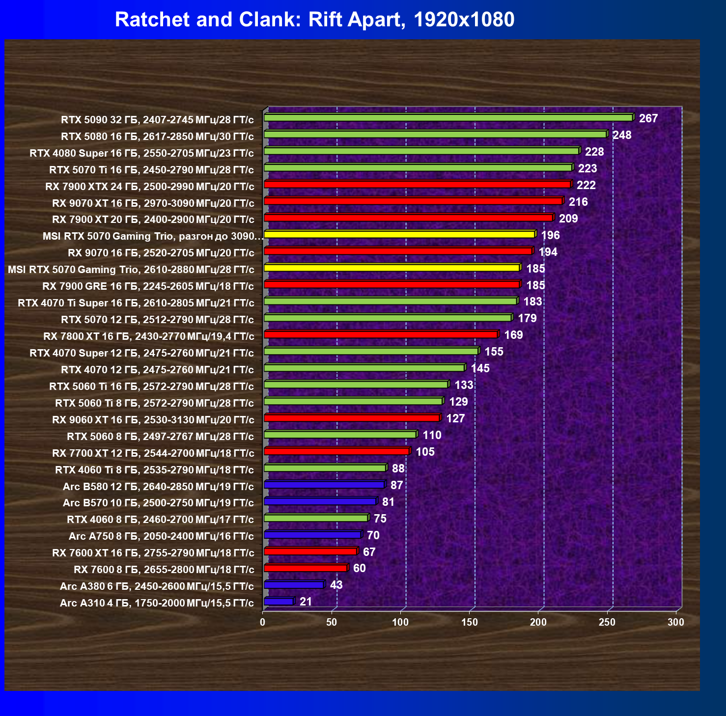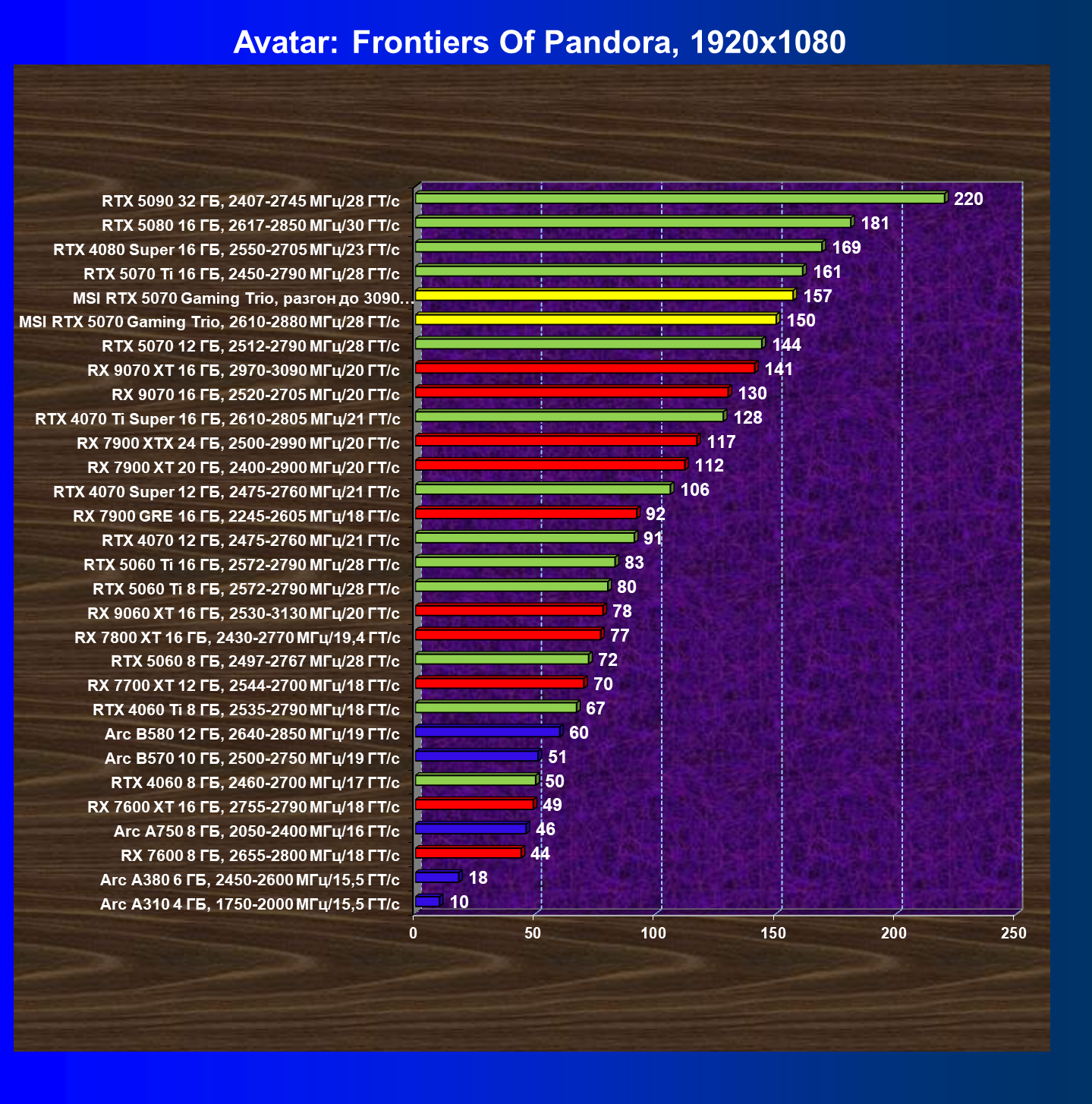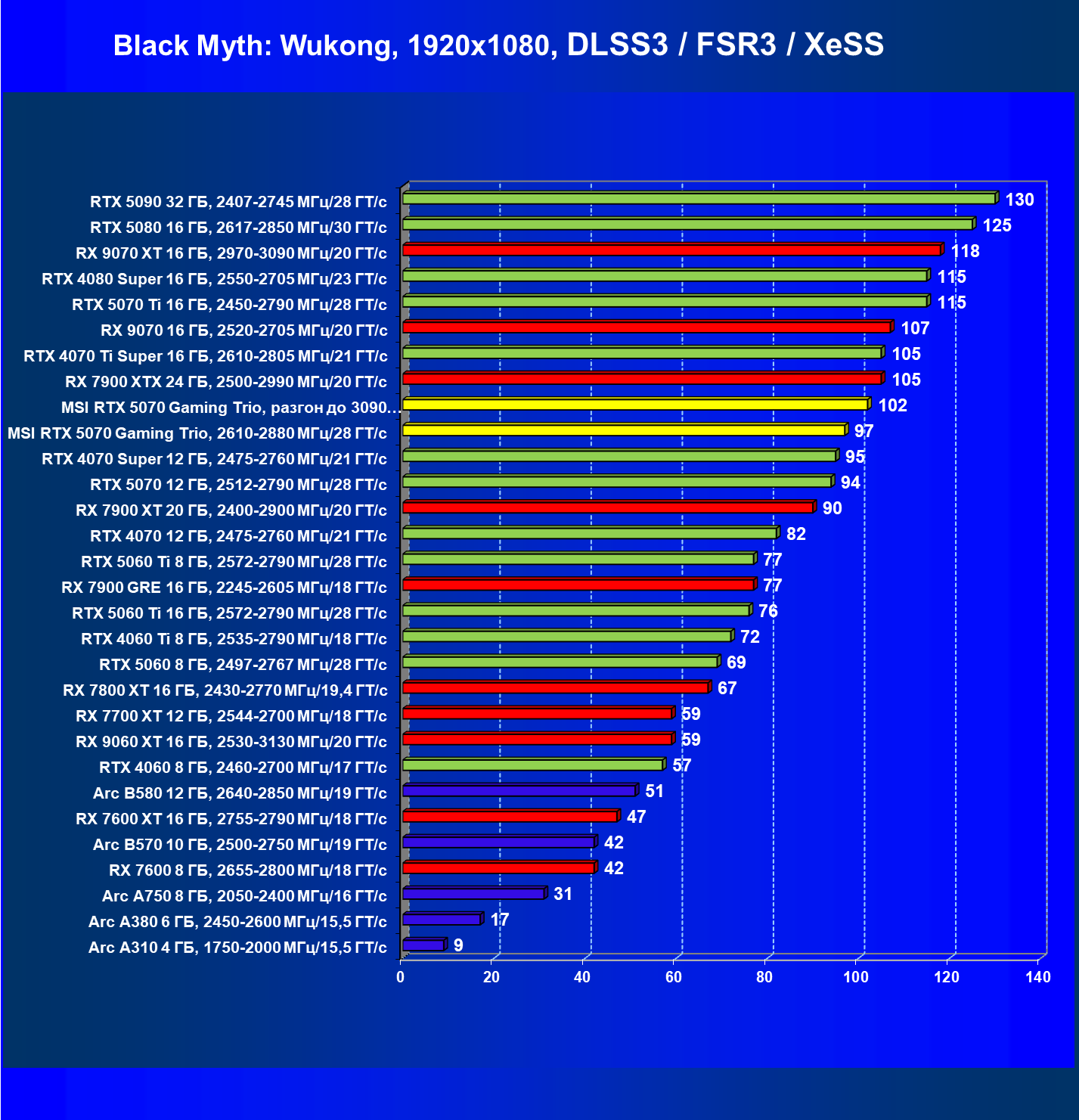 | 10 | MSI RTX 5070 Gaming Trio, 2610—2880 МГц/28 ГТ/с | 1912 | 314 | 61 000 |